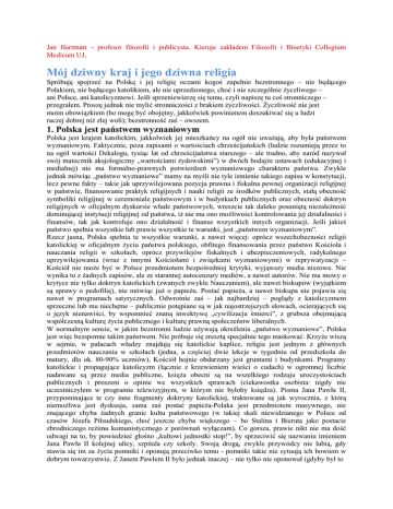 Jan Hartman - profesor filozofii i publicysta. Kieruje zakładem Filozofii i Bioetyki Collegium Medicum UJ, Mój dziwny kraj i jego dziwna religia Spróbuję spojrzeć na Polskę i jej religię oczami kogoś zupełnie bezstronnego – nie będącego Polakiem, nie będącego katolikiem, ale nie uprzedzonego, choć i nie szczególnie życzliwego – ani Polsce, ani katolicyzmowi. Jeśli sprzeniewierzę się temu, czyli napiszę tu coś stronniczego – przegrałem. Proszę jednak nie mylić stronniczości z brakiem życzliwości. Życzliwość nie jest moim obowiązkiem (bo mogę być obojętny, jakkolwiek powinienem doszukiwać się u ludzi raczej dobrej niż złej woli); bezstronność zaś – owszem. 1. Polska jest państwem wyznaniowym Polska jest krajem katolickim, jakkolwiek jej mieszkańcy na ogół nie uważają, aby była państwem wyznaniowym. Faktycznie, poza zapisami o wartościach chrześcijańskich (ludzie rozumieją przez to na ogół wartości Dekalogu, tysiąc lat od chrześcijaństwa starszego – ale trudno, aby naród nazywał swój matecznik aksjologiczny „wartościami żydowskimi”) w dwóch bodajże ustawach (edukacyjnej i medialnej) nie ma formalno-prawnych potwierdzeń wyznaniowego charakteru państwa. Zwykle jednak mówiąc „państwo wyznaniowe” mamy na myśli nie tyle istnienie takiego zapisu w konstytucji, lecz pewne fakty – takie jak uprzywilejowana pozycja prawna i fiskalna pewnej organizacji religijnej w państwie, finansowanie praktyk religijnych i nauki religii ze środków publicznych, stałą obecność symboliki religijnej w ceremoniale państwowym i w budynkach publicznych oraz obecność doktryn religijnych w oficjalnym dyskursie władz państwowych, wreszcie tak daleko posuniętą niezależność dominującej instytucji religijnej od państwa, iż nie ma ono możliwości kontrolowania jej działalności i finansów, tak jak kontroluje ono działalność i finanse wszystkich innych organizacji. Jeśli jakieś państwo spełnia wszystkie lub prawie wszystkie te warunki, jest „państwem wyznaniowym”. Rzecz jasna, Polska spełnia te wszystkie warunki, a nawet więcej: oprócz wszechobecności religii katolickiej w oficjalnym życiu państwa polskiego, obfitego finansowania przez państwo Kościoła i nauczania religii w szkołach, oprócz przywilejów fiskalnych i ubezpieczeniowych, radykalnego uprzywilejowania (wraz z innymi Kościołami i związkami wyznaniowymi) w reprywatyzacji – Kościół nie może być w Polsce przedmiotem bezpośredniej krytyki, wyjąwszy media niszowe. Nie wynika to z żadnych zapisów, ale ze starannej autocenzury mediów, a nawet autorów. Nie ma mowy o krytyce nie tylko doktryn katolickich (zwanych zwykle Nauczaniem), ale nawet biskupów (wyjątkiem są sprawy o pedofilię), nie mówiąc już o papieżu. Postać papieża, a nawet biskupa nie pojawia się nawet w programach satyrycznych. Odwrotnie zaś – jak najbardziej – poglądy z katolicyzmem sprzeczne lub mu niechętne – publicznie potępiane są w jak najostrzejszych słowach, ocierających się o język nienawiści, by wspomnieć znaną inwektywę „cywilizacja śmierci”, z grubsza obejmującą współczesną kulturę życia publicznego i kulturę prawną społeczeństw liberalnych. W normalnym sensie, w jakim bezstronni ludzie używają określenia „państwo wyznaniowe”, Polska jest więc bezspornie takim państwem. Nie próbuje się zresztą specjalnie tego maskować. Krzyże wiszą w sejmie, w pałacach władzy znajdują się katolickie kaplice, religia jest jednym z głównych przedmiotów nauczania w szkołach (jedna, a częściej dwie lekcje w tygodniu od przedszkola do matury, dla ok. 80-90% uczniów), Kościół hojnie obdarzany jest gruntami i budynkami. Programy katolickie i propagujące katolicyzm (łącznie z krzewieniem wieści o cudach) w ogromnej liczbie nadawane są przez media publiczne, księża obecni są na wszelkiego rodzaju uroczystościach publicznych i proszeni o opinie we wszystkich sprawach (ciekawostka osobista: nigdy nie uczestniczyłem w programie telewizyjnym, w którym nie byłoby księdza). Pisma Jana Pawła II, przypominające te czy inne fragmenty doktryny katolickiej, traktowane są jak wyrocznia, z którą niemożliwa jest dyskusja, sama zaś postać papieża-Polaka jest przedmiotem masywnego, nie znającego chyba żadnych granic kultu państwowego (w takiej skali niewidzianego w Polsce od czasów Józefa Piłsudskiego, choć jeszcze chyba większego – bo Stalina i Bieruta jako postacie zbrodniczego reżimu komunistycznego z porównań wyłączam). Co gorsza, prawie nikt nie ma dość odwagi na to, by powiedzieć głośno „kultowi jednostki stop!”, by sprzeciwić się nazwaniu imieniem Jana Pawła II kolejnej ulicy, szpitala czy szkoły. Swoją drogą, zwykle przywódcy nie lubią, gdy stawia się im za życia pomniki i oponują przeciwko temu - pomniki takie nie sytuują ich bowiem w dobrym towarzystwie. Z Janem Pawłem II było jednak inaczej – nie tylko nie oponował (gdyby był to uczynił, z pewnością zastosowano by się do jego zalecenia), ale przychylnie patrzył na rosnący kult swojej osoby. Dla postronnego, nieuprzedzonego obserwatora, nie jest to fakt zachęcający do katolicyzmu ani budzący szacunek. Warto pamiętać, że gdy w XVI wieku zaczęto stawiać pomniki żyjącym papieżom, stało się to jedną z pobudek dla ruchu reformacji. Trzeba przyznać w tym miejscu, że skrajnym przejawem ustroju państwa wyznaniowego jest istotny udział instytucji religijnej w stanowieniu prawa oraz w codziennym życiu politycznym, co w Polsce nie jest rutyną. Pomijając tu kwestię statusu prawa kanonicznego na terenie RP, o czym będzie jeszcze mowa, można wręcz powiedzieć, że w Polsce udział ten ograniczony jest tylko do kwestii bezpośrednio interesujących, z takich czy innych powodów, Kościół katolicki. Trudno wszelako wyobrazić sobie, by jakieś życzenie Kościoła w zakresie sta
