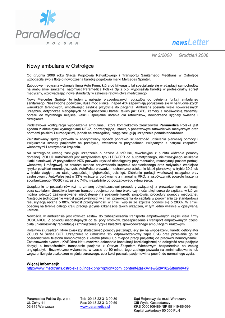 newsLetter Nr 2/2008 Grudzień 2008 Nowy ambulans w Ostrołęce Od grudnia 2008 roku Stacja Pogotowia Ratunkowego i Transportu Sanitarnego Meditrans w Ostrołęce wzbogaciła swoją flotę o nowoczesną karetkę pogotowia marki Mercedes Sprinter. Zabudowę medyczną wykonała firma Auto Form, która od kilkunastu lat specjalizuje się w adaptacji samochodów na ambulanse sanitarne, natomiast Paramedica Polska Sp z o.o. wyposażyła karetkę w profesjonalny sprzęt medyczny, wprowadzając nowe standardy w zakresie ratownictwa medycznego. Nowy Mercedes Sprinter to jeden z najlepiej przygotowanych pojazdów do pełnienia funkcji ambulansu sanitarnego. Niezawodne podwozie, duża moc silnika i napęd 4x4 zapewniają poruszanie się w najtrudniejszych warunkach terenowych, umożliwiając szybkie przybycie do pacjenta. Ambulans posiada wiele nowoczesnych urządzeń, dotychczas niebędących na wyposażeniu karetki takich jak: GPS, kamery z możliwością transmisji obrazu do wybranego miejsca, kaski i specjalne ubrania dla ratowników, nowoczesne sygnały świetlne i dźwiękowe. Podstawowa konfiguracja wyposażenia ambulansu, którą kompleksowo zrealizowała Paramedica Polska jest zgodna z aktualnymi wymaganiami NFOZ, obowiązującą ustawą o państwowym ratownictwie medycznym oraz normami polskimi i europejskimi, jednak na szczególną uwagę zasługują urządzenia ponadstandardowe. Zainstalowany sprzęt pozwala w zdecydowany sposób poprawić skuteczność udzielania pierwszej pomocy i zwiększenia szansy pacjentów na przeżycie, zwłaszcza w przypadkach związanych z ostrymi zespołami wieńcowymi i zatrzymania krążenia. Na szczególną uwagę zasługuje urządzenie o nazwie AutoPulse, rewolucyjne z punktu widzenia pomocy doraźnej. ZOLL® AutoPulse® jest urządzeniem typu LDB-CPR do automatycznego, nieinwazyjnego uciskania klatki piersiowej. W przypadkach NZK pozwala uzyskać nieosiągalny przy manualnej resuscytacji poziom perfuzji wieńcowej i mózgowej, co stwarza szanse przywrócenia krążenia spontanicznego oraz radykalnie zmniejsza ryzyko powikłań neurologicznych. AutoPulse prowadzi mechaniczne uciskanie klatki piersiowej w trybie 30:2 lub w trybie ciągłym, ze stałą częstością i głębokością uciśnięć. Ciśnienie perfuzji wieńcowej osiągalne przy zastosowaniu AutoPulse jest o 33% wyższe w porównaniu z manualną RKO, a współczynnik powrotu krążenia spontanicznego (ROSC) wzrasta o 74%, niezależnie od początkowego rytmu serca. Urządzenie to pozwala również na zmianę dotychczasowej procedury związanej z prowadzeniem reanimacji poza szpitalem. Umożliwia bowiem transport pacjenta pomimo braku czynności akcji serca do szpitala, w którym można wdrożyć zaawansowane, niedostępne na poziomie karetki pogotowia, procedury pomocy medycznej. Następuje jednocześnie wzrost przeżywalności w chwili przewiezienia do szpitala w porównaniu ze standardową resuscytacją ręczną o 88%. Wzrost przeżywalności w chwili wypisu ze szpitala podnosi się o 283%. W chwili obecnej na terenie całego kraju pracuje jedynie kilkanaście takich urządzeń, w tym jedno właśnie w opisywanej karetce. Nowością w ambulansie jest również zestaw do zabezpieczenia transportu amputowanych części ciała firmy BOSCAROL. Z powodu niedostępnych do tej pory środków, zabezpieczenie i transport amputowanych części ciała uniemożliwiały replantację i zmniejszenie ryzyka kalectwa spowodowanego amputacjami urazowymi. Kolejnym z urządzeń, które zwiększy skuteczność pomocy jest znajdujący się na wyposażeniu karetki defibrylator ZOLL® M Series CCT. Urządzenie to umożliwia 12- odprowadzeniowy zapis EKG oraz przesłanie go za pośrednictwem telefonu komórkowego z karetki (domu lub miejsca pracy pacjenta) do pracowni hemodynamiki. Zastosowanie systemu KARDIAa-Net umożliwia dokonanie konsultacji kardiologicznej na odległość oraz podjęcie decyzji o bezpośrednim transporcie pacjenta z Ostrym Zespołem Wieńcowym bezpośrednio na zabieg angioplastyki. Bezzwłoczne wykonanie, w czasie do 90 minut, tego zabiegu pozwala na zminimalizowanie lub wręcz uniknięcie uszkodzeń mięśnia sercowego, co z kolei pozwala pacjentowi na powrót do normalnego życia. Więcej informacji: http://www.meditrans.ostroleka.pl/index.php?option=com_content&task=view&id=182&Itemid=49 Paramedica Polska Sp. z o.o. Ul. Żołny 11 02-815 Warszawa Tel: 00 48 22 313 09 39 Fax: 00 48 22 313 09 59 www.paramedica.pl Sąd Rejonowy dla m.st. Warszawy XIII Wydz. Gospodarczy KRS 0000106489 NIP 951-19-86-099 Kapitał zakładowy 50 000 PLN