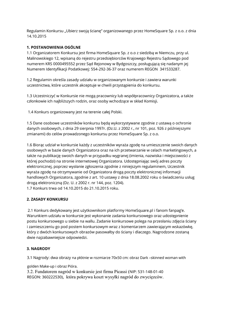 Regulamin Konkursu „Ubierz swoją ścianę” organizowanego przez HomeSquare Sp. z o.o. z dnia 14.10.2015 1. POSTANOWIENIA OGÓLNE 1.1 Organizatorem Konkursu jest firma HomeSquare Sp. z o.o z siedzibą w Niemczu, przy ul. Malinowskiego 12, wpisaną do rejestru przedsiębiorców Krajowego Rejestru Sądowego pod numerem KRS 0000495552 przez Sąd Rejonowy w Bydgoszczy, posługującą się nadanym jej Numerem Identyfikacji Podatkowej: 554-292-36-37 oraz numerem REGON 341533287. 1.2 Regulamin określa zasady udziału w organizowanym konkursie i zawiera warunki uczestnictwa, które uczestnik akceptuje w chwili przystąpienia do konkursu. 1.3 Uczestniczyć w Konkursie nie mogą pracownicy lub współpracownicy Organizatora, a także członkowie ich najbliższych rodzin, oraz osoby wchodzące w skład Komisji. 1.4 Konkurs organizowany jest na terenie całej Polski. 1.5 Dane osobowe uczestników konkursu będą wykorzystywane zgodnie z ustawą o ochronie danych osobowych, z dnia 29 sierpnia 1997r. (Dz.U. z 2002 r., nr 101, poz. 926 z późniejszymi zmianami) do celów prowadzonego konkursu przez HomeSquare Sp. z o.o. 1.6 Biorąc udział w konkursie każdy z uczestników wyraża zgodę na umieszczenie swoich danych osobowych w bazie danych Organizatora oraz na ich przetwarzanie w celach marketingowych, a także na publikację swoich danych w przypadku wygranej (imienia, nazwiska i miejscowości z której pochodzi) na stronie internetowej Organizatora. Udostępniając swój adres poczty elektronicznej, poprzez wysłanie zgłoszenia zgodnie z niniejszym regulaminem, Uczestnik wyraża zgodę na otrzymywanie od Organizatora drogą poczty elektronicznej informacji handlowych Organizatora, zgodnie z art. 10 ustawy z dnia 18.08.2002 roku o świadczeniu usług drogą elektroniczną (Dz. U. z 2002 r. nr 144, poz. 1204). 1.7 Konkurs trwa od 14.10.2015 do 21.10.2015 roku. 2. ZASADY KONKURSU 2.1 Konkurs dedykowany jest użytkownikom platformy HomeSquare.pl i fanom fanpag’e. Warunkiem udziału w konkursie jest wykonanie zadania konkursowego oraz udostępnienie postu konkursowego u siebie na wallu. Zadanie konkursowe polega na przesłaniu zdjęcia ściany i zamieszczeniu go pod postem konkursowym wraz z komentarzem zawierającym wskazówkę, który z dwóch konkursowych obrazów pasowałby do ściany i dlaczego. Nagrodzone zostaną dwie najzabawniejsze odpowiedzi. 3. NAGRODY 3.1 Nagrody: dwa obrazy na płótnie w rozmiarze 70x50 cm: obraz Dark –skinned woman with golden Make-up i obraz Pióra. 3.2. Fundatorem nagród w konkursie jest firma Picassi (NIP: 531-148-01-40 REGON: 360222530), która pokrywa koszt wysyłki nagród do zwycięzców. 3.3. Nagroda nie może być wymieniona na ekwiwalent pieniężny lub inny rzeczowy. 4. ZASADY PRZEPROWADZENIA KONKURSU Zwycięzcy konkursu zostaną wybrani przez firmę HomeSquare Sp. z o.o. spośród osób, które dodały pod postem zdjęcie ściany i napisały komentarz. W komentarzu liczy się oryginalne ujęcie tematu. 5. OGŁASZANIE WYNIKÓW 5.1 Zwycięzcy zostaną powiadomieni o wygranej za pośrednictwem wiadomości e-mail, nie później niż 7 dni po zakończeniu konkursu. 5.2 Dane zwycięzców zostaną opublikowane na stronie https://www.homesquare.pl/ nie później niż 7 dni po zakończeniu konkursu. Jako dane zwycięzców rozumie się: imię, nazwisko oraz miejscowość. 6. POSTANOWIENIA KOŃCOWE 6.1 Wszelkie sprawy wynikłe z tytułu wzajemnych zobowiązań związanych z Konkursem będą rozstrzygane przez właściwy rzeczowo sąd powszechny w Bydgoszczy. 6.2 Konkurs nie podlega przepisom ustawy o grach i zakładach wzajemnych ani nie jest loterią promocyjną w rozumieniu ustawy z dnia 29 lipca 1992 r. o grach losowych i zakładach wzajemnych. 6.3 Wzięcie udziału w konkursie oznacza zgodę Uczestnika na warunki konkursu określone w niniejszym Regulaminie. 6.4 W sprawach nieuregulowanych niniejszym regulaminie będą miały zastosowanie przepisy kodeksu cywilnego.