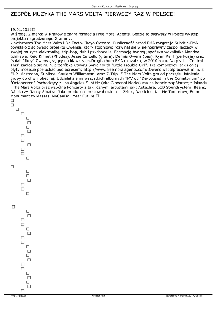 Gigs.pl - Koncerty :: Festiwale :: Imprezy ZESPÓŁ MUZYKA THE MARS VOLTA PIERWSZY RAZ W POLSCE! 19.01.2011 W środę, 2 marca w Krakowie zagra formacja Free Moral Agents. Będzie to pierwszy w Polsce występ projektu nagrodzonego Grammy, klawiszowca The Mars Volta i De Facto, Ikeya Owensa. Publiczność przed FMA rozgrzeje Subtitle.FMA powstało z solowego projektu Owensa, który stopniowo rozwinął się w pełnoprawny zespół łączący w swojej muzyce elektronikę, trip-hop, dub i psychodelię. Formację tworzą japońska wokalistka Mendee Ichikawa, Reid Kinnet (Rhodes), Jesse Carzello (gitara), Dennis Owens (bas), Ryan Reiff (perkusja) oraz Isaiah "Ikey" Owens grający na klawiszach.Drugi album FMA ukazał się w 2010 roku. Na płycie "Control This" znalazła się m.in. przeróbka utworu Sonic Youth "Little Trouble Girl". Tej kompozycji, jak i całej płyty możecie posłuchać pod adresem: http://www.freemoralagents.com/.Owens współpracował m.in. z El-P, Mastodon, Sublime, Saulem Williamsem, oraz Z-Trip. Z The Mars Volta gra od początku istnienia grupy do chwili obecnej. Udzielał się na wszystkich albumach TMV od "De-Loused in the Comatorium" po "Octahedron".Pochodzący z Los Angeles Subtitle (aka Giovanni Marks) ma na koncie współpracę z Islands i The Mars Volta oraz wspólne koncerty z tak różnymi artystami jak: Autechre, LCD Soundsystem, Beans, Dälek czy Nancy Sinatra. Jako producent pracował m.in. dla 2Mex, Daedelus, Kill Me Tomorrow, From Monument to Masses, NoCanDo i Year Future. http://gigs.pl Kreator PDF Utworzono 4 March, 2017, 05:54 Gigs.pl - Koncerty :: Festiwale :: Imprezy http://gigs.pl Kreator PDF Utworzono 4 March, 2017, 05:54