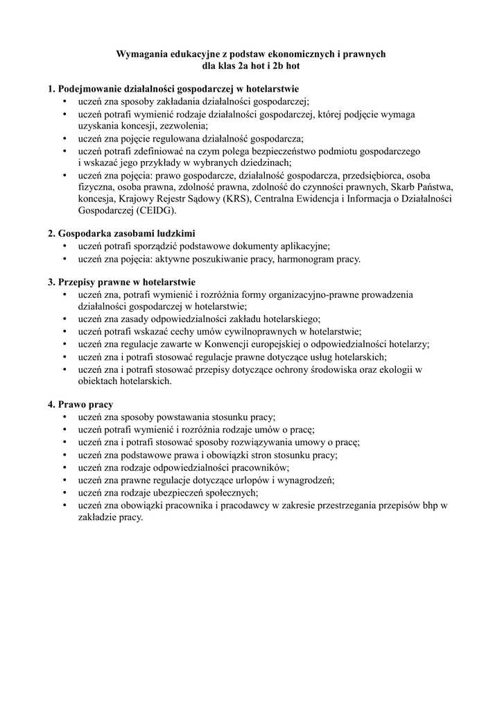 Wymagania edukacyjne z podstaw ekonomicznych i prawnych dla klas 2a hot i 2b hot 1. Podejmowanie działalności gospodarczej w hotelarstwie • uczeń zna sposoby zakładania działalności gospodarczej; • uczeń potrafi wymienić rodzaje działalności gospodarczej, której podjęcie wymaga uzyskania koncesji, zezwolenia; • uczeń zna pojęcie regulowana działalność gospodarcza; • uczeń potrafi zdefiniować na czym polega bezpieczeństwo podmiotu gospodarczego i wskazać jego przykłady w wybranych dziedzinach; • uczeń zna pojęcia: prawo gospodarcze, działalność gospodarcza, przedsiębiorca, osoba fizyczna, osoba prawna, zdolność prawna, zdolność do czynności prawnych, Skarb Państwa, koncesja, Krajowy Rejestr Sądowy (KRS), Centralna Ewidencja i Informacja o Działalności Gospodarczej (CEIDG). 2. Gospodarka zasobami ludzkimi • uczeń potrafi sporządzić podstawowe dokumenty aplikacyjne; • uczeń zna pojęcia: aktywne poszukiwanie pracy, harmonogram pracy. 3. Przepisy prawne w hotelarstwie • uczeń zna, potrafi wymienić i rozróŜnia formy organizacyjno-prawne prowadzenia działalności gospodarczej w hotelarstwie; • uczeń zna zasady odpowiedzialności zakładu hotelarskiego; • uczeń potrafi wskazać cechy umów cywilnoprawnych w hotelarstwie; • uczeń zna regulacje zawarte w Konwencji europejskiej o odpowiedzialności hotelarzy; • uczeń zna i potrafi stosować regulacje prawne dotyczące usług hotelarskich; • uczeń zna i potrafi stosować przepisy dotyczące ochrony środowiska oraz ekologii w obiektach hotelarskich. 4. Prawo pracy • uczeń zna sposoby powstawania stosunku pracy; • uczeń potrafi wymienić i rozróŜnia rodzaje umów o pracę; • uczeń zna i potrafi stosować sposoby rozwiązywania umowy o pracę; • uczeń zna podstawowe prawa i obowiązki stron stosunku pracy; • uczeń zna rodzaje odpowiedzialności pracowników; • uczeń zna prawne regulacje dotyczące urlopów i wynagrodzeń; • uczeń zna rodzaje ubezpieczeń społecznych; • uczeń zna obowiązki pracownika i pracodawcy w zakresie przestrzegania przepisów bhp w zakładzie pracy.
