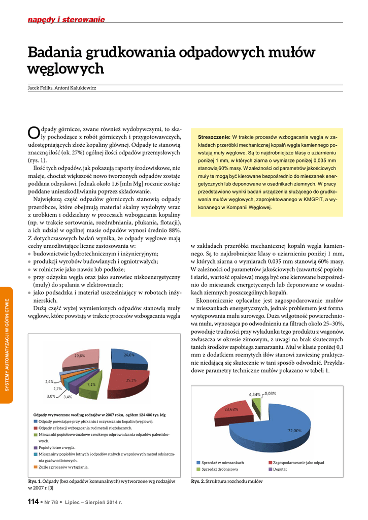Badania grudkowania odpadowych mułów węglowych Jacek Feliks, Antoni Kalukiewicz SYSTEMY AUTOMATYZACJI W GÓRNICTWIE O dpady górnicze, zwane również wydobywczymi, to skały pochodzące z robót górniczych i przygotowawczych, udostępniających złoże kopaliny głównej. Odpady te stanowią znaczną ilość (ok. 27%) ogólnej ilości odpadów przemysłowych (rys. 1). Ilość tych odpadów, jak pokazują raporty środowiskowe, nie maleje, chociaż większość nowo tworzonych odpadów zostaje poddana odzyskowi. Jednak około 1,6 [mln Mg] rocznie zostaje poddane unieszkodliwianiu poprzez składowanie. Największą część odpadów górniczych stanowią odpady przeróbcze, które obejmują materiał skalny wydobyty wraz z urobkiem i oddzielany w procesach wzbogacania kopaliny (np. w trakcie sortowania, rozdrabniania, płukania, flotacji), a ich udział w ogólnej masie odpadów wynosi średnio 88%. Z dotychczasowych badań wynika, że odpady węglowe mają cechy umożliwiające liczne zastosowania w: zz budownictwie hydrotechnicznym i inżynieryjnym; zz produkcji wyrobów budowlanych i ogniotrwałych; zz w rolnictwie jako nawóz lub podłoże; zz przy odzysku węgla oraz jako surowiec niskoenergetyczny (muły) do spalania w elektrowniach; zz jako podsadzka i materiał uszczelniający w robotach inżynierskich. Dużą część wyżej wymienionych odpadów stanowią muły węglowe, które powstają w trakcie procesów wzbogacania węgla Streszczenie: W trakcie procesów wzbogacania węgla w zakładach przeróbki mechanicznej kopalń węgla kamiennego powstają muły węglowe. Są to najdrobniejsze klasy o uziarnieniu poniżej 1 mm, w których ziarna o wymiarze poniżej 0,035 mm stanowią 60% masy. W zależności od parametrów jakościowych muły te mogą być kierowane bezpośrednio do mieszanek energetycznych lub deponowane w osadnikach ziemnych. W pracy przedstawiono wyniki badań urządzenia służącego do grudkowania mułów węglowych, zaprojektowanego w KMGPiT, a wykonanego w Kompanii Węglowej. w zakładach przeróbki mechanicznej kopalń węgla kamiennego. Są to najdrobniejsze klasy o uziarnieniu poniżej 1 mm, w których ziarna o wymiarach 0,035 mm stanowią 60% masy. W zależności od parametrów jakościowych (zawartość popiołu i siarki, wartość opałowa) mogą być one kierowane bezpośrednio do mieszanek energetycznych lub deponowane w osadnikach ziemnych poszczególnych kopalń. Ekonomicznie opłacalne jest zagospodarowanie mułów w mieszankach energetycznych, jednak problemem jest forma występowania mułu surowego. Duża wilgotność powierzchniowa mułu, wynosząca po odwodnieniu na filtrach około 25–30%, powoduje trudności przy wyładunku tego produktu z wagonów, zwłaszcza w okresie zimowym, z uwagi na brak skutecznych tanich środków zapobiega zamarzaniu. Muł w klasie poniżej 0,1 mm z dodatkiem rozmytych iłów stanowi zawiesinę praktycznie niedającą się skutecznie w tani sposób odwodnić. Przykładowe parametry techniczne mułów pokazano w tabeli 1. Odpady wytworzone według rodzajów w 2007 roku, ogółem 124 400 tys. Mg Odpady powstające przy płukaniu i oczyszczaniu kopalin (węglowe). Odpady z flotacji wzbogacania rud metali nieżelaznych. Mieszanki popiołowo-żużlowe z mokrego odprowadzania odpadów paleniskowych. Popioły lotne z węgla. Mieszaniny popiołów lotnych i odpadów stałych z wapniowych metod odsiarczania gazów odlotowych. żużle z procesów wytapiania. Rys. 1. Odpady (bez odpadów komunalnych) wytworzone wg rodzajów w 2007 r. [3] 114 l Nr 7/8 l Lipiec – Sierpień 2014 r. Sprzedaż w mieszankach Zagospodarowanie jako odpad Sprzedaż drobnicowa Deputat Rys. 2. Struktura rozchodu mułów Tabela 1. Parametry techniczne mułów węglowych. Zawartość Wody [%] KWK Jas-Mos KWK Piast Nowa Zelandia 34,9 25,5 40 Wartość opałowa [kJ/kg] 11 935 8327 25 MJ/kg Popiołu (w stanie roboczym) [%] 30,25 41,4 <4,5 0,71 0,88 Siarki [%] Rys. 3. Grudkownik bębnowy Rys. 4. Grudkownik talerzowy SYSTEMY AUTOMATYZACJI W GÓRNICTWIE Muł surowy jako produkt końcowy procesu wzbogacania węgla znajduje coraz mniej nabywców i przysparza wiele kłopotów kopalniom. Spowodowane jest to zarówno stosunkowo niską wartością opałową, jak i trudnościami w transporcie, wyładunku i procesie spalania. Z przeprowadzonych analiz wynika, że nieopłacalne jest wprowadzanie procesu flotacji dla mułów energetycznych tak, aby po termicznym suszeniu dołączać je do koncentratów. Najkorzystniejszym sposobem obniżenia zawartości wilgoci w mule węglowym jest oddziaływanie chemiczne, w wyniku którego obniżona zostanie wilgotność przemijająca mułu węglowego, umożliwiająca jego mieszanie do mieszanek energetycznych. Jako spoiwa stosowane są: zz bentonit; zz wapno hydratyzowane; zz wapno palone; zz szkło wodne; zz gips; zz cement. Proces grudkowania (granulacji) może być wykonywany z wykorzystaniem technologii aglomeracji ciśnieniowej lub bezciśnieniowej. Pierwsza z metod polega na ściśnięciu danej porcji materiału ziarnistego, co powoduje wyparcie powietrza z przestrzeni międzyziarnowych. Proces ten powoduje łączenie ziaren. Do poprawy wytrzymałości aglomeratu dodaje się zazwyczaj płynny środek wiążący. Proces ten nazywa się brykietowaniem, a maszyny brykieciarkami. Do metody ciśnieniowej stosuje się, oprócz brykieciarek, prasy walcowe, tłokowe oraz ślimakowe. Metody ciśnieniowe stosuje się do węgla kamiennego, miału węglowego i w przemyśle chemicznym. Wadą tej metody jest wysoka energochłonność procesu, znaczna ilość koniecznych środków wiążących i niskie parametry wytrzymałościowe produktu. Druga z metod, bezciśnieniowa (peletyzacja, grudkowanie, granulowanie), polega na mieszaniu lub przesypywaniu materiału grudkowanego w celu powstania grudek (peletek). W tej metodzie stosuje się głównie grudkowniki bębnowe (rys. 3), talerzowe (rys. 4), wibracyjne (rys. 5) oraz mieszalniki [2]. Zal