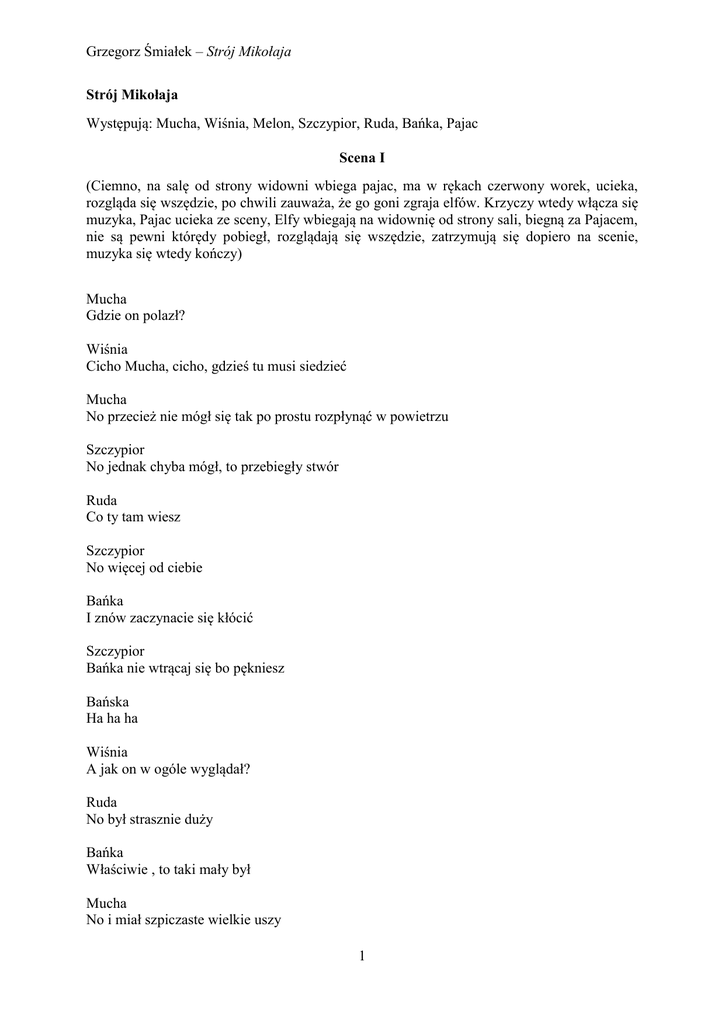 Grzegorz Śmiałek – Strój Mikołaja Strój Mikołaja Występują: Mucha, Wiśnia, Melon, Szczypior, Ruda, Bańka, Pajac Scena I (Ciemno, na salę od strony widowni wbiega pajac, ma w rękach czerwony worek, ucieka, rozgląda się wszędzie, po chwili zauważa, że go goni zgraja elfów. Krzyczy wtedy włącza się muzyka, Pajac ucieka ze sceny, Elfy wbiegają na widownię od strony sali, biegną za Pajacem, nie są pewni którędy pobiegł, rozglądają się wszędzie, zatrzymują się dopiero na scenie, muzyka się wtedy kończy) Mucha Gdzie on polazł? Wiśnia Cicho Mucha, cicho, gdzieś tu musi siedzieć Mucha No przecież nie mógł się tak po prostu rozpłynąć w powietrzu Szczypior No jednak chyba mógł, to przebiegły stwór Ruda Co ty tam wiesz Szczypior No więcej od ciebie Bańka I znów zaczynacie się kłócić Szczypior Bańka nie wtrącaj się bo pękniesz Bańska Ha ha ha Wiśnia A jak on w ogóle wyglądał? Ruda No był strasznie duży Bańka Właściwie , to taki mały był Mucha No i miał szpiczaste wielkie uszy 1 Grzegorz Śmiałek – Strój Mikołaja Szczypior No co ty, on właściwie w ogóle nie miał uszu Wiśnia No i wszystko jasne, czyli w sumie nie wiadomo kto ukradł strój Mikołaja? Wszyscy No w sumie nie Scena II (Aktorzy są bardzo blisko siebie, muzyka, obracają się i wciąż wypatrują, finalnie patrzą się w jedno miejsce. Wchodzi Melon. Reszta go nie widzi. Patrzy w tym samym kierunku i zastanawia się o co chodzi) Melon Cześć (Wszyscy krzyczą ze strachu, bo myśleli, że to Pajac) Wszyscy Melon !! Melon No co się drzecie Szczypior Wystraszyłeś nas Mucha Myśleliśmy, że to ten złodziejaszek Melon Jaki złodziejaszek Wszyscy Ten co ukradł strój Mikołaja Melon Niemożliwe , no przecież jeszcze rano patrzyłem czy wszystko jest w kartonie i stój był Wiśnia Ale teraz go nie ma, możesz sprawdzić Melon Ano sprawdzę (Melon wnosi duży karton na scenę, stawia go na ziemi) 2 Grzegorz Śmiałek – Strój Mikołaja Melon No widzicie, to ten karton …(otwiera karton) a w środku (krzyk AAAAaaa!!) nie ma stroju!! I co teraz, co teraz, tragedia, armagedon, ktoś ukradł strój Świętego Mikołaja, świąt nie będzie, ratunku, ratunku!!! (Wiśnia szybko podbiega do Melona i zakrywa mu usta, a zaraz potem podbiega cała reszta i też po kolei zakrywają mu usta) Wiśnia Zamknij się, nie paplaj tyle, chcesz żeby Mikołaj się dowiedział, że nie dopilnowaliśmy jego stroju i ktoś go zachachmęcił ?! Ruda Wtedy to dopiero będzie armagedon Bańka Ruda wie, co mówi, jakby się Święty dowiedział, to ciężki nasz los… (Elfy śpiewają piosenkę o porwaniu stroju i że Święty Mikołaj nie może się o tym dowiedzieć, bo ciężki będzie Elfa los) Ruda Uwaga, to ja siadam i ryczę!, bo w takiej sytuacji to tylko siąść i płakać …macie ktoś chusteczkę? Szczypior Ja mam, ale taką trochę większą Ruda Wszystko mi jedno (Szczypior przynosi wielkie białe prześcieradło i rzuca Rudej na głowę) Ruda A to co? Szczypior A zwinąłem ją kiedyś jednemu olbrzymowi, a smarkał w nią wtedy cały dzień (Wszyscy się śmieją, Ruda ma focha) Ruda To wcale nie jest śmieszne (Ruda płacze) 3 Grzegorz Śmiałek – Strój Mikołaja Wiśnia Oj przestań się mazać, prędzej czy później znajdziemy tego kogoś, co zabrał strój Mikołaja, a póki co, musimy coś wymyślić! Scena III (Wszyscy myślą, muzyka, grupa tworzy swoisty mechanizm. Każdy rusza się w rytm muzyki, jedna osoba ręką, druga głową, inna znów nogą. Tworzą konstrukcję opierając się o siebie Trwa to kilka sekund. W końcu Mucha krzyczy „Mam!” i wtedy konstrukcja się łamie i wszyscy się przewracają. Mucha się podnosi i jeszcze raz krzyczy „Mam!”) Mucha Mam pomysł, ależ ja jestem niesamowitą Muchą! Normalnie jestem genialna! (wszyscy wstają w różnym tempie) Wszyscy Ale że co? Mucha Skombinujemy Mikołajowi nowy strój, nawet się nie połapie, że to jakiś inny, może nawet stwierdzi, że po kilkudziesięciu latach wreszcie go wypraliśmy i dlatego tak dziwnie wygląda! (Wszyscy klaszczą i się śmieją powtarzają, super, dobrze jest itp.) Bańka No ale jak dopasujemy strój dla Mikołaja, skoro go tu nie ma? Mucha Hmm, no musimy wybrać kogoś z nas, o Szczypior Wszyscy Szczypior Mucha Będziesz królikiem Szczypior, doświadczalnym królikiem, poprzymierzamy na tobie różne rzeczy i skomponujemy coś nowego dla Mikołaja Szczypior No ale… Mucha Nie ma ale, jest zadanie do zrobienia, każdy z was niech przyniesie jakieś ciuchy ze swojej elfowej szafy, zaraz coś wykombinujemy 4 Grzegorz Śmiałek – Strój Mikołaja Scena IV (Muzyka, wszyscy biegną po ciuchy. Szczypior przymierza różne rzeczy, co chwilę coś innego. Finalnie ma na sobie strój mało świąteczny i bardzo eklektyczny, po przebraniu muzyka się kończy) Melon No ja chyba jednak myślę, że ten strój nie za bardzo przypomina naszego świętego Mikołaja. Gdzie odświętną czapeczkę, a okulary? Przecież on nosi do stroju okulary, a te spodnie!? Wiśnia Spoko, spoko, no to dopiero pierwsza przymiarka, na pewno dojdziemy do porozumienia, ale wiecie co Wszyscy Co? Wiśnia Szczypior nie jest chyba dobry w te klocki, dawajcie Bańkę! Scena V (Wszyscy prowadzą Bańkę na środek sceny i ustawiają ją odpowiednio, ręce w bok, nogi w rozkroku) Bańka Ale że co, ale że co, ja? Przecież ja w ogóle nie jestem podobny do Mikołaja Świętego naszego… Ruda Ty się już tym nie martw, my to ocenimy, Mucha leć po miarę (Mucha biegnie po miarę) Ruda Trzeba dokładnie wymierzyć i zmierzyć, żeby wszystko dobrze pasowało (Na scenę wbiega Mucha z miarą) Ruda Teraz się nie ruszaj (Mucha mierzy mrucząc jakieś liczby) Wiśnia No to co , ubieramy Bańkę? Mucha Tak! 5 Grzegorz Śmiałek – Strój Mikołaja (muzyka, wszyscy podobnie jak wcześniej próbują skompletować strój dla Bańki. Finalnie tym razem Bańska ma okulary, ale i tak nie wygl