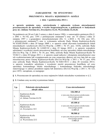 ZARZĄDZENIE NR 1072/GNP/2012 PREZYDENTA MIASTA KĘDZIERZYN - KOŹLE z dnia 1 października 2012 r. w sprawie ustalenia ceny, zatwierdzenia i ogłoszenia wykazu nieruchomości przeznaczonych do sprzedaży w trybie bezprzetargowym, a położonych w budynkach przy ul.: Juliana Tuwima 6A, Zwycięstwa 12,14, Wyzwolenia 22,24,26. Na podstawie art.30 ust.2 pkt 3 ustawy z dnia 8 marca 1990 r. o samorządzie gminnym (Dz.U. z 2001 r. Nr 142, poz. 1591 z późniejszymi zmianami1)) oraz art. 35 ustawy z dnia 21 sierpnia 1997 r. o gospodarce nieruchomościami (Dz. U. z 2010 r. Nr 102, poz. 651, z późniejszymi zmianami2)) oraz w wykonaniu uchwały Rady Miasta Kędzierzyn-Koźle Nr XXIII/256/08 z dnia 29 lutego 2008 r. w sprawie zasad zbywania komunalnych lokali mieszkalnych i użytkowych (Dz.Urz.Woj.Op. z 2008 r. Nr 47, poz. 1610), uchwały Rady Miasta Kędzierzyn-Koźle Nr LI/605/10 z dnia 25 lutego 2010 r. w sprawie warunków udzielania i wysokości stawki procentowej bonifikaty od ceny sprzedaży lokalu mieszkalnego (Dz.Urz.Woj. Op. Z 2010 r. Nr 34, poz. 466), uchwały Rady Miasta Kędzierzyn-Koźle Nr VI/46/11 z dnia 28 lutego 2011 r. w sprawie zasad nabycia i obciążenia nieruchomości oraz ich wydzierżawiania lub wynajmowania na czas oznaczony dłuższy niż trzy lata lub na czas nieoznaczony przez Gminę Kędzierzyn-Koźle (Dz.Urz.Woj.Op. z 2011 r. Nr 37, poz. 459) oraz uchwały Rady Miasta Kędzierzyn-Koźle Nr XIII/158/11 z dnia 28 września 2011r. w sprawie warunków udzielenia i wysokości stawki procentowej bonifikaty od ceny sprzedaży komunalnego lokalu mieszkalnego i komunalnego budynku mieszkalnego stanowiącego w całości przedmiot najmu lub dzierżawy (Dz.Urz.Woj.Op. z 2011 r. Nr 123, poz.1455) zarządzam, co następuje: § 1. Przeznaczam do sprzedaży na rzecz najemców lokale mieszkalne wymienione w § 2. § 2. Ustalam ceny na niżej wymienione lokale: Lp. Położenie nieruchomości obręb/ ulica Cena nieruchomości 126.300 zł 1. Kędzierzyn-Koźle Blachownia ul. Juliana Tuwima 6A/24 w tym cena zbycia prawa użytkowania wieczystego gruntu 3.300 zł 65.100 zł 2. Kędzierzyn-Koźle Blachownia ul. Zwycięstwa 14/2 w tym cena zbycia prawa użytkowania wieczystego gruntu 6.400 zł 98.500 zł 3. Kędzierzyn-Koźle Blachownia ul. Wyzwolenia 22/2 w tym cena zbycia prawa użytkowania wieczystego gruntu 5.900 zł 1 § 3. Zatwierdzam i ogłaszam wykaz nieruchomości przeznaczonych do zbycia będący załącznikiem do niniejszego zarządzenia, a obejmujący nieruchomości wskazane w § 2. § 4. Z załącznika Nr 1 do Zarządzenia Prezydenta Miasta Kędzierzyn-Koźle Nr 979/GNP/2012 z dnia 26.07.2012 r. w sprawie ogłoszenia wykazu nieruchomości przeznaczonych do sprzedaży w trybie bezprzetargowym skreślam pkt. 1. § 5. Udzielam bonifikaty od ceny sprzedaży poszczególnych lokali mieszkalnych sprzedawanych na rzecz najemców wymienionych w § 2, w wysokości 97%. § 6. § 7. Wykonanie zarządzenia powierzam Kierownikowi Wydziału Gospodarki Nieruchomościami i Planowania Przestrzennego, który informację o realizacji niniejszego zarządzenia złoży w trybie określonym w § 49 ust. 15 Regulaminu Organizacyjnego Urzędu Miasta Kędzierzyn-Koźle. Zarządzenie wchodzi w życie z dniem podjęcia i podlega ogłoszeniu poprzez umieszczenie na tablicy ogłoszeń Urzędu Miasta wraz z wykazem stanowiącym załącznik do niego. Informacja o wywieszeniu wykazu podlega ogłoszeniu w prasie lokalnej oraz na stronie internetowej Urzędu Miasta Kędzierzyn-Koźle. PREZYDENT MIASTA KĘDZIERZYN-KOŹLE T o m a s z W a n t u ł a (-) Odpowiedzialny za sporządzenie informacji: Kierownik Wydziału Gospodarki Nieruchomościami i Planowania Przestrzennego Urzędu Miasta Kędzierzyn-Koźle Małgorzata Jarosz-Wojtarowicz (-) 1) Zmiany tekstu jednolitego wymienionej ustawy zostały ogłoszone w Dz. U. z 2002 r. Nr 23, poz. 220, Nr 62, poz. 558, Nr 113, poz. 984, Nr 153, poz. 1271 i Nr 214, poz. 1806, z 2003 r. Nr 80, poz. 717 i Nr 162, poz. 1568, z 2004 r. Nr 102, poz. 1055 i Nr 116, poz. 1203, Nr 167, poz. 1759, z 2005 r. Nr 172, poz. 1441 i Nr 175, poz. 1457, z 2006 r. Nr 17, poz.128 i Nr 181, poz. 1337, z 2007 r. Nr 48, poz. 327, Nr 138, poz. 974 i Nr 173, poz. 1218, z 2008 r. Nr 180, poz. 1111 i Nr 223, poz. 1458, z 2009 r. Nr 52, poz. 420 i Nr 157, poz. 1241, z 2010 r. Nr 28, poz. 142 i 146, Nr 40, poz.230 i Nr 106, poz. 675, z 2011 r. Nr 21, poz. 113, Nr 117, poz. 679, Nr 134, poz. 777, Nr 149, poz. 887 i Nr 217, poz. 1281, oraz z 2012 Nr 567). 2) Zmiany tekstu jednolitego wymienionej ustawy zostały ogłoszone w Dz. U. z 2010 r. Nr 106, poz.675, Nr 143, poz. 963, Nr 155, poz. 1043, Nr 197, poz. 1307, Nr 200, poz. 1323, z 2011 r. Nr 64, poz. 341, Nr 106, poz. 622, Nr 115, poz. 673, Nr 129, poz. 732, Nr 130, poz. 762, Nr 135, poz. 789, Nr 163, poz. 981, Nr 187, poz. 1110, Nr 224, poz. 1337, oraz z 2012 Nr 908). 2 Załącznik do zarządzenia Prezydenta Miasta Kędzierzyn-Koźle Nr 1072/GNP/2012 z dnia 1.10.2012 r. w sprawie ogłoszenia wykazu nieruchomości przeznaczonych do sprzedaży w trybie b e z p r z e t a r g o w y m Wywieszono dnia ...................... na okres 21 dni tj do dnia ....................... WY K A Z NIERUCHOMOŚCI PRZEZNACZONEJ DO ZBYCIA NA RZECZ NAJEMCÓW W DRODZE BEZPRZETARGOWEJ Na podstawie art. 35 ustawy z dnia 21 sierpnia 1997r. o gospodarce nieruchomościami (Dz.U. z 2010 r. Nr 102 poz. 651 z późniejszymi zmianami1), podaje się do publicznej wiadomości, że przeznaczono do sprzedaży lokale mieszkalne wraz ze zbyciem prawa użytkowania wieczystego gruntu stanowiącego własność Skarbu Państwa. Położenie nieruchomości Lp obręb/ulica Kędzierzyn-Koźle Blachownia 1. ul. Juliana Tuwima 6A/24 Kędzierzyn-Koźle 2. Blachownia ul. Zwycięstwa 14/2 Kędzierzyn-Koźle 3. Blachownia ul. Wyzwolenia 22/2 Oznaczenie nieruchom. wg księgi wieczystej oraz katastru nieruchomości Opis, przeznaczenie i sposób zagospodarowania nieruchomości KW – OP1K/00042258/0 dz. nr 588/1