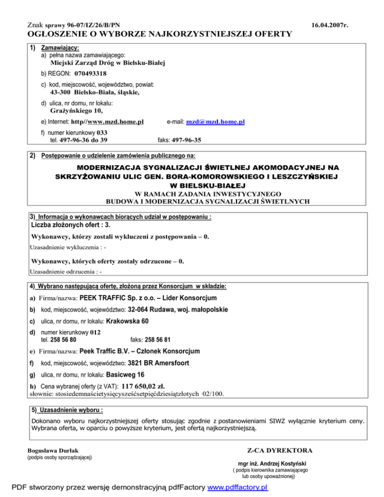 Znak sprawy 96-07/IZ/26/B/PN 16.04.2007r. OGŁOSZENIE O WYBORZE NAJKORZYSTNIEJSZEJ OFERTY 1) Zamawiający: a) pełna nazwa zamawiającego: Miejski Zarząd Dróg w Bielsku-Białej b) REGON: 070493318 c) kod, miejscowość, województwo, powiat: 43-300 Bielsko-Biała, śląskie, d) ulica, nr domu, nr lokalu: Grażyńskiego 10, e) Internet: http//www.mzd.home.pl f) numer kierunkowy 033 tel. 497-96-36 do 39 e-mail: [email protected] faks: 497-96-35 2) Postępowanie o udzielenie zamówienia publicznego na: MODERNIZACJA SYGNALIZACJI ŚWIETLNEJ AKOMODACYJNEJ NA SKRZYŻOWANIU ULIC GEN. BORA-KOMOROWSKIEGO I LESZCZYŃSKIEJ W BIELSKU-BIAŁEJ W RAMACH ZADANIA INWESTYCYJNEGO BUDOWA I MODERNIZACJA SYGNALIZACJI ŚWIETLNYCH 3) Informacja o wykonawcach biorących udział w postępowaniu : Liczba złożonych ofert : 3. Wykonawcy, którzy zostali wykluczeni z postępowania – 0. Uzasadnienie wykluczenia : - Wykonawcy, których oferty zostały odrzucone – 0. Uzasadnienie odrzucenia : - 4) Wybrano następującą ofertę, złożoną przez Konsorcjum w składzie: a) Firma/nazwa: PEEK TRAFFIC Sp. z o.o. – Lider Konsorcjum b) kod, miejscowość, województwo: 32-064 Rudawa, woj. małopolskie c) ulica, nr domu, nr lokalu: Krakowska 60 d) numer kierunkowy 012 tel. 258 56 80 faks: 258 56 81 e) Firma/nazwa: Peek Traffic B.V. – Członek Konsorcjum f) kod, miejscowość, województwo: 3821 BR Amersfoort g) ulica, nr domu, nr lokalu: Basicweg 16 h) Cena wybranej oferty (z VAT): 117 650,02 zł. słownie: stosiedemnaścietysięcysześćsetpięćdziesiątzłotych 02/100. 5) Uzasadnienie wyboru : Dokonano wyboru najkorzystniejszej oferty stosując zgodnie z postanowieniami SIWZ wyłącznie kryterium ceny. Wybrana oferta, w oparciu o powyższe kryterium, jest ofertą najkorzystniejszą. Bogusława Durłak (podpis osoby sporządzającej) Z-CA DYREKTORA mgr inż. Andrzej Kostyński ( podpis kierownika zamawiającego lub osoby upoważnionej) PDF stworzony przez wersję demonstracyjną pdfFactory www.pdffactory.pl