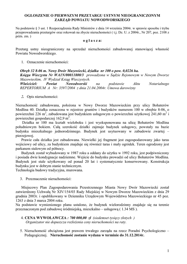 OGŁOSZENIE O PIERWSZYM PRZETARGU USTNYM NIEOGRANICZONYM ZARZĄD POWIATU NOWODWORSKIEGO Na podstawie § 3 ust. 1 Rozporządzenia Rady Ministrów z dnia 14 września 2004r. w sprawie sposobu i trybu przeprowadzania przetargów oraz rokowań na zbycie nieruchomości ( t.j. Dz. U. z 2004r., Nr 207, poz. 2108 z późn. zm. ) o g ł a s z a: Przetarg ustny nieograniczony na sprzedaż nieruchomości zabudowanej stanowiącej własność Powiatu Nowodworskiego. 1. Oznaczenie nieruchomości: Obręb 32 8-06 m. Nowy Dwór Mazowiecki, działka nr 100 o pow. 0,0226 ha. Księga Wieczysta Nr WA1N/00011800/3 prowadzona w Sądzie Rejonowym w Nowym Dworze Mazowieckim, IV Wydział Ksiąg Wieczystych. Właściciel: Powiat Nowodworski na podstawie Aktu Notarialnego REPERTORIUM A Nr: 3597/2004 z dnia 21.04.2004r. Umowa darowizny 2. Opis nieruchomości: Nieruchomość zabudowana, położona w Nowy Dworze Mazowieckim przy ulicy Bohaterów Modlina 40. Działka oznaczona w rejestrze gruntów i budynków numerem 100 w obrębie 8-06, o powierzchni 226 m2, zabudowana jest budynkiem usługowym o powierzchni użytkowej 241,60 m2 i powierzchni gospodarczej 162,9 m2. Działka nr 100 ma kształt wieloboku i jest wyeksponowana na ulicę Bohaterów Modlina południowym bokiem. Całą szerokość działki zajmuje budynek usługowy, powstały na bazie budynku mieszkalnego jednorodzinnego. Budynek jest usytuowany w zabudowie zwartej – pierzejowej. Prawie cała działka jest zabudowana. Niewielki jej fragment jest zagospodarowany jako taras wejściowy od ulicy, za budynkiem znajduje się również taras i mały ogródek. Teren ogrodzony jest parkanem stalowym od północy. Budynek został wybudowany w 1987 roku a oddany do użytku w 1992 roku, jest podpiwniczony i posiada dwie kondygnacje nadziemne. Wejście do budynku prowadzi od ulicy Bohaterów Modlina. Budynek jest stale użytkowany od ponad 20 lat i systematycznie konserwowany. Konstrukcja budynku jest w dobrym stanie technicznym. Technologia budowy tradycyjna, murowana. 3. Przeznaczenie nieruchomości: Miejscowy Plan Zagospodarowania Przestrzennego Miasta Nowy Dwór Mazowiecki został zatwierdzony Uchwałą Nr XIV/154/03 Rady Miejskiej w Nowym Dworze Mazowieckim z dnia 29 grudnia 2003r. i opublikowany w Dzienniku Urzędowym Województwa Mazowieckiego nr 45 poz. 1263 z dnia 3 marca 2004 roku. Na podstawie wymienionego planu ustalono, że budynek wielorodzinny znajduje się na terenie przeznaczonym pod zabudowę śródmiejską, mieszkalno – usługową ( 1.34 MS ). 4. CENA WYWOŁAWCZA : 700 000,00 zł (siedemset tysięcy złotych ) Organizator nie dopuszcza rozłożenia ceny nieruchomości na raty. 5. Nieruchomość obciążona jest prawem trwałego zarządu na rzecz Poradni Psychologiczno – Pedagogicznej. Nieruchomość zostanie wydana w terminie do 31.12.2014r. 1 6. Przetarg na sprzedaż wyżej wymienionej nieruchomości odbędzie się w dniu 01.08.2014r. o godz. 1200 w sali konferencyjnej nr 104 Starostwa Powiatowego w Nowym Dworze Mazowieckim przy ulicy Ignacego Paderewskiego 1B. 7. Przetarg rozpocznie się o godzinie 1100 rejestracją osób uprawnionych. 8. W przetargu mogą uczestniczyć osoby fizyczne i prawne, które wpłacą wadium w wysokości 5% ceny wywoławczej w kwocie 35 000,00 zł ( słownie: trzydzieści pięć tysięcy złotych ) najpóźniej w dniu 28.07.2014r. na rachunek Starostwa Powiatowego w Nowym Dworze Mazowieckim: Polski Bank Spółdzielczy w Ciechanowie, Oddz. Płońsk 78 8213 0008 2006 0803 0340 0012. 9. Za termin wniesienia wadium uważa się dzień jego wpływu na konto Starostwa. 10. Wadium wpłacone przez uczestnika, który przetarg wygrał zalicza się na poczet ceny nabycia nieruchomości, pozostałym osobom wadium zostanie zwrócone niezwłocznie po zakończeniu przetargu - lecz nie później niż przed upływem 3 dni od dnia odwołania lub zamknięcia przetargu - na wskazane konto. 11. Zarząd Powiatu w terminie 21 dni od dnia ustalenia nabywcy zawiadomi osobę ustaloną jako nabywca o miejscu i terminie zawarcia umowy o sprzedaż. 12. Zarząd Powiatu może odstąpić od zawarcia umowy, a wpłacone wadium nie podlega zwrotowi, jeżeli osoba ustalona jako nabywca nieruchomości nie przystąpi bez usprawiedliwienia do zawarcia umowy w miejscu i terminie podanych w zawiadomieniu. 13. Postąpienie nie może wynosić mniej niż 1% ceny wywoławczej, z zaokrągleniem w górę do pełnych dziesiątek złotych. 14. Protokół z przeprowadzonego przetargu stanowi podstawę zawarcia umowy. 15. Przetarg jest ważny bez względu na liczbę uczestników, jeżeli przynajmniej jeden uczestnik zaoferował co najmniej jedno postąpienie powyżej ceny wywoławczej. 16. Nabywca zobowiązany jest zapłacić cenę, nie później niż do dnia zawarcia umowy przenoszącej własność. 17. Za termin zapłaty ceny uważa się dzień wpływu należności na wskazane konto. 18. Warunkiem zawarcia umowy sprzedaży z nabywcą będącym cudzoziemcem jest uzyskanie zezwolenia Ministra Spraw Wewnętrznych i Administracji zgodnie z ustawą z dnia 24 marca 1920r. o nabywaniu nieruchomości przez cudzoziemców ( Dz. U. 2004r., Nr 167, poz. 1758 z późn. zm. ). Cudzoziemiec przystępując do przetargu musi przedłożyć promesę przyrzeczenie wydania w/w zezwolenia. 19. Przetarg uważa się za zakończony wynikiem negatywnym, jeżeli nikt nie przystąpi do przetargu lub żaden z uczestników nie zaoferuje postąpienia ponad cenę wywoławczą. 20. Szczegółowe informacje o nieruchomości można uzyskać w pokoju Nr 27 i 25 Starostwa Powiatowego w Nowym Dworze Mazowieckim przy ulicy Ignacego Paderewskiego 1 B, tel. ( 0-22) 765-32-54, ( 0-22) 765-32-52. Z up. ZARZĄDU POWIATU Henryk Mędrecki WICESTAROSTA 2