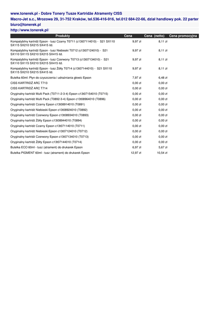 www.tonerek.pl - Dobre Tonery Tusze Kartridże Atramenty CISS Macro-Jet s.c., Mrozowa 29, 31-752 Kraków, tel.536-416-916, tel.012 684-22-66, dział handlowy pok. 22 parter [email protected] http://www.tonerek.pl/ Produkty Cena Cena (netto) Kompatybilny kartridż Epson - tusz Czarny T0711 (c13t07114010) - S21 SX110 SX115 SX210 SX215 SX415 itd. 9,97 zł 8,11 zł Kompatybilny kartridż Epson - tusz Niebieski T0712 (c13t07124010) - S21 SX110 SX115 SX210 SX215 SX415 itd. 9,97 zł 8,11 zł Kompatybilny kartridż Epson - tusz Czerwony T0713 (c13t07134010) - S21 SX110 SX115 SX210 SX215 SX415 itd. 9,97 zł 8,11 zł Kompatybilny kartridż Epson - tusz Żółty T0714 (c13t07144010) - S21 SX110 SX115 SX210 SX215 SX415 itd. 9,97 zł 8,11 zł Butelka 60ml: Płyn do czyszczenia i udrażniania głowic Epson 7,97 zł 6,48 zł CISS KARTRIDŻ ARC T713 0,00 zł 0,00 zł CISS KARTRIDŻ ARC T714 0,00 zł 0,00 zł Oryginalny kartridż Multi Pack (T0711-2-3-4) Epson c13t07154010 (T0715) 0,00 zł 0,00 zł Oryginalny kartridż Multi Pack (T0892-3-4) Epson c13t08964010 (T0896) 0,00 zł 0,00 zł Oryginalny kartridż Czarny Epson c13t08914010 (T0891) 0,00 zł 0,00 zł Oryginalny kartridż Niebieski Epson c13t08924010 (T0892) 0,00 zł 0,00 zł Oryginalny kartridż Czerwony Epson c13t08934010 (T0893) 0,00 zł 0,00 zł Oryginalny kartridż Żółty Epson c13t08944010 (T0894) 0,00 zł 0,00 zł Oryginalny kartridż Czarny Epson c13t07114010 (T0711) 0,00 zł 0,00 zł Oryginalny kartridż Niebieski Epson c13t07124010 (T0712) 0,00 zł 0,00 zł Oryginalny kartridż Czerwony Epson c13t07134010 (T0713) 0,00 zł 0,00 zł Oryginalny kartridż Żółty Epson c13t07144010 (T0714) 0,00 zł 0,00 zł Butelka ECO 60ml - tusz (atrament) do drukarek Epson 6,97 zł 5,67 zł 12,97 zł 10,54 zł Butelka PIGMENT 60ml - tusz (atrament) do drukarek Epson Cena promocyjna