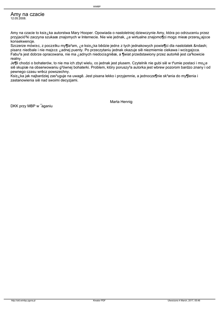 WiMBP Amy na czacie 12.05.2008. Amy na czacie to ksi±¿ka autorstwa Mary Hooper. Opowiada o nastoletniej dziewczynie Amy, która po odrzuceniu przez przyjació³ki zaczyna szukaæ znajomych w Internecie. Nie wie jednak, ¿e wirtualne znajomo¶ci mog± mieæ przera¿aj±ce konsekwencje. Szczerze mówi±c, z pocz±tku my¶la³am, ¿e ksi±¿ka bêdzie jedn± z tych jednakowych powie¶ci dla nastolatek – pisan± niedbale i nie maj±c± ¿adnej puenty. Po przeczytaniu jednak okazuje siê niezmiernie ciekawa i wci±gaj±ca. Fabu³a jest dobrze opracowana, nie ma ¿adnych niedoci±gniêæ, a ¶wiat przedstawiony przez autorkê jest ca³kowicie realny. Je¶li chodzi o bohaterów, to nie ma ich zbyt wielu, co jednak jest plusem. Czytelnik nie gubi siê w t³umie postaci i mo¿e siê skupiæ na obserwowaniu g³ównej bohaterki. Problem, który poruszy³a autorka jest wbrew pozorom bardzo znany i od pewnego czasu wrêcz powszechny. Ksi±¿ka jak najbardziej zas³uguje na uwagê. Jest pisana lekko i przyjemnie, a jednocze¶nie sk³ania do my¶lenia i zastanowienia siê nad swoimi decyzjami. Marta Hennig DKK przy MBP w ¯aganiu http://old.wimbp.zgora.pl Kreator PDF Utworzono 4 March, 2017, 05:46