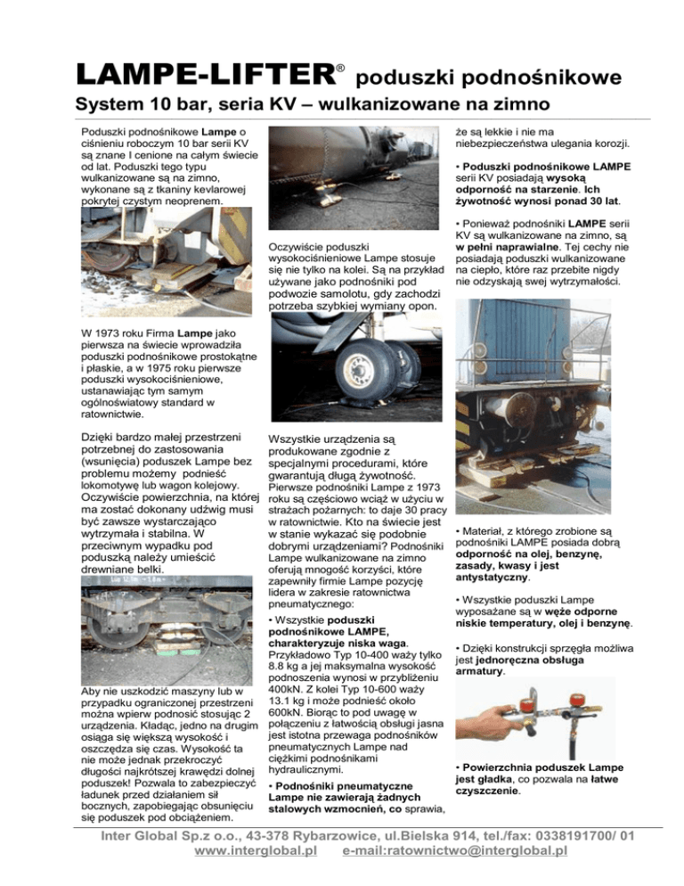 LAMPE-LIFTER ® poduszki podnośnikowe System 10 bar, seria KV – wulkanizowane na zimno _______________________________________________________________________________________________________________________________________________________________________________________________ że są lekkie i nie ma niebezpieczeństwa ulegania korozji. Poduszki podnośnikowe Lampe o ciśnieniu roboczym 10 bar serii KV są znane I cenione na całym świecie od lat. Poduszki tego typu wulkanizowane są na zimno, wykonane są z tkaniny kevlarowej pokrytej czystym neoprenem. • Poduszki podnośnikowe LAMPE serii KV posiadają wysoką odporność na starzenie. Ich żywotność wynosi ponad 30 lat. Oczywiście poduszki wysokociśnieniowe Lampe stosuje się nie tylko na kolei. Są na przykład używane jako podnośniki pod • Ponieważ podnośniki LAMPE serii KV są wulkanizowane na zimno, są w pełni naprawialne. Tej cechy nie posiadają poduszki wulkanizowane na ciepło, które raz przebite nigdy nie odzyskają swej wytrzymałości. podwozie samolotu, gdy zachodzi potrzeba szybkiej wymiany opon. W 1973 roku Firma Lampe jako pierwsza na świecie wprowadziła poduszki podnośnikowe prostokątne i płaskie, a w 1975 roku pierwsze poduszki wysokociśnieniowe, ustanawiając tym samym ogólnoświatowy standard w ratownictwie. Dzięki bardzo małej przestrzeni potrzebnej do zastosowania (wsunięcia) poduszek Lampe bez problemu możemy podnieść lokomotywę lub wagon kolejowy. Oczywiście powierzchnia, na której ma zostać dokonany udźwig musi być zawsze wystarczająco wytrzymała i stabilna. W przeciwnym wypadku pod poduszką należy umieścić drewniane belki. Wszystkie urządzenia są produkowane zgodnie z specjalnymi procedurami, które gwarantują długą żywotność. Pierwsze podnośniki Lampe z 1973 roku są częściowo wciąż w użyciu w strażach pożarnych: to daje 30 pracy w ratownictwie. Kto na świecie jest w stanie wykazać się podobnie dobrymi urządzeniami? Podnośniki Lampe wulkanizowane na zimno oferują mnogość korzyści, które zapewniły firmie Lampe pozycję lidera w zakresie ratownictwa pneumatycznego: • Wszystkie poduszki podnośnikowe LAMPE, charakteryzuje niska waga. Przykładowo Typ 10-400 waży tylko 8.8 kg a jej maksymalna wysokość podnoszenia wynosi w przybliżeniu 400kN. Z kolei Typ 10-600 waży Aby nie uszkodzić maszyny lub w przypadku ograniczonej przestrzeni 13.1 kg i może podnieść około 600kN. Biorąc to pod uwagę w można wpierw podnosić stosując 2 urządzenia. Kładąc, jedno na drugim połączeniu z łatwością obsługi jasna jest istotna przewaga podnośników osiąga się większą wysokość i pneumatycznych Lampe nad oszczędza się czas. Wysokość ta ciężkimi podnośnikami nie może jednak przekroczyć długości najkrótszej krawędzi dolnej hydraulicznymi. poduszek! Pozwala to zabezpieczyć • Podnośniki pneumatyczne ładunek przed działaniem sił Lampe nie zawierają żadnych bocznych, zapobiegając obsunięciu stalowych wzmocnień, co sprawia, się poduszek pod obciążeniem. • Materiał, z którego zrobione są podnośniki LAMPE posiada dobrą odporność na olej, benzynę, zasady, kwasy i jest antystatyczny. • Wszystkie poduszki Lampe wyposażane są w węże odporne niskie temperatury, olej i benzynę. • Dzięki konstrukcji sprzęgła możliwa jest jednoręczna obsługa armatury. • Powierzchnia poduszek Lampe jest gładka, co pozwala na łatwe czyszczenie. Inter Global Sp.z o.o., 43-378 Rybarzowice, ul.Bielska 914, tel./fax: 0338191700/ 01 www.interglobal.pl e-mail:[email protected] Zestawienie danych technicznych poduszek podnośnikowych Lampe Seria KV, 10 bar, wulkanizowane na zimno Typ poduszki podnośnikowej Max. siła podnoszenia kN Max. wysokość podnoszenia cm Nominalna siła podnoszenia na wysokość podnoszenia kN/cm Ilość powietrza potrzebna do napompowania l Przestrzeń wymagana do wsunięcia cm Długość (w stanie nie napompowanym) cm Szerokość (w stanie nie napompowanym) cm Waga kg Nr. artykułu 10-100 10-200 10-300 10-400 10-600 94 20 196 23 300 23 380 35 600 41 20/10 66 70/10 190 130/10 330 150/15 550 200/20 930 1,1 1,1 1,1 2,2 2,2 45 76 110 76 115 33 33 32 63 63 3,6 71313 6,3 71323 8,5 71333 8,8 71351 13,1 71353 Oprzyrządowanie: Art. Nr.: 71443 71535 71449 71442 71554 71555 71421 27483 72186 73411 73412 73413 71463 Armatura bezpieczeństwa, 10 bar Wąż zasilający, 10 bar, 5 m (gładka powierzchnia) Armatura sterująca z automatycznym zabezpieczeniem przed przepompowaniem, 10 bar Kontroler ciśnienia, 10 bar do zastosowania tylko z armaturą 71449 Wąż doprowadzający ciśnienie, 5 m (gładka powierzchnia) Wąż doprowadzający ciśnienie, 40 m (gładka powierzchnia) Reduktor ciśnienia 200/300 bar Butla ze sprężonym powietrzem, 300 bar, 6 l Wózek wałkowy do przesuwania podniesionego materiału o nośności do 400 kN Przejście na przewody stosowane w górnictwie Przejście na wentyl kołowy Przejście na system hamulcowy stosowany w kolejnictwie Rozdzielacz łączący do 3 reduktorów ciśnienia (71421 lub 71413) z 1 wężem doprowadzającym ciśnienie (71554) Pozostałe produkty wchodzące w skład pneumatycznego systemu ratowniczego LAMPE (odrębne katalogi): System 1 bar System 1 bar System 0,5 bar System 1 bar System 10 bar poduszki uszczelniające do zamykania rur poduszka do uszczelniania pękniętych zbiorników specjalistyczne poduszki podnośnikowe dla lotnictwa poduszki podnośnikowe wysokiego podnoszenia poduszki podnośnikowe wulkanizowane na ciepło Inter Global Sp.z o.o., 43-378 Rybarzowice, ul.Bielska 914, tel./fax: 0338191700/ 01 www.interglobal.pl e-mail:[email protected]