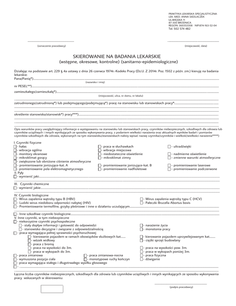 PRAKTYKA LEKARSKA SPECJALISTYCZNA LEK. MED. ANNA SIEDLACZEK UL.WIEJSKA 11 87-300 BRODNICA REGON: 360353308 NIP:874-163-52-04 Tel. 502 574 482 ............................................................................... ….................................................................................... (oznaczenie pracodawcy) (miejscowoœæ, data) SKIEROWANIE NA BADANIA LEKARSKIE (wstêpne, okresowe, kontrolne) (sanitarno-epidemiologiczne) Dzia³aj¹c na podstawie art. 229 § 4a ustawy z dnia 26 czerwca 1974r.-Kodeks Pracy (Dz.U. Z 2014r. Poz. 1502 z póŸn. zm.) kierujê na badania lekarskie: Pana/Pani¹*)............................................................................................................................................................................................................................................................................................................................ (nazwisko i imiê) nr PESEL**).............................................................................................................................................................................................................................................................................................................................. zamieszka³ego/zamieszka³¹*).................................................................................................................................................................................................................................................................................... (miejscowoœæ, ulica, nr domu, nr lokalu) …........................................................................................................................................................................................................................................................................................................................................................ zatrudnionego/zatrudnion¹*) lub podejmuj¹cego/podejmuj¹c¹*) pracê na stanowisku lub stanowiskach pracy*:.......................................................................... ............................................................................................................................................................................................................................................................................................................................................................ ............................................................................................................................................................................................................................................................................................................................................................ okreœlenie stanowiska/stanowisk*) pracy***).............................................................................................................................................................................................................................................. ............................................................................................................................................................................................................................................................................................................................................................ …........................................................................................................................................................................................................................................................................................................................................................ ............................................................................................................................................................................................................................................................................................................................................................ Opis warunków pracy uwzglêdniaj¹cy informacje o wystêpowaniu na stanowisku lub stanowiskach pracy, czynników niebezpiecznych, szkodliwych dla zdrowia lub czynników uci¹¿liwych i innych wynikaj¹cych ze sposobu wykonywania pracy, z podaniem wielkoœci nara¿enia oraz aktualnych wyników badañ i pomiarów czynników szkodliwych dla zdrowia, wykonanych na tym stanowisku/stanowiskach-nale¿y wpisaæ nazwê czynnika/czynników i wielkoœæ/wielkoœci nara¿enia****) I. Czynniki fizyczne - ha³as - praca w s³uchawkach - ultradŸwiêki - wibracja ogólna - wibracja miejscowa - monitory ekranowe - niedostateczne oœwietlenie - nadmierne oœwietlenie - mikroklimat gor¹cy - mikroklimat zimny - zmienne warunki atmosferyczne - zwiêkszone lub obni¿one ciœnienie atmosferyczne - promieniowanie jonizuj¹ce-kat. A - promieniowanie jonizuj¹ce-kat. B - promieniowanie laserowe - promieniowanie pola elektromagnetycznego - promieniowanie nadfioletowe - promieniowanie podczerwone II. Py³y - wymieniæ jaki:................................................................................................................................................................................................................................................................................................................... ….......................................................................................................................................................................................................................................................................................................................................................... III. Czynniki chemiczne - wymieniæ jakie:...........................................................................................
