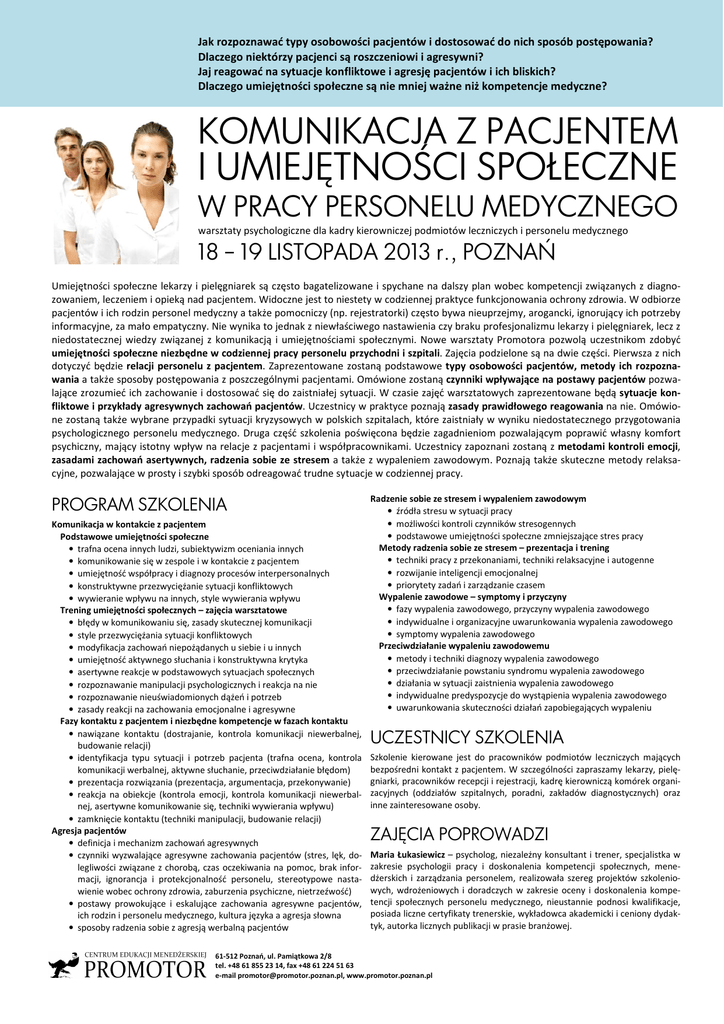 Jak rozpoznawać typy osobowości pacjentów i dostosować do nich sposób postępowania? Dlaczego niektórzy pacjenci są roszczeniowi i agresywni? Jaj reagować na sytuacje konfliktowe i agresję pacjentów i ich bliskich? Dlaczego umiejętności społeczne są nie mniej ważne niż kompetencje medyczne? KOMUNIKACJA Z PACJENTEM I UMIEJĘTNOŚCI SPOŁECZNE W PRACY PERSONELU MEDYCZNEGO warsztaty psychologiczne dla kadry kierowniczej podmiotów leczniczych i personelu medycznego 18 – 19 LISTOPADA 2013 r., POZNAŃ Umiejętności społeczne lekarzy i pielęgniarek są często bagatelizowane i spychane na dalszy plan wobec kompetencji związanych z diagnozowaniem, leczeniem i opieką nad pacjentem. Widoczne jest to niestety w codziennej praktyce funkcjonowania ochrony zdrowia. W odbiorze pacjentów i ich rodzin personel medyczny a także pomocniczy (np. rejestratorki) często bywa nieuprzejmy, arogancki, ignorujący ich potrzeby informacyjne, za mało empatyczny. Nie wynika to jednak z niewłaściwego nastawienia czy braku profesjonalizmu lekarzy i pielęgniarek, lecz z niedostatecznej wiedzy związanej z komunikacją i umiejętnościami społecznymi. Nowe warsztaty Promotora pozwolą uczestnikom zdobyć umiejętności społeczne niezbędne w codziennej pracy personelu przychodni i szpitali. Zajęcia podzielone są na dwie części. Pierwsza z nich dotyczyć będzie relacji personelu z pacjentem. Zaprezentowane zostaną podstawowe typy osobowości pacjentów, metody ich rozpoznawania a także sposoby postępowania z poszczególnymi pacjentami. Omówione zostaną czynniki wpływające na postawy pacjentów pozwalające zrozumieć ich zachowanie i dostosować się do zaistniałej sytuacji. W czasie zajęć warsztatowych zaprezentowane będą sytuacje konfliktowe i przykłady agresywnych zachowań pacjentów. Uczestnicy w praktyce poznają zasady prawidłowego reagowania na nie. Omówione zostaną także wybrane przypadki sytuacji kryzysowych w polskich szpitalach, które zaistniały w wyniku niedostatecznego przygotowania psychologicznego personelu medycznego. Druga część szkolenia poświęcona będzie zagadnieniom pozwalającym poprawić własny komfort psychiczny, mający istotny wpływ na relacje z pacjentami i współpracownikami. Uczestnicy zapoznani zostaną z metodami kontroli emocji, zasadami zachowań asertywnych, radzenia sobie ze stresem a także z wypaleniem zawodowym. Poznają także skuteczne metody relaksacyjne, pozwalające w prosty i szybki sposób odreagować trudne sytuacje w codziennej pracy. PROGRAM SZKOLENIA Komunikacja w kontakcie z pacjentem Podstawowe umiejętności społeczne • trafna ocena innych ludzi, subiektywizm oceniania innych • komunikowanie się w zespole i w kontakcie z pacjentem • umiejętność współpracy i diagnozy procesów interpersonalnych • konstruktywne przezwyciężanie sytuacji konfliktowych • wywieranie wpływu na innych, style wywierania wpływu Trening umiejętności społecznych – zajęcia warsztatowe • błędy w komunikowaniu się, zasady skutecznej komunikacji • style przezwyciężania sytuacji konfliktowych • modyfikacja zachowań niepożądanych u siebie i u innych • umiejętność aktywnego słuchania i konstruktywna krytyka • asertywne reakcje w podstawowych sytuacjach społecznych • rozpoznawanie manipulacji psychologicznych i reakcja na nie • rozpoznawanie nieuświadomionych dążeń i potrzeb • zasady reakcji na zachowania emocjonalne i agresywne Fazy kontaktu z pacjentem i niezbędne kompetencje w fazach kontaktu • nawiązane kontaktu (dostrajanie, kontrola komunikacji niewerbalnej, budowanie relacji) • identyfikacja typu sytuacji i potrzeb pacjenta (trafna ocena, kontrola komunikacji werbalnej, aktywne słuchanie, przeciwdziałanie błędom) • prezentacja rozwiązania (prezentacja, argumentacja, przekonywanie) • reakcja na obiekcje (kontrola emocji, kontrola komunikacji niewerbalnej, asertywne komunikowanie się, techniki wywierania wpływu) • zamknięcie kontaktu (techniki manipulacji, budowanie relacji) Agresja pacjentów • definicja i mechanizm zachowań agresywnych • czynniki wyzwalające agresywne zachowania pacjentów (stres, lęk, dolegliwości związane z chorobą, czas oczekiwania na pomoc, brak informacji, ignorancja i protekcjonalność personelu, stereotypowe nastawienie wobec ochrony zdrowia, zaburzenia psychiczne, nietrzeźwość) • postawy prowokujące i eskalujące zachowania agresywne pacjentów, ich rodzin i personelu medycznego, kultura języka a agresja słowna • sposoby radzenia sobie z agresją werbalną pacjentów Radzenie sobie ze stresem i wypaleniem zawodowym • źródła stresu w sytuacji pracy • możliwości kontroli czynników stresogennych • podstawowe umiejętności społeczne zmniejszające stres pracy Metody radzenia sobie ze stresem – prezentacja i trening • techniki pracy z przekonaniami, techniki relaksacyjne i autogenne • rozwijanie inteligencji emocjonalnej • priorytety zadań i zarządzanie czasem Wypalenie zawodowe – symptomy i przyczyny • fazy wypalenia zawodowego, przyczyny wypalenia zawodowego • indywidualne i organizacyjne uwarunkowania wypalenia zawodowego • symptomy wypalenia zawodowego Przeciwdziałanie wypaleniu zawodowemu • metody i techniki diagnozy wypalenia zawodowego • przeciwdziałanie powstaniu syndromu wypalenia zawodowego • działania w sytuacji zaistnienia wypalenia zawodowego • indywidualne predyspozycje do wystąpienia wypalenia zawodowego • uwarunkowania skuteczności działań zapobiegających wypaleniu UCZESTNICY SZKOLENIA Szkolenie kierowane jest do pracowników podmiotów leczniczych mających bezpośredni kontakt z pacjentem. W szczególności zapraszamy lekarzy, pielęgniarki, pracowników recepcji i rejestracji, kadrę kierowniczą komórek organizacyjnych (oddziałów szpitalnych, poradni, zakładów diagnostycznych) oraz inne zainteresowane osoby. ZAJĘCIA POPROWADZI Maria Łukasiew