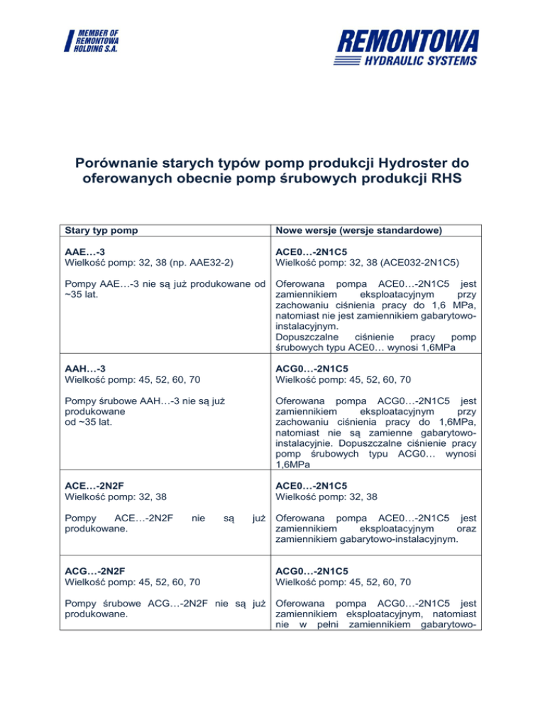 Porównanie starych typów pomp produkcji Hydroster do oferowanych obecnie pomp śrubowych produkcji RHS Stary typ pomp Nowe wersje (wersje standardowe) AAE…-3 Wielkość pomp: 32, 38 (np. AAE32-2) ACE0…-2N1C5 Wielkość pomp: 32, 38 (ACE032-2N1C5) Pompy AAE…-3 nie są już produkowane od Oferowana pompa ACE0…-2N1C5 jest ~35 lat. zamiennikiem eksploatacyjnym przy zachowaniu ciśnienia pracy do 1,6 MPa, natomiast nie jest zamiennikiem gabarytowoinstalacyjnym. Dopuszczalne ciśnienie pracy pomp śrubowych typu ACE0… wynosi 1,6MPa AAH…-3 Wielkość pomp: 45, 52, 60, 70 ACG0…-2N1C5 Wielkość pomp: 45, 52, 60, 70 Pompy śrubowe AAH…-3 nie są już produkowane od ~35 lat. Oferowana pompa ACG0…-2N1C5 jest zamiennikiem eksploatacyjnym przy zachowaniu ciśnienia pracy do 1,6MPa, natomiast nie są zamienne gabarytowoinstalacyjnie. Dopuszczalne ciśnienie pracy pomp śrubowych typu ACG0… wynosi 1,6MPa ACE…-2N2F Wielkość pomp: 32, 38 ACE0…-2N1C5 Wielkość pomp: 32, 38 Pompy ACE…-2N2F produkowane. nie ACG…-2N2F Wielkość pomp: 45, 52, 60, 70 są już Oferowana pompa ACE0…-2N1C5 jest zamiennikiem eksploatacyjnym oraz zamiennikiem gabarytowo-instalacyjnym. ACG0…-2N1C5 Wielkość pomp: 45, 52, 60, 70 Pompy śrubowe ACG…-2N2F nie są już Oferowana pompa ACG0…-2N1C5 jest produkowane. zamiennikiem eksploatacyjnym, natomiast nie w pełni zamiennikiem gabarytowo- instalacyjnie. Konstrukcyjnie jest analogiczna, przy czym zmienione są: średnice końcówki wałka i odległość osi zasilania pompy od zamka kołnierza. ABF…-3 Wielkość pomp: 80, 90, 100, 110,125 Pompy śrubowe ABF… produkowane od ~35 lat. nie są ACF…-3; 3L Wielkość pomp: 80, 90, 100, 110, 125 ACF0…-3N4C5 Wielkość pomp: 80, 90, 100, 110, 125 już Oferowana pompa śrubowa ACF0…-3N4C5 jest zamiennikiem eksploatacyjnym, jednak nie jest zamiennikiem instalacyjnogabarytowym pompy ABF…-3 (gabarytowoinstalacyjnie jest mniejsza). ACF….-3N4C5 Wielkość pomp: 80, 90, 100, 110, 125 Oferowana pompa ACF.…-2N1C5 jest zamiennikiem eksploatacyjnym oraz zamiennikiem gabarytowo-instalacyjnym. ABQ…-3; 3L Wielkość pomp: 110, 125 ABQ….-3NC5 Wielkość pomp: 110, 125 Oferowana pompa ABQ.…-2N1C5 jest zamiennikiem eksploatacyjnym oraz zamiennikiem gabarytowo-instalacyjnym.