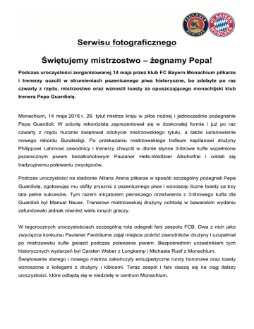Serwisu fotograficznego Świętujemy mistrzostwo – żegnamy Pepa! Podczas uroczystości zorganizowanej 14 maja przez klub FC Bayern Monachium piłkarze i trenerzy uczcili w strumieniach pszenicznego piwa historyczne, bo zdobyte po raz czwarty z rzędu, mistrzostwo oraz wznosili toasty za opuszczającego monachijski klub trenera Pepa Guardiolę. Monachium, 14 maja 2016 r. 26. tytuł mistrza kraju w piłce nożnej i jednocześnie pożegnanie Pepa Guardioli: W sobotę rekordzista zaprezentował się w doskonałej formie i już po raz czwarty z rzędu hucznie świętował zdobycie mistrzowskiego tytułu, a także ustanowienie nowego rekordu Bundesligi. Po przekazaniu mistrzowskiego trofeum kapitanowi drużyny Philippowi Lahmowi zawodnicy i trenerzy chwycili w dłonie słynne 3-litrowe kufle wypełnione pszenicznym piwem bezalkoholowym Paulaner Hefe-Weißbier Alkoholfrei i oddali się tradycyjnemu polewaniu zwycięzców. Podczas uroczystości na stadionie Allianz Arena piłkarze w sposób szczególny pożegnali Pepa Guardiolę, zgotowując mu obfity prysznic z pszenicznego piwa i wznosząc liczne toasty za trzy lata pełne sukcesów. Tym razem inicjatorem pierwszego orzeźwienia z 3-litrowego kufla dla Guardioli był Manuel Neuer. Trenerowi mistrzowskiej drużyny ochłodę w bawarskim wydaniu zafundowało jednak również wielu innych graczy. W tegorocznych uroczystościach szczególną rolę odegrali fani zespołu FCB. Dwa z nich jako zwycięzca konkursu Paulaner Fanträume zajął miejsce pośród zawodników drużyny i uzupełniał po mistrzowsku kufle gwiazd podczas polewania piwem. Bezpośrednim uczestnikiem tych historycznych wydarzeń był Carsten Weber z Longkamp i Michaela Ruef z Monachium. Świętowanie starego i nowego mistrza zakończyły entuzjastyczne rundy honorowe oraz toasty wznoszone z kolegami z drużyny i kibicami. Teraz zespół i fani cieszą się na ciąg dalszy uroczystości, które odbędą się w niedzielę w centrum Monachium. Pod poniższym łączem udostępniono nieodpłatnie zdjęcia z imprezy zorganizowanej z browarem Paulaner 14 maja 2016 r. na stadionie Allianz Arena. è http://www.paulaner-presse.de/FCB-Meisterfeier-2016/ Dodatkowe informacje Browar Paulaner jest od wielu lat głównym partnerem klubu FC Bayern Monachium. Te dwa monachijskie przedsiębiorstwa z tradycjami wspólnie cieszą się z bramek, tytułów i zwycięstw, demonstrując całemu światu legendarne prysznice z pszenicznego piwa jako sposób świętowania po bawarsku! Browar Paulaner partneruje zarówno klubowi FC Bayern, jak i jego kibicom. I tak w odpowiedzi na ich oczekiwania za każdą bramkę zdobytą w Bundeslidze funduje 100 litrów darmowego piwa. W latach 2011–2015 piłkarze amatorzy z całego świata mogli spróbować swych sił w rywalizacji z zawodowcami z FC Bayern Monachium o puchar Paulaner Cup. Od tego roku browar organizuje konkursy Paulaner Fanträume związane z klubem FCB i jego zawodnikami, które dostarczają niezapomnianych wrażeń. Na stadionie Allianz Arena oraz podczas wielu imprez z udziałem kibiców klubu FC Bayern Monachium serwowane są oczywiście piwne specjały marki Paulaner. O browarze Paulaner Brauerei GmbH und Co. KG: Paulaner Brauerei GmbH und Co. KG jest jednym z największych, monachijskich browarów tradycyjnych i należy do grupy Paulaner Brauerei Gruppe. Od 1634 marka Paulaner oznacza najlepszą sztukę browarnictwa i bawarskiego stylu życia, a znana jest pod hasłem „Gut – besser – Paulaner“ („Dobre - lepsze - Paulaner“). Grupa Paulaner Brauerei Gruppe skupia marki Paulaner, Hacker-Pschorr, Auer Bräu, Hopf und Thurn oraz Taxis. Kierują nią: Roland Tobias (rzecznik), dr. Stefan Lustig, Heinrich Müller, dr. Stefan Schmale i Andreas Steinfatt. Dalsze informacje znajdą Państwo na stronie: www.paulaner.de i newsroom.paulaner.de Kontakt: Paulaner Brauerei GmbH & Co. KG Marcus Müller Kierownik ds. Wydarzen i sponsoringu Hochstraße 75 D-81541 Monachium T: +49 (0) 89 27 37 43-04 E-Mail: [email protected] Kontakt dla prasy: powerpress medien GmbH – Kommunikationsagentur Kerstin Kotzmann Knöbelstraße 36 D-80538 Monachium T: +49 (0) 89 27 37 43-04 E-Mail: [email protected]