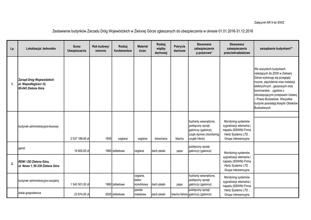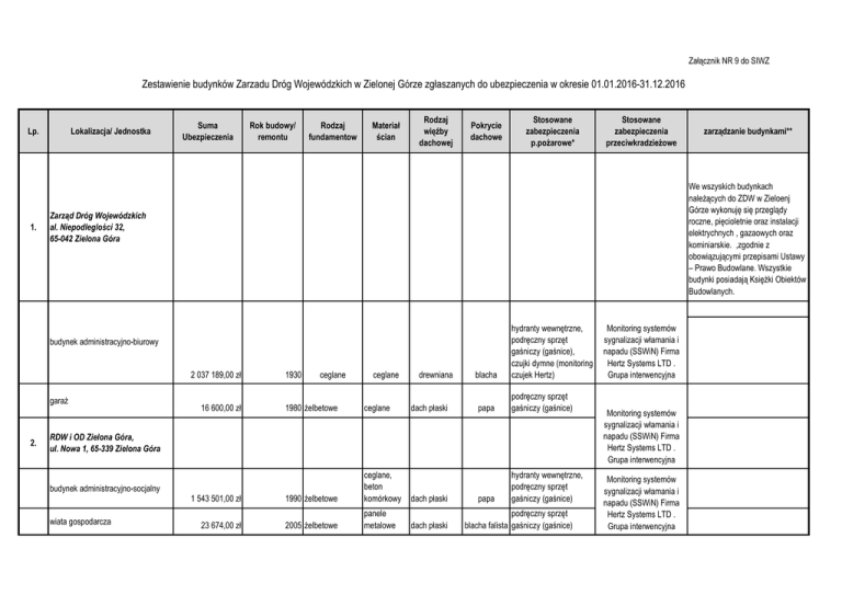 Załącznik NR 9 do SIWZ Zestawienie budynków Zarzadu Dróg Wojewódzkich w Zielonej Górze zgłaszanych do ubezpieczenia w okresie 01.01.2016-31.12.2016 Lp. 1. Lokalizacja/ Jednostka Suma Ubezpieczenia Rok budowy/ remontu Rodzaj fundamentow Materiał ścian Rodzaj więźby dachowej Pokrycie dachowe Stosowane zabezpieczenia przeciwkradzieżowe Zarząd Dróg Wojewódzkich al. Niepodleglości 32, 65-042 Zielona Góra 2 037 189,00 zł garaż 16 600,00 zł 1930 ceglane ceglane drewniana 1980 żelbetowe ceglane dach płaski 1 543 501,00 zł 1990 żelbetowe ceglane, beton komórkowy dach płaski 23 674,00 zł 2005 żelbetowe panele metalowe dach płaski blacha hydranty wewnętrzne, podręczny sprzęt gaśniczy (gaśnice), czujki dymne (monitoring czujek Hertz) papa podręczny sprzęt gaśniczy (gaśnice) papa hydranty wewnętrzne, podręczny sprzęt gaśniczy (gaśnice) RDW i OD Zielona Góra, ul. Nowa 1, 65-339 Zielona Góra budynek administracyjno-socjalny wiata gospodarcza zarządzanie budynkami** We wszyskich budynkach należących do ZDW w Zieloenj Górze wykonuję się przeglądy roczne, pięcioletnie oraz instalacji elektrychnych , gazaowych oraz kominiarskie. ,zgodnie z obowiązującymi przepisami Ustawy – Prawo Budowlane. Wszystkie budynki posiadają Księżki Obiektów Budowlanych. budynek administracyjno-biurowy 2. Stosowane zabezpieczenia p.pożarowe* podręczny sprzęt blacha falista gaśniczy (gaśnice) Monitoring systemów sygnalizacji włamania i napadu (SSWiN) Firma Hertz Systems LTD . Grupa interwencyjna Monitoring systemów sygnalizacji włamania i napadu (SSWiN) Firma Hertz Systems LTD . Grupa interwencyjna Monitoring systemów sygnalizacji włamania i napadu (SSWiN) Firma Hertz Systems LTD . Grupa interwencyjna 3. Obwód Drogowy Bobrowice, Bobrowice 115, 66-627 Bobrowice budynek biurowy wiata (magazyn) magazyn soli 4. 348 830,00 zł 1980 żelbetowe ceglane 61 648,00 zł 1980 żelbetowe blacha falista stalowa 635 376,00 zł po 2000 żelbetowe żelbetowe i kostrukcja drewiana drewniana drewniana podręczny sprzęt blacha falista gaśniczy (gaśnica) gont podręczny sprzęt bitumiczny gaśniczy (gaśnica) Monitoring systemów sygnalizacji włamania i napadu (SSWiN) Firma Hertz Systems LTD . brak ochrony Obwód Drogowy Babimost, ul. Towarowa 4, 66-100 Babimost żelbetowe ceramika drewniana blachodacho podręczny sprzęt wka gasniczy (gaśnice) 282 884,00 zł po 2000 żelbetowe ceramika drewniana blachodacho podręczny sprzęt wka gasniczy (gaśnica) brak ochrony żelbetowe żelbetowe konstrukcja stalowa stalowa podręczny sprzęt blacha falista gaśniczy (gaśnica) brak ochrony budynek garażowy z wiatą magazyn soli 857 692,00 zł po 2000 RDW i OD Kożuchów, ul. Szprotawska 30, 67-120 Kożuchów budynek administracyjno-socjalny budynek magazynowo-warszatowy poczekalnia -Prom Bytom Odrzański Monitoring systemów sygnalizacji włamania i napadu (SSWiN) Firma Hertz Systems LTD . 490 289,00 zł po 2000 budynek-baza 5. podręczny sprzęt ceramiczne gaśniczy (gaśnice), Monitoring systemów sygnalizacji włamania i napadu (SSWiN) Firma Hertz Systems LTD . 359 630,00 zł 1980 żelbetowe murowane dach płaski papa podręczny sprzęt gaśniczy (gaśnice) 344 100,00 zł 1980 żelbetowe murowane dach płaski papa podręczny sprzęt gaśniczy (gaśnica) brak ochrony 4 117,00 zł 1980 żelbetowe murowane dach płaski papa podręczny sprzęt gaśniczy (gaśnica) brak ochrony magazyn soli 6. Obwód Drogowy Sława, Kolonia 4, 67-410 Sława 256 810,00 zł 1980 żelbetowe garaż dwustanowiskowy podręczny sprzęt blacha falista gaśniczy (gaśnica) podręczny sprzęt gaśniczy (gaśnice) murowane dach płaski papa podręczny sprzęt gaśniczy (gaśnice) 165 677,00 zł 2010 żelbetowe murowane dach płaski papa podręczny sprzęt gaśniczy (gaśnica) brak ochrony 2009 żelbetowe żelbetowe i kostrukcja drewiana drewniana gont podręczny sprzęt bitumiczny gaśniczy (gaśnica) brak ochrony Obwód Drogowy Żagań, ul. Lotników Alianckich 27B, 68100 Żagań budynek magazynowy z wiatą magazyn soli 589 469,00 zł po 2000 269 925,00 zł 639 524,00 zł po 2000 żelbetowe 1980 żelbetowe żelbetowe magazyn soli magazyn materiałów sypkich Monitoring systemów sygnalizacji włamania i napadu (SSWiN) Firma Hertz Systems LTD . Grupa interwencyjna ceramika drewniana blachodacho podręczny sprzęt wka gaśniczy (gaśnice) stalowa stalowa podręczny sprzęt blacha falista gaśniczy (gaśnica) brak ochrony żelbetowe i kostrukcja drewiana drewniana gont podręczny sprzęt bitumiczny gaśniczy (gaśnica) brak ochrony Obwód Drogowy Lubsko, ul. Kolejowa 27, 68-300 Lubsko budynek administracyjno-socjalny Monitoring systemów sygnalizacji włamania i napadu (SSWiN) Firma Hertz Systems LTD . 1990 żelbetowe 738 390,00 zł budynek administracyjno-socjalny brak ochrony 331 673,00 zł magazyn soli 8. drewniana ul. budynek warsztatowo-socjalny 7. żelbetowe konstrukcja stalowa Monitoring systemów sygnalizacji włamania i napadu (SSWiN) Firma Hertz Systems LTD . żelbetowe ceramika drewniana blachodacho podręczny sprzęt wka gaśniczy (gaśnice) 635 254,00 zł po 2000 żelbetowe żelbetowe i kostrukcja drewiana drewniana gont podręczny sprzęt bitumiczny gaśniczy (gaśnica) brak ochrony 134 167,00 zł po 2000 żelbetowe ceramika drewniana blachodacho podręczny sprzęt wka gaśniczy (gaśnica) brak ochrony 1 260 324,00 zł po 2000 9. OD Sulęcin, ul. Daszyńskiego 49, 69-200 Sulęcin budynek administracyjny 74 260,00 zł po 1980 żelbetowe ceramika dach płaski papa bydunek administracyjno-socjalny 326 387,00 zł po 1980 magazyn soli wraz z infrastrukturą techniczną (wiata stalowa) 1 195 622,95 zł 10. żelbetowe ceramika dach płaski żelbetowa żelbetowa drewniana blacha trapezowa jednospadowy 2015 papa panele drewniane Hydranty wewnętrzne, podręczny sprzęt gaśniczy (gaśnice) Monitoring systemów sygnalizacji włamania i napadu (SSWiN) Firma Hertz Systems LTD . Grupa interwencyjna podręczny sprz