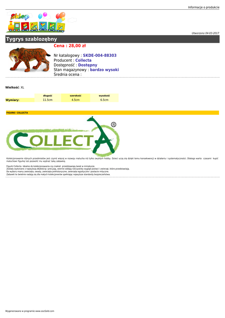 Informacje o produkcie Utworzono 04-03-2017 Tygrys szablozębny Cena : 28,00 zł Nr katalogowy : SKDE-004-88303 Producent : Collecta Dostępność : Dostępny Stan magazynowy : bardzo wysoki Średnia ocena : Wielkość: XL Wymiary: długość szerokość wysokość 11.5cm 4.5cm 6.5cm FIGURKI COLLECTA Kolekcjonowanie różnych przedmiotów jest czymś więcej w rozwoju malucha niż tylko zwykłym hobby. Dzieci uczą się dzięki temu konsekwencji w działaniu i systematyczności. Dlatego warto czasami kupić maluchowi figurkę lub pozwolić mu wybrać taką zabawkę. Figurki Collecta idealne do kolekcjonowania czy makiet przedstawiają świat w miniaturze. Zostały wykonane z najwyższą dbałością i precyzją, wiernie oddają rzeczywisty wygląd postaci i zwierząt, które przedstawiają. Do wyboru mamy zwierzęta, owady, zwierzęta prehistoryczne, zwierzęta egzotyczne i postacie mityczne. Zabawki te świetnie nadają się dla małych kolekcjonerów spełniając najwyższe standardy bezpieczeństwa. Wygenerowano w programie www.oscGold.com
