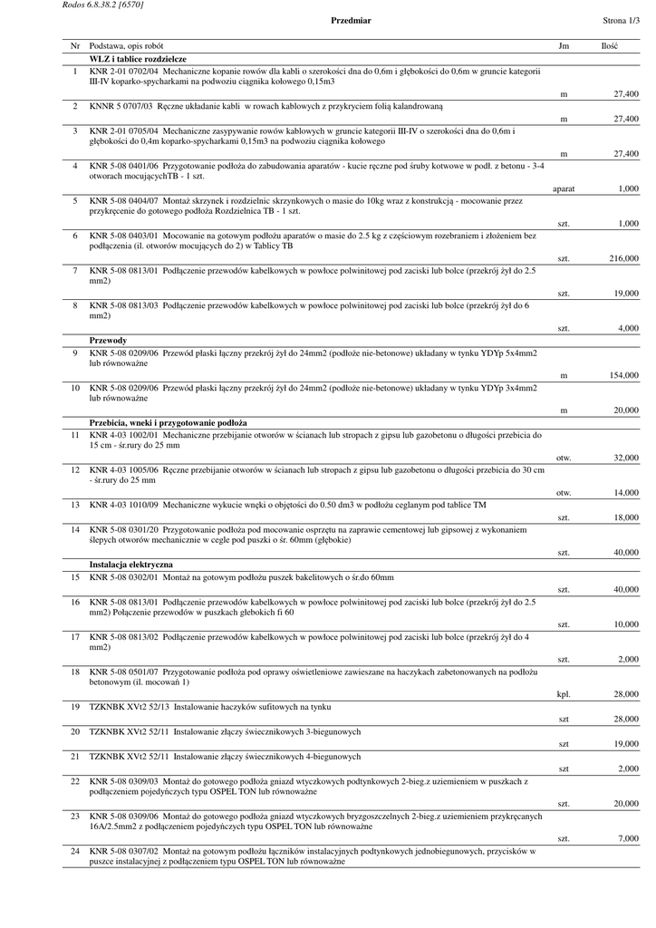 Rodos 6.8.38.2 [6570] Przedmiar Nr 1 Podstawa, opis robót WLZ i tablice rozdzielcze KNR 2-01 0702/04 Mechaniczne kopanie rowów dla kabli o szerokości dna do 0,6m i głębokości do 0,6m w gruncie kategorii III-IV koparko-spycharkami na podwoziu ciągnika kołowego 0,15m3 2 KNNR 5 0707/03 Ręczne układanie kabli w rowach kablowych z przykryciem folią kalandrowaną 3 KNR 2-01 0705/04 Mechaniczne zasypywanie rowów kablowych w gruncie kategorii III-IV o szerokości dna do 0,6m i głębokości do 0,4m koparko-spycharkami 0,15m3 na podwoziu ciągnika kołowego 4 KNR 5-08 0401/06 Przygotowanie podłoża do zabudowania aparatów - kucie ręczne pod śruby kotwowe w podł. z betonu - 3-4 otworach mocującychTB - 1 szt. 5 KNR 5-08 0404/07 Montaż skrzynek i rozdzielnic skrzynkowych o masie do 10kg wraz z konstrukcją - mocowanie przez przykręcenie do gotowego podłoża Rozdzielnica TB - 1 szt. 6 KNR 5-08 0403/01 Mocowanie na gotowym podłożu aparatów o masie do 2.5 kg z częściowym rozebraniem i złożeniem bez podłączenia (il. otworów mocujących do 2) w Tablicy TB 7 KNR 5-08 0813/01 Podłączenie przewodów kabelkowych w powłoce polwinitowej pod zaciski lub bolce (przekrój żył do 2.5 mm2) 8 KNR 5-08 0813/03 Podłączenie przewodów kabelkowych w powłoce polwinitowej pod zaciski lub bolce (przekrój żył do 6 mm2) 9 10 11 Jm Ilość m 27,400 m 27,400 m 27,400 aparat 1,000 szt. 1,000 szt. 216,000 szt. 19,000 szt. 4,000 m 154,000 m 20,000 otw. 32,000 otw. 14,000 szt. 18,000 szt. 40,000 szt. 40,000 szt. 10,000 szt. 2,000 kpl. 28,000 szt 28,000 szt 19,000 szt 2,000 szt. 20,000 szt. 7,000 Przewody KNR 5-08 0209/06 Przewód płaski łączny przekrój żył do 24mm2 (podłoże nie-betonowe) układany w tynku YDYp 5x4mm2 lub równoważne KNR 5-08 0209/06 Przewód płaski łączny przekrój żył do 24mm2 (podłoże nie-betonowe) układany w tynku YDYp 3x4mm2 lub równoważne Przebicia, wneki i przygotowanie podłoża KNR 4-03 1002/01 Mechaniczne przebijanie otworów w ścianach lub stropach z gipsu lub gazobetonu o długości przebicia do 15 cm - śr.rury do 25 mm 12 KNR 4-03 1005/06 Ręczne przebijanie otworów w ścianach lub stropach z gipsu lub gazobetonu o długości przebicia do 30 cm - śr.rury do 25 mm 13 KNR 4-03 1010/09 Mechaniczne wykucie wnęki o objętości do 0.50 dm3 w podłożu ceglanym pod tablice TM 14 KNR 5-08 0301/20 Przygotowanie podłoża pod mocowanie osprzętu na zaprawie cementowej lub gipsowej z wykonaniem ślepych otworów mechanicznie w cegle pod puszki o śr. 60mm (głębokie) 15 Strona 1/3 Instalacja elektryczna KNR 5-08 0302/01 Montaż na gotowym podłożu puszek bakelitowych o śr.do 60mm 16 KNR 5-08 0813/01 Podłączenie przewodów kabelkowych w powłoce polwinitowej pod zaciski lub bolce (przekrój żył do 2.5 mm2) Połączenie przewodów w puszkach głebokich fi 60 17 KNR 5-08 0813/02 Podłączenie przewodów kabelkowych w powłoce polwinitowej pod zaciski lub bolce (przekrój żył do 4 mm2) 18 KNR 5-08 0501/07 Przygotowanie podłoża pod oprawy oświetleniowe zawieszane na haczykach zabetonowanych na podłożu betonowym (il. mocowań 1) 19 TZKNBK XVt2 52/13 Instalowanie haczyków sufitowych na tynku 20 TZKNBK XVt2 52/11 Instalowanie złączy świecznikowych 3-biegunowych 21 TZKNBK XVt2 52/11 Instalowanie złączy świecznikowych 4-biegunowych 22 KNR 5-08 0309/03 Montaż do gotowego podłoża gniazd wtyczkowych podtynkowych 2-bieg.z uziemieniem w puszkach z podłączeniem pojedyńczych typu OSPEL TON lub równoważne 23 KNR 5-08 0309/06 Montaż do gotowego podłoża gniazd wtyczkowych bryzgoszczelnych 2-bieg.z uziemieniem przykręcanych 16A/2.5mm2 z podłączeniem pojedyńczych typu OSPEL TON lub równoważne 24 KNR 5-08 0307/02 Montaż na gotowym podłożu łączników instalacyjnych podtynkowych jednobiegunowych, przycisków w puszce instalacyjnej z podłączeniem typu OSPEL TON lub równoważne Rodos 6.8.38.2 [6570] Przedmiar Nr Podstawa, opis robót 25 KNR 5-08 0307/03 Montaż na gotowym podłożu łączników instalacyjnych podtynkowych świecznikowych w puszce instalacyjnej z podłączeniem typu OSPEL TON lub równoważne 26 KNR 5-08 0310/07 Montaż gniazda bryzgoszczelnego 400V z uziemieniem 3-bieg. 16A/4mm2 IP44 27 KNR 5-08 0307/04 Montaż na gotowym podłożu łączników instalacyjnych podtynkowych schodowych, dwubiegunowych w puszce instalacyjnej z podłączeniem typu OSPEL TON lub równoważne 28 KNR 5-08 0307/02 Montaż na gotowym podłożu przycisków dzwonkowych podtynkowych jednobiegunowych, przycisków w puszce instalacyjnej z podłączeniem typu OSPEL TON lub równoważne 29 KNR 5-08 0307/02 Montaz ramek do osprzętu typu OSPEL TON lub równoważne 30 KNR 5-08 0209/02 Przewod wtynkowy łączny przekrój żył do 7.5mm2 (podłoże nie-beton.) układany w tynku 31 KNR 5-08 0502/04 Przygotowanie podłoża gips, gazobeton pod oprawy oświetleniowe mocowane na kołkach rozporowych plastykowych - 4 mocowania 32 KNR 5-08 0512/02 Montaż na gotowym podłożu opraw ledowych 33 KNR 5-08 0512/05 Montaż na gotowym podłożu opraw ledowych 34 KNR 4-03 1201/02 Przedzwonienie brzęczykiem przewodów po otynkowaniu 35 Instalacja połączeń wyrównawczych KNR 5-08 0602/03 Układanie bednarki uziemiającej w budynkach w ciągach poziomych na wspornikach mocowanych na cegle z kuciem mechanicznym- przekrój bednarki do 120mm2 Pomieszczenie pompy ciepła- instalacja wyrównawacza główna 36 KNR 5-08 0620/01 Montaż na rurach uchwytów uziemiających skręcanych śr. do 100mm 37 KNR 5-08 0204/04 Przewody izolowane jednożyłowe o przekroju żyły do 10 mm2 DYżo 1x4mm lub rownoważne 38 KNR 5-08 0619/05 Montaz zacisków uziemiających miejscowych 39 Instalacja odgromowa KNR 5-08 0604/04 Montaż zwodów poziomych nienaprężanych z pręta o śr.do 10mm na dachu płaskim na wspornikach klejonych 40 KNR 5-08 0101/03 Montaż uchwytów pod rury winidurowe układane pojedynczo z przygotowaniem podłoża mechanicznie przykręcenie do kołków plastykowych w