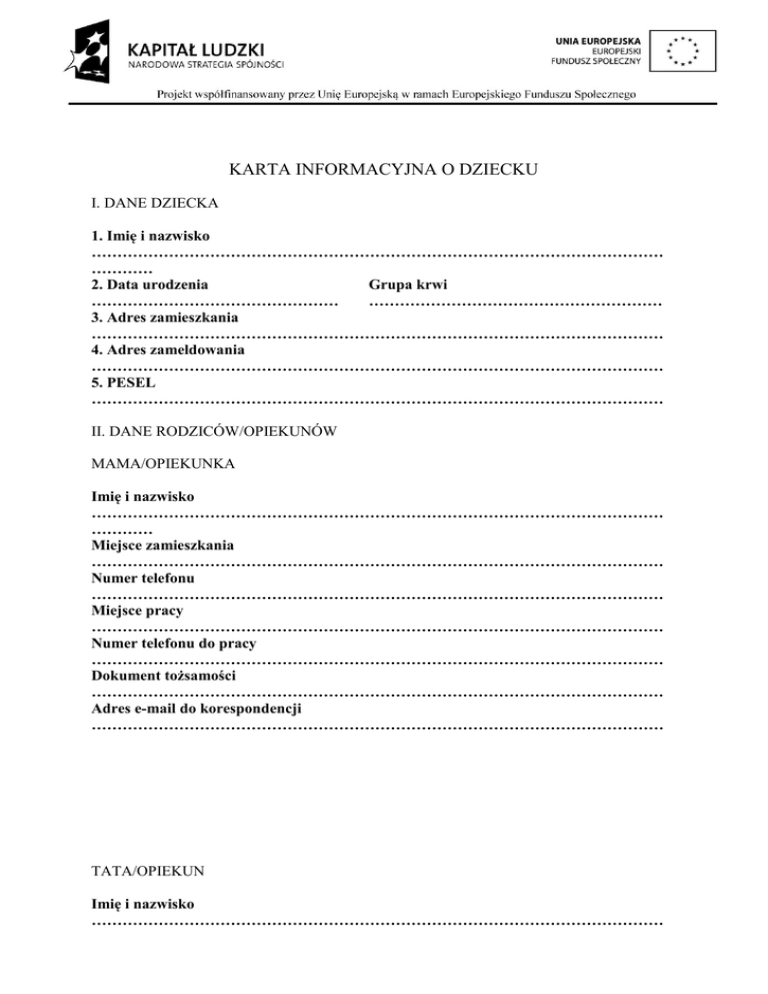 KARTA INFORMACYJNA O DZIECKU I. DANE DZIECKA 1. Imię i nazwisko ………………………………………………………………………………………………… ………… 2. Data urodzenia Grupa krwi ………………………………………… ………………………………………………… 3. Adres zamieszkania ………………………………………………………………………………………………… 4. Adres zameldowania ………………………………………………………………………………………………… 5. PESEL ………………………………………………………………………………………………… II. DANE RODZICÓW/OPIEKUNÓW MAMA/OPIEKUNKA Imię i nazwisko ………………………………………………………………………………………………… ………… Miejsce zamieszkania ………………………………………………………………………………………………… Numer telefonu ………………………………………………………………………………………………… Miejsce pracy ………………………………………………………………………………………………… Numer telefonu do pracy ………………………………………………………………………………………………… Dokument tożsamości ………………………………………………………………………………………………… Adres e-mail do korespondencji ………………………………………………………………………………………………… TATA/OPIEKUN Imię i nazwisko ………………………………………………………………………………………………… Miejsce zamieszkania ………………………………………………………………………………………………… Numer telefonu ………………………………………………………………………………………………… Miejsce pracy ………………………………………………………………………………………………… Numer telefonu do pracy ………………………………………………………………………………………………… Dokument tożsamości ………………………………………………………………………………………………… Adres e-mail do korespondencji ………………………………………………………………………………………………… III. INFORMACJE O DZIECKU 1. Ulubione zajęcie dziecka: ………………………………………………………………………………………………… 2. Ulubione potrawy dziecka: ………………………………………………………………………………………………… 3. Czego dziecko nie lubi jeść? ………………………………………………………………………………………………… 4. Czy są sytuacje, których dziecko nie lubi bądź boi się? …………………………………………………………………………………………………\ IV. DANE NA TEMAT ZDROWIA DZIECKA 1. Alergie i uczulenia (w tym na środki spożywcze): ………………………………………………………………………………………………… ………………………………………………………………………………………………… 2. Przebyte choroby zakaźne: ………………………………………………………………………………………………… ………………………………………………………………………………………………… 3. Czy pozostaje pod opieką specjalisty? Z jakiego powodu? ………………………………………………………………………………………………… ………………………………………………………………………………………………… 4. Zalecenia lekarzy: ………………………………………………………………………………………………… ………………………………………………………………………………………………… 5. Zalecenia dotyczące diety ………………………………………………………………………………………………… ………………………………………………………………………………………………… V. DEKLARACJA RODZICA OPIEKUNA 1. Dziecko będzie przebywało w Żłobku w godzinach ……… ………… 2. Zostałem poinformowany, że podczas pobytu dziecka w Żłobku bez zalecenia lekarza, nie mogą być podawane żadne leki. 3. Wyrażam zgodę na dokonywanie czynności pielęgnacyjnych przy moim dziecku oraz wyrażanie czułości poprzez przytulanie, głaskanie, tulenie do snu. 4. Wyrażam / nie wyrażam zgodę na fotografowanie mojego dziecka oraz umieszczanie jego zdjęć w galerii Żłobka „Kubuś i Przyjaciele” 5. Następujące osoby pełnoletnie upoważniam do odbioru mojego dziecka ze Żłobka „Kubuś i Przyjaciele” Imię i nazwisko Pokrewieństwo Dokument tożsamości Telefon 1………………………………………………………………………………………….. 2…………………………………………………………………………………………. 3…………………………………………………………………………………………. Data…………………………….Czytelny podpis……………………………………………