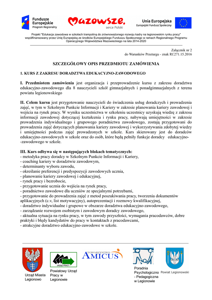 Projekt "Edukacja zawodowa w szkołach trampoliną do zrównoważonego rozwoju kadry na legionowskim rynku pracy" współfinansowany przez Unię Europejską ze środków Europejskiego Funduszu Społecznego w ramach Regionalnego Programu Operacyjnego Województwa Mazowieckiego na lata 2014-2020 Załącznik nr 2 do Warunków Przetargu - znak Rf.271.15.2016 SZCZEGÓŁOWY OPIS PRZEDMIOTU ZAMÓWIENIA 1. KURS Z ZAKRESU DORADZTWA EDUKACYJNO-ZAWODOWEGO I. Przedmiotem zamówienia jest organizacja i przeprowadzenie kursu z zakresu doradztwa edukacyjno-zawodowego dla 8 nauczycieli szkół gimnazjalnych i ponadgimnazjalnych z terenu powiatu legionowskiego II. Celem kursu jest przygotowanie nauczycieli do świadczenia usług doradczych i prowadzenia zajęć, w tym w Szkolnym Punkcie Informacji i Kariery w zakresie planowania kariery zawodowej i wejścia na rynek pracy. W wyniku uczestnictwa w szkoleniu uczestnicy uzyskują wiedzę z zakresu informacji zawodowej dotyczącej kształcenia i rynku pracy, nabywają umiejętności w zakresie prowadzenia indywidualnego i grupowego poradnictwa zawodowego, zostają przygotowani do prowadzenia zajęć dotyczących planowania kariery zawodowej i wykorzystywania zdobytej wiedzy i umiejętności podczas zajęć prowadzonych w szkole. Kurs skierowany jest do doradców edukacyjno-zawodowych w szkole oraz do osób, które będą pełniły funkcje doradcy edukacyjno-zawodowego w szkole. III. Kurs odbywa się w następujących blokach tematycznych: - metodyka pracy doradcy w Szkolnym Punkcie Informacji i Kariery, - coaching kariery w doradztwie zawodowym, - determinanty wyboru zawodu, - określanie preferencji i predyspozycji zawodowych ucznia, - planowanie kariery zawodowej i edukacyjnej, - rynek pracy i bezrobocie, - przygotowanie ucznia do wejścia na rynek pracy, - poradnictwo zawodowe dla uczniów ze specjalnymi potrzebami, - przygotowanie do prowadzenia zajęć z metod poszukiwania pracy, tworzenia dokumentów aplikacyjnych (c.v, list motywacyjny), autoprezentacji i rozmowy kwalifikacyjnej, - doradztwo indywidualne i grupowe w obszarze doradztwa edukacyjno-zawodowego, - zarządzanie rozwojem osobistym i zawodowym doradcy zawodowego, - aktualna sytuacja na rynku pracy, w tym zawody przyszłości, wymagania pracodawców, dobre praktyki i błędy kandydatów do pracy w kontaktach z pracodawcami, - atrakcyjne doradztwo edukacyjno-zawodowe w szkole. Urząd Miasta Legionowo Powiatowy Urząd Pracy w Legionowie Poradnia Psychologiczno - Pedagogiczna w Legionowie Projekt "Edukacja zawodowa w szkołach trampoliną do zrównoważonego rozwoju kadry na legionowskim rynku pracy" współfinansowany przez Unię Europejską ze środków Europejskiego Funduszu Społecznego w ramach Regionalnego Programu Operacyjnego Województwa Mazowieckiego na lata 2014-2020 IV. Forma zajęć. Zajęcia mają charakter warsztatowy (m.in. wykłady, symulacje, case study, ćwiczenia), przez co uczestnicy szkolenia nabywają praktyczne umiejętności niezbędne do świadczenia usług doradczych w SPInKa. Zajęcia praktyczne mają stanowić co najmniej 50% czasu przeznaczonego na kurs. V. Kadra prowadząca Wykonawca zapewni osobę lub osoby do przeprowadzenia warsztatu. Wymagania konieczne: • wykształcenie wyższe II stopnia na specjalności: doradztwo zawodowe lub ukończone studia podyplomowe z zakresu doradztwa zawodowego, • doświadczenie w prowadzeniu szkoleń z zakresu doradztwa edukacyjno-zawodowego na co najmniej łączną sumę 100 godzin z osobami dorosłymi, w tym minimum 30 godzin z dyrektorami szkół/radami pedagogicznymi/nauczycielami, • doświadczenie w prowadzeniu zajęć dydaktycznych i/lub konsultacji indywidualnych i/lub zajęć grupowych z obszaru doradztwa edukacyjno-zawodowego – łącznie minimum 30 godzin. Wykonawca na etapie składania oferty dostarczy dokumenty potwierdzające wykształcenie i doświadczenie zawodowe osoby lub osób prowadzących warsztat. VI. Warunki organizacji kursu. Czas trwania: co najmniej 32 jednostki lekcyjne, przy czym jednorazowo warsztat nie może trwać dłużej niż 8 jednostek lekcyjnych, a jednostka lekcyjna liczy 60 minut. Planowany termin: styczeń 2017 r. Lokalizacja: Legionowo Salę na potrzeby warsztatu zapewnia Zamawiający. Każdy z uczestników na koniec otrzymuje zaświadczenie potwierdzające udział w warsztatach. VII. Catering zapewnia Wykonawca. Catering obejmuje dostawę, przygotowanie i podanie w każdym dniu warsztatu: a) na 1 osobę podczas jednej przerwy.: • kawy (bez ograniczeń) – w termosach - wraz z dodatkami: śmietanką lub mleczkiem, cukrem, • herbaty (bez ograniczeń) – w termosach - wraz z dodatkami: cytryną, cukrem, • drobnych ciasteczek, paluszków – ok. 200 g, • wody mineralnej – ok. 0,25 l, b) ciepłego posiłku dla każdego uczestnika składającego się z dania obiadowego w formie: Urząd Miasta Legionowo Powiatowy Urząd Pracy w Legionowie Poradnia Psychologiczno - Pedagogiczna w Legionowie Projekt "Edukacja zawodowa w szkołach trampoliną do zrównoważonego rozwoju kadry na legionowskim rynku pracy" współfinansowany przez Unię Europejską ze środków Europejskiego Funduszu Społecznego w ramach Regionalnego Programu Operacyjnego Województwa Mazowieckiego na lata 2014-2020 • • - danie mięsne: ziemniaki lub zamiennie: makaron, ryż, kasza – min. 200 g na osobę, mięso – min. 150 g na osobę, surówka lub warzywa gotowane – min. 150 g na osobę lub - danie bezmięsne: ziemniaki lub zamiennie: makaron, ryż, kasza – 200 g na osobę, ryba – 150 g na osobę, surówka – 150 g na osobę. Wykonawca zapewnia niezbędne sprzęty, nakrycia stołów i ich dekorację, naczynia szklane i porcelanowe oraz sztućce w wystarczającej ilości, transport oraz obsługę kelnerską. Wykorzystanie naczyń i sztućców jednorazowego użytku jest wykluczone. 2. WARSZTAT Z TECHNIK ZAWODOWYCH UCZNIÓW DIAGNOZOWANIA I ROZWIJANIA PREDYSPOZYCJI I. Przedmiotem zamówienia jest organizacj
