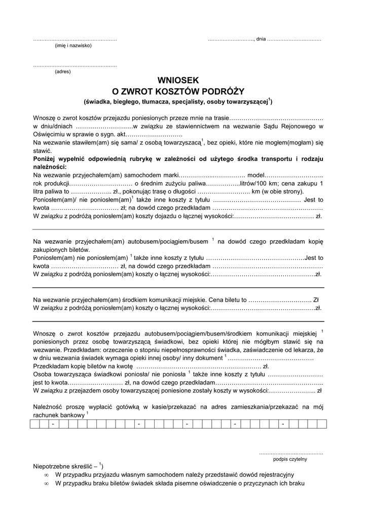 …………………………………………… (imię i nazwisko) ………………………., dnia …………………………… …………………………………………… (adres) WNIOSEK O ZWROT KOSZTÓW PODRÓŻY 1 (świadka, biegłego, tłumacza, specjalisty, osoby towarzyszącej ) Wnoszę o zwrot kosztów przejazdu poniesionych przeze mnie na trasie………………………………………. w dniu/dniach ……………………….w związku ze stawiennictwem na wezwanie Sądu Rejonowego w Oświęcimiu w sprawie o sygn. akt………………………. 1 Na wezwanie stawiłem(am) się sama/ z osobą towarzyszacą , bez opieki, które nie mogłem(mogłam) się stawić. Poniżej wypełnić odpowiednią rubrykę w zależności od użytego środka transportu i rodzaju należności: Na wezwanie przyjechałem(am) samochodem marki……………..……………. model……………………….. rok produkcji…………………………. o średnim zużyciu paliwa……………..litrów/100 km; cena zakupu 1 litra paliwa to ……………….. zł., pokonując trasę o długości …………………….. km (w obie strony). 1 Poniosłem(am)/ nie poniosłem(am) także inne koszty z tytułu ……………………………………. Jest to kwota …………………………… zł; na dowód czego przedkładam ……………………………………………… W związku z podróżą poniosłem(am) koszty dojazdu o łącznej wysokości:………………………………… zł. 1 Na wezwanie przyjechałem(am) autobusem/pociągiem/busem na dowód czego przedkładam kopię zakupionych biletów. 1 Poniosłem(am) nie poniosłem(am) także inne koszty z tytułu …………………………………………Jest to kwota …………………………… zł, na dowód czego przedkładam ……………………………………………… W związku z podróżą poniosłem(am) koszty o łącznej wysokości:……………………………………………zł. Na wezwanie przyjechałem(am) środkiem komunikacji miejskie. Cena biletu to …………………………. Zł W związku z podróżą poniosłem(am) koszty o łącznej wysokości:……………………………………………zł. 1 Wnoszę o zwrot kosztów przejazdu autobusem/pociągiem/busem/środkiem komunikacji miejskiej poniesionych przez osobę towarzyszącą świadkowi, bez opieki której nie mógłbym stawić się na wezwanie. Przedkładam: orzeczenie o stopniu niepełnosprawności świadka, zaświadczenie od lekarza, że 1 w dniu wezwania świadek wymaga opieki innej osoby/ inny dokument …………………………………… Przedkładam kopię biletów na kwotę ……………………………………………………. zł. 1 Osoba towarzysząca świadkowi poniosła/ nie poniosła także inne koszty z tytułu ……………………… jest to kwota……………………… zł, na dowód czego przedkładam…………………………………………….. W związku z przejazdem osoby towarzyszącej poniesione zostały koszty w wysokości:………………….. zł Należność proszę wypłacić gotówką w kasie/przekazać na adres zamieszkania/przekazać na mój 1 rachunek bankowy - ………………………………… podpis czytelny 1 Niepotrzebne skreślić – ) • W przypadku przyjazdu własnym samochodem należy przedstawić dowód rejestracyjny • W przypadku braku biletów świadek składa pisemne oświadczenie o przyczynach ich braku