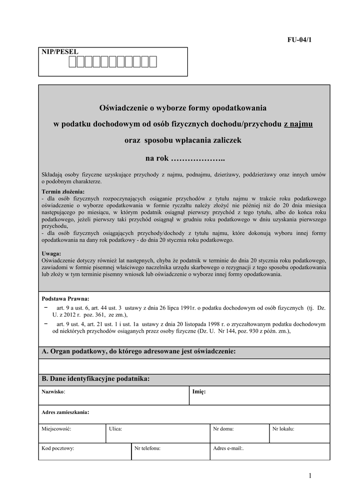 FU-04/1 NIP/PESEL Oświadczenie o wyborze formy opodatkowania w podatku dochodowym od osób fizycznych dochodu/przychodu z najmu oraz sposobu wpłacania zaliczek na rok ……………….. Składają osoby fizyczne uzyskujące przychody z najmu, podnajmu, dzierżawy, poddzierżawy oraz innych umów o podobnym charakterze. Termin złożenia: - dla osób fizycznych rozpoczynających osiąganie przychodów z tytułu najmu w trakcie roku podatkowego oświadczenie o wyborze opodatkowania w formie ryczałtu należy złożyć nie później niż do 20 dnia miesiąca następującego po miesiącu, w którym podatnik osiągnął pierwszy przychód z tego tytułu, albo do końca roku podatkowego, jeżeli pierwszy taki przychód osiągnął w grudniu roku podatkowego w dniu uzyskania pierwszego przychodu, - dla osób fizycznych osiągających przychody/dochody z tytułu najmu, które dokonują wyboru innej formy opodatkowania na dany rok podatkowy - do dnia 20 stycznia roku podatkowego. Uwaga: Oświadczenie dotyczy również lat następnych, chyba że podatnik w terminie do dnia 20 stycznia roku podatkowego, zawiadomi w formie pisemnej właściwego naczelnika urzędu skarbowego o rezygnacji z tego sposobu opodatkowania lub złoży w tym terminie pisemny wniosek lub oświadczenie o wyborze innej formy opodatkowania. Podstawa Prawna: − art. 9 a ust. 6, art. 44 ust. 3 ustawy z dnia 26 lipca 1991r. o podatku dochodowym od osób fizycznych (tj. Dz. U. z 2012 r. poz. 361, ze zm.), − art. 9 ust. 4, art. 21 ust. 1 i ust. 1a ustawy z dnia 20 listopada 1998 r. o zryczałtowanym podatku dochodowym od niektórych przychodów osiąganych przez osoby fizyczne (Dz. U. Nr 144, poz. 930 z późn. zm.), A. Organ podatkowy, do którego adresowane jest oświadczenie: B. Dane identyfikacyjne podatnika: Nazwisko: Imię: Adres zamieszkania : Miejscowość: Kod pocztowy: Ulica: Nr domu: Nr telefonu: Nr lokalu: Adres e-mail:. 1 C. Dane dotyczące przedmiotu najmu: Przedmiot najmu: Data rozpoczęcia najmu: Data uzyskania pierwszego przychodu: D. Oświadczenie o formie opodatkowania: Oświadczam , ze począwszy od roku ………………… rozliczenie w podatku dochodowym od osób fizycznych wybieram w formie (należy zaznaczyć właściwy kwadrat): □ ryczałtu od przychodów ewidencjonowanych, □ zasad ogólnych (wg skali podatkowej określonej w art. 27 ustawy o p. d. o .f.), E. Sposób wpłacania zaliczek: (wypełniają wyłącznie podatnicy, którzy wybrali ryczałt od przychodów ewidencjonowanych) □ podatek płatny miesięcznie □ podatek płatny kwartalnie F. Zmiana właściwości urzędu skarbowego: Poprzednio, właściwy Naczelnik Urzędu Skarbowego G. Oświadczenie i podpis podatnika: Oświadczam, że spełniam warunki do wyboru wskazanej w niniejszym formularzu formy opodatkowania oraz sposobu wpłacania zaliczek. Imię i nazwisko Data, podpis H. Podpis osoby reprezentującej podatnika: Imię i nazwisko Data, podpis 2