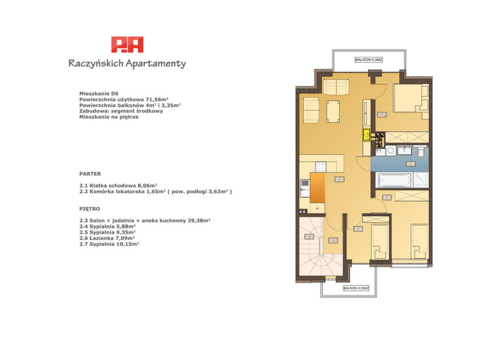 Mieszkanie D6 Powierzchnia użytkowa 71,56m2 Powierzchnia balkonów 4m2 i 3,35m2 Zabudowa: segment środkowy Mieszkanie na piętrze PARTER 2.1 Klatka schodowa 8,06m2 2.2 Komórka lokatorska 1,65m2 ( pow. podłogi 3,63m2 ) PIĘTRO 2.3 2.4 2.5 2.6 2.7 Salon + jadalnia + aneks kuchenny 29,38m2 Sypialnia 5,88m2 Sypialnia 9,35m2 Łazienka 7,09m2 Sypialnia 10,15m2 Piętro D8 D6 D4 D2