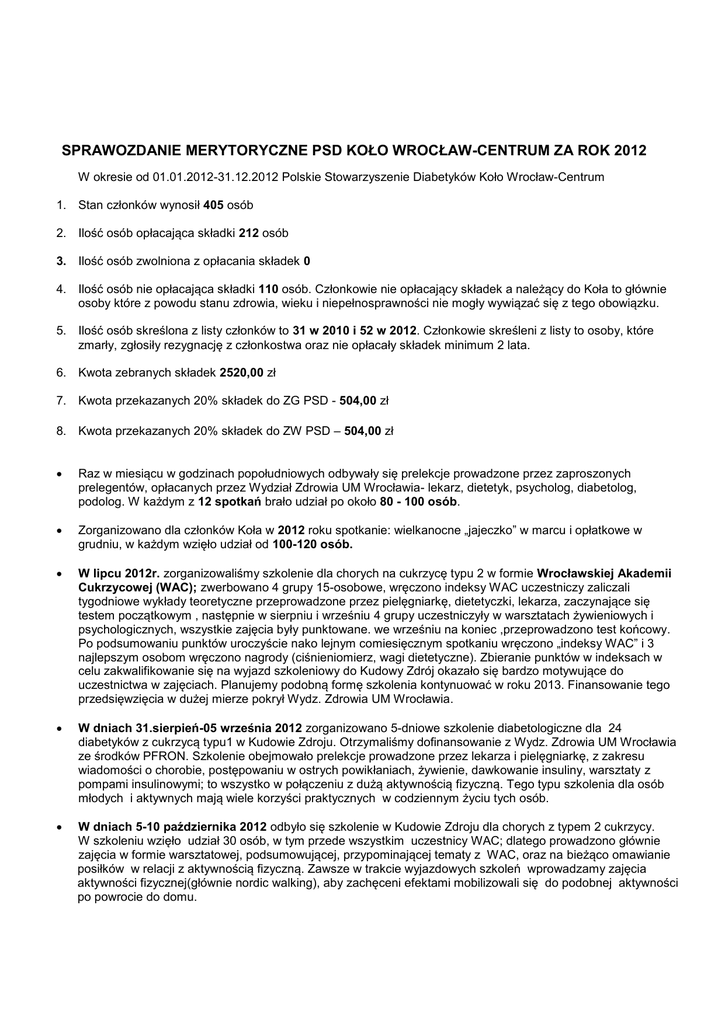 SPRAWOZDANIE MERYTORYCZNE PSD KOŁO WROCŁAW-CENTRUM ZA ROK 2012 W okresie od 01.01.2012-31.12.2012 Polskie Stowarzyszenie Diabetyków Koło Wrocław-Centrum 1. Stan członków wynosił 405 osób 2. Ilość osób opłacająca składki 212 osób 3. Ilość osób zwolniona z opłacania składek 0 4. Ilość osób nie opłacająca składki 110 osób. Członkowie nie opłacający składek a należący do Koła to głównie osoby które z powodu stanu zdrowia, wieku i niepełnosprawności nie mogły wywiązać się z tego obowiązku. 5. Ilość osób skreślona z listy członków to 31 w 2010 i 52 w 2012. Członkowie skreśleni z listy to osoby, które zmarły, zgłosiły rezygnację z członkostwa oraz nie opłacały składek minimum 2 lata. 6. Kwota zebranych składek 2520,00 zł 7. Kwota przekazanych 20% składek do ZG PSD - 504,00 zł 8. Kwota przekazanych 20% składek do ZW PSD – 504,00 zł Raz w miesiącu w godzinach popołudniowych odbywały się prelekcje prowadzone przez zaproszonych prelegentów, opłacanych przez Wydział Zdrowia UM Wrocławia- lekarz, dietetyk, psycholog, diabetolog, podolog. W każdym z 12 spotkań brało udział po około 80 - 100 osób. Zorganizowano dla członków Koła w 2012 roku spotkanie: wielkanocne „jajeczko” w marcu i opłatkowe w grudniu, w każdym wzięło udział od 100-120 osób. W lipcu 2012r. zorganizowaliśmy szkolenie dla chorych na cukrzycę typu 2 w formie Wrocławskiej Akademii Cukrzycowej (WAC); zwerbowano 4 grupy 15-osobowe, wręczono indeksy WAC uczestniczy zaliczali tygodniowe wykłady teoretyczne przeprowadzone przez pielęgniarkę, dietetyczki, lekarza, zaczynające się testem początkowym , następnie w sierpniu i wrześniu 4 grupy uczestniczyły w warsztatach żywieniowych i psychologicznych, wszystkie zajęcia były punktowane. we wrześniu na koniec ,przeprowadzono test końcowy. Po podsumowaniu punktów uroczyście nako lejnym comiesięcznym spotkaniu wręczono „indeksy WAC” i 3 najlepszym osobom wręczono nagrody (ciśnieniomierz, wagi dietetyczne). Zbieranie punktów w indeksach w celu zakwalifikowanie się na wyjazd szkoleniowy do Kudowy Zdrój okazało się bardzo motywujące do uczestnictwa w zajęciach. Planujemy podobną formę szkolenia kontynuować w roku 2013. Finansowanie tego przedsięwzięcia w dużej mierze pokrył Wydz. Zdrowia UM Wrocławia. W dniach 31.sierpień-05 września 2012 zorganizowano 5-dniowe szkolenie diabetologiczne dla 24 diabetyków z cukrzycą typu1 w Kudowie Zdroju. Otrzymaliśmy dofinansowanie z Wydz. Zdrowia UM Wrocławia ze środków PFRON. Szkolenie obejmowało prelekcje prowadzone przez lekarza i pielęgniarkę, z zakresu wiadomości o chorobie, postępowaniu w ostrych powikłaniach, żywienie, dawkowanie insuliny, warsztaty z pompami insulinowymi; to wszystko w połączeniu z dużą aktywnością fizyczną. Tego typu szkolenia dla osób młodych i aktywnych mają wiele korzyści praktycznych w codziennym życiu tych osób. W dniach 5-10 października 2012 odbyło się szkolenie w Kudowie Zdroju dla chorych z typem 2 cukrzycy. W szkoleniu wzięło udział 30 osób, w tym przede wszystkim uczestnicy WAC; dlatego prowadzono głównie zajęcia w formie warsztatowej, podsumowującej, przypominającej tematy z WAC, oraz na bieżąco omawianie posiłków w relacji z aktywnością fizyczną. Zawsze w trakcie wyjazdowych szkoleń wprowadzamy zajęcia aktywności fizycznej(głównie nordic walking), aby zachęceni efektami mobilizowali się do podobnej aktywności po powrocie do domu. 14.11.2012 o godz.14.00 zebraliśmy się pod pomnikiem Aleksandra Fredry z niebieskimi balonikami i utworzyliśmy „Niebieski Krąg” – symbol Światowego Dnia Walki z Cukrzycą. Również z naszej inicjatywy, tego dnia podświetlono o godz. 19.00 na niebiesko Stadion Miejski i dało to efekt niebiesko świecącego kręgu w ciemności; tak dołączyliśmy do innych miast na całym Świecie. 17.11.2012 r. z okazji Światowego Dnia Walki z Cukrzycą, PSD Koło Wrocław-Centrum zorganizowało we współpracy z Wydziałem Zdrowia Urzędu Miejskiego Wrocławia w hotelu SCANDIC VII Wrocławską Konferencję Szkoleniową dla Chorych na Cukrzycę pod tytułem „Powikłania cukrzycy - neurologiczne i oczne”. Wykłady wygłosiły Prof. Anna Noczyńska , i Dr hab..n. med. Jolanta Oficjalska oraz dietetyczka M. Grząbkowiak „Czy tłuszcze dają tylko tłuszcz!?”.W konferencji wzięło udział 230 diabetyków, którzy otrzymali materiały edukacyjne. Przygotowano stoiska, na których wystawione były produkty podzielone w porcjach odpowiadających wymiennikom węglowodanowym, a także różnego rodzaju dostępne w Polsce glukometry i peny. PSD Koło Wrocław-Centrum zorganizowało powyższe szkolenia i imprezy przy współfinansowaniu Wydz. Zdrowia UM Wrocławia głównie poprzez Wrocławskie Centrum Zdrowia oraz własnych posiadanych środków zebranych z wpłat 1% i darowizn. PSD Koło Wrocław-Centrum zakupiło z wpłat celowych 1% podatku pompę insulinową, oprzyrządowanie do pomp insulinowych, analogowe insuliny Lantus , Levemir, NovoRapid ,buty ortopedyczne szyte na miarę. Zarząd Koła PSD Wrocław-Centrum pełnił dyżury w każdy poniedziałek miesiąca w godz. 11.00-15.00 Sprawozdanie sporządziła Barbara Żebrowska