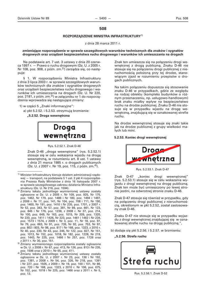Dziennik Ustaw Nr 89 — 5400 — Poz. 508 508 ROZPORZĄDZENIE MINISTRA INFRASTRUKTURY1) z dnia 28 marca 2011 r. zmieniające rozporządzenie w sprawie szczegółowych warunków technicznych dla znaków i sygnałów drogowych oraz urządzeń bezpieczeństwa ruchu drogowego i warunków ich umieszczania na drogach Na podstawie art. 7 ust. 3 ustawy z dnia 20 czerwca 1997 r. — Prawo o ruchu drogowym (Dz. U. z 2005 r. Nr 108, poz. 908, z późn. zm.2)) zarządza się, co następuje: § 1. W rozporządzeniu Ministra Infrastruktury z dnia 3 lipca 2003 r. w sprawie szczegółowych warunków technicznych dla znaków i sygnałów drogowych oraz urządzeń bezpieczeństwa ruchu drogowego i warunków ich umieszczania na drogach (Dz. U. Nr 220, poz. 2181, z późn. zm.3)) w załączniku nr 1 do rozporządzenia wprowadza się następujące zmiany: 1) w części 5 „Znaki informacyjne”: a) pkt 5.2.52. i 5.2.53. otrzymują brzmienie: „5.2.52. Droga wewnętrzna Znak ten umieszcza się na połączeniu drogi wewnętrznej z drogą publiczną. Znaku D-46 nie stosuje się na połączeniu drogi publicznej z nieruchomością położoną przy tej drodze, stanowiącym zjazd w rozumieniu przepisów o drogach publicznych. Na takim połączeniu dopuszcza się stosowanie znaku D-46 w przypadkach, gdzie ze względu na rodzaj obiektu (kompleks budynków o różnym przeznaczeniu, np. usługowo-handlowym) brak znaku miałby wpływ na bezpieczeństwo ruchu na drodze publicznej. Znaku D-46 nie stosuje się w przypadku wjazdu na drogę wewnętrzną, znajdującą się w oznakowanej strefie ruchu. Na drodze wewnętrznej stosuje się znaki takie jak na drodze publicznej z grupy wielkości małych lub mini. 5.2.53. Koniec drogi wewnętrznej Rys. 5.2.52.1. Znak D-46 Znak D-46 „droga wewnętrzna” (rys. 5.2.52.1) stosuje się w celu wskazania wjazdu na drogę wewnętrzną, w rozumieniu art. 8 ust. 1 ustawy z dnia 21 marca 1985 r. o drogach publicznych (Dz. U. z 2007 r. Nr 19, poz. 115, z późn. zm.4)). Rys. 5.2.53.1. Znak D-47 1) Minister Infrastruktury kieruje działem administracji rządowej — transport, na podstawie § 1 ust. 2 pkt 4 rozporządzenia Prezesa Rady Ministrów z dnia 16 listopada 2007 r. w sprawie szczegółowego zakresu działania Ministra Infrastruktury (Dz. U. Nr 216, poz. 1594). 2) Zmiany tekstu jednolitego wymienionej ustawy zostały ogłoszone w Dz. U. z 2005 r. Nr 109, poz. 925, Nr 175, poz. 1462, Nr 179, poz. 1486 i Nr 180, poz. 1494 i 1497, z 2006 r. Nr 17, poz. 141, Nr 104, poz. 708 i 711, Nr 190, poz. 1400, Nr 191, poz. 1410 i Nr 235, poz. 1701, z 2007 r. Nr 52, poz. 343, Nr 57, poz. 381, Nr 99, poz. 661, Nr 123, poz. 845 i Nr 176, poz. 1238, z 2008 r. Nr 37, poz. 214, Nr 100, poz. 649, Nr 163, poz. 1015, Nr 209, poz. 1320, Nr 220, poz. 1411 i 1426, Nr 223, poz. 1461 i 1462 i Nr 234, poz. 1573 i 1574, z 2009 r. Nr 3, poz. 11, Nr 18, poz. 97, Nr 79, poz. 663, Nr 91, poz. 739, Nr 92, poz. 753, Nr 97, poz. 802 i 803, Nr 98, poz. 817 i Nr 168, poz. 1323, z 2010 r. Nr 40, poz. 230, Nr 43, poz. 246, Nr 122, poz. 827, Nr 151, poz. 1013, Nr 152, poz. 1018, Nr 182, poz. 1228, Nr 219, poz. 1443, Nr 225, poz. 1466 i Nr 257, poz. 1726 oraz z 2011 r. Nr 30, poz. 151. 3) Zmiany wymienionego rozporządzenia zostały ogłoszone w Dz. U. z 2008 r. Nr 67, poz. 413, Nr 126, poz. 813 i Nr 235, poz. 1596 oraz z 2010 r. Nr 65, poz. 411. 4) Zmiany tekstu jednolitego wymienionej ustawy zostały ogłoszone w Dz. U. z 2007 r. Nr 23, poz. 136 i Nr 192, poz. 1381, z 2008 r. Nr 54, poz. 326, Nr 218, poz. 1391 i Nr 227, poz. 1505, z 2009 r. Nr 19, poz. 100 i 101, Nr 86, poz. 720 i Nr 168, poz. 1323, z 2010 r. Nr 106, poz. 675, Nr 152, poz. 1018 i Nr 225, poz. 1466 oraz z 2011 r. Nr 5, poz. 13. Znak D-47 „koniec drogi wewnętrznej” (rys. 5.2.53.1) stosuje się w celu wskazania wyjazdu z drogi wewnętrznej na drogę publiczną. Znak ten może być umieszczony po lewej stronie jezdni, na odwrotnej stronie znaku D-46. Znak D-47 stosuje się również w przypadku, gdy na połączeniu drogi publicznej z nieruchomością, określonym w pkt 5.2.52, został zastosowany znak D-46. Znaku D-47 nie stosuje się w przypadku wyjazdu z drogi wewnętrznej znajdującej się w oznakowanej strefie ruchu na drogę publiczną.”, b) dodaje się pkt 5.2.56. i 5.2.57. w brzmieniu: „5.2.56. Strefa ruchu Rys. 5.2.56.1. Znak D-52 Dziennik Ustaw Nr 89 — 5401 — Znak D-52 „strefa ruchu” (rys. 5.2.56.1) stosuje się w celu oznakowania ustalonej strefy ruchu. Znak ten umieszcza się na wszystkich wjazdach do strefy ruchu. Decyzję o ustaleniu takiej strefy podejmuje podmiot zarządzający drogami wewnętrznymi, o którym mowa w art. 10 ust. 7 ustawy z dnia 20 czerwca 1997 r. — Prawo o ruchu drogowym. W strefie ruchu stosuje się znaki takie jak na drogach wewnętrznych (pkt 5.2.52), tj. z grupy małych lub mini. Dopuszcza się stosowanie znaków z grupy wielkości średnich, jeżeli droga wewnętrzna znajduje się w ciągu drogi publicznej, wymienionej w pkt 1.2.1 lit. c. Znaku D-52 nie stosuje się na drogach publicznych oraz na drogach wewnętrznych położonych w strefie zamieszkania. W przypadku umieszczenia znaku D-52 na wlocie drogi wewnętrznej, przy zjeździe z drogi publicznej, nie należy stosować znaku D-46, określonego w pkt 5.2.52. Poz. 508 5.2.57. Koniec strefy ruchu Rys. 5.2.57.1. Znak D-53 Znak D-53 „koniec strefy ruchu” (rys. 5.2.57.1) stosuje się w celu wskazania wyjazdu z drogi wewnętrznej położonej w strefie ruchu. Znak ten umieszcza się na wszystkich wyjazdach ze strefy oznakowanej znakami D-52, w tym samym przekroju poprzecznym drogi co znak D-52. Znak D-53 „koniec strefy ruchu” może być umieszczony po lewej stronie jezdni, na odwrotnej stronie znaku D-52.”; 2) w części 9 „Konstrukcje znaków drogowych pionowych” w pkt 9.4. „Znaki informacyjne” dodaje się rys. 9.4.77. „Konstrukcja znaku D-52” i rys. 9.4.78. „Konstrukcja znaku D-53”: Rys. 9.4.77. Konstrukcja znaku D-52 Dzienni