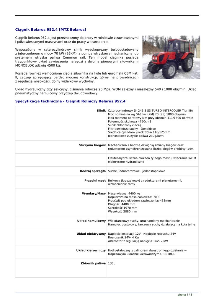 Ciągnik Belarus 952.4 [MTZ Belarus] Ciągnik Belarus 952.4 jest przeznaczony do pracy w rolnictwie z zawieszanymi i półzawieszanymi maszynami oraz do pracy w transporcie. Wyposażony w czterocylindrowy silnik wysokoprężny turbodoładowany z intercoolerem o mocy 70 kW (95KM), z pompą wtryskową mechaniczną lub systemem wtrysku paliwa Common rail. Ten model ciągnika posiada trzypunktowy układ zawieszenia narzędzi z dwoma pionowymi siłownikami MONOBLOK udźwig 4500 kg. Posiada również wzmocnione cięgła siłownika na kule lub euro haki CBM kat. II, zaczep sprzęgający bardzo mocnej konstrukcji, górny na prowadnicach z regulacją wysokości, dolny widełkowy wychylny. Układ hydrauliczny trzy sekcyjny, ciśnienie robocze 20 Mpa. WOM zależny i niezależny 540 i 1000 obr/min. Układ pneumatyczny hamulcowy przyczep dwuobwodowy. Specyfikacja techniczna - Ciągnik Rolniczy Belarus 952.4 Silnik Czterocylindrowy D- 245.5 S3 TURBO-INTERCOLER Tier IIIA Moc nominalna wg SAE kw (KM) 70 (95) 1800 obr/min Max moment obrotowy Nm przy obr/min 411/1400 obr/min Pojemność skokowa 4750cm3 Silnik chłodzony cieczą Filtr powietrza suchy - Donaldson Średnica cylindrów /skok tłoka 110/125mm Jednostkowe zużycie paliwa 230g/kWh Skrzynia biegów Mechaniczna z boczną dźwignią zmiany biegów oraz reduktorem zsynchronizowana liczba biegów przód/tył 14/4 Elektro-hydrauliczna blokada tylnego mostu, włączanie WOM elektryczno-hydrauliczne Rodzaj sprzęgła Suche, jednotarczowe , jednostopniowe Przedni most Belkowy (krzyżakowy) z reduktorami planetarnymi, wzmocnienie ramy. Wymiary/Masy Masa własna: 4400 kg Dopuszczalna masa całkowita: 7000 Prześwit pod układem zawieszenia: 465mm Długość: 4480 mm Szerokość 1970 mm Wysokość 2880 mm Układ hamulcowy Wielotarczowy suchy, uruchamiany mechanicznie Hamulec postojowy, tarczowy suchy działający na koła tylne Układ elektryczny Napięcie instalacji 12V , Napięcie rozruchu 24V Rozrusznik 24V- 4 Kw Alternator z regulacją napięcia 14V- 2 kW Układ kierowniczy Hydrostatyczny z cylindrem dwustronnego działania w trapezowym układzie kierowniczym ORBITROL Zbiornik paliwa 130L strona 1 / 3 Kabina Ochronna, komfortowa, wyciszona, ogrzewana z uchylnymi szybami, ze spryskiwaczem oraz wycieraczką szyby przedniej i tylnej , lustrami bocznymi, z czterema reflektorami roboczymi. Siedzenie komfortowe, amortyzowane z regulacją Belarus Wydajność pompy 54 l/min Ciśnienie nominalne w układzie 20 Mpa Rozdzielacz 3-sekcyjny o wydajności 80 l/min MONOBLOK Ogumienie P/T 360/70R24 / 18,4R34 Obciążniki przód Kpl. obciążników Obciążniki tył Kpl. obciążników Zwieszenie tylne Trzypunktowy układ zawieszenia narzędzi, dwa siłowniki C-90 Max. Udźwig 4500 kg Zespoły przyłączeniowo zaczepowe Zaczep przedni: widełkowy Górny zaczep transportowy widełkowy z możliwością regulacji wysokości, na prowadnicach Zaczep Rolniczy widełkowy wychylny Maska Plastikowa koloru czerwonego GRAND-AGRO Sp. z o.o. ul. Ogrodowa 4 16-020 Czarna Białostocka Magazyn Części Zamiennych i Skład Maszyn: ul. Fabryczna 7 16-020 Czarna Białostocka Godziny pracy : Poniedziałek - Piątek : od 8:00 do 16:00 Sobota - Niedziela : ZAMKNIĘTE Części Zamienne: tel. +48 85 733 67 71 tel. +48 85 733 67 72 mob. +48 511 408 862 e-mail: [email protected] e-mail: [email protected] Ciągniki i Maszyny: tel. +48 85 733 67 74 mob. +48 518 315 555 mob. +48 511 408 404 e-mail: [email protected] Księgowość: tel. +48 85 733 67 73 fax. +48 85 733 67 75 e-mail: [email protected] NIP: 9662088642, REGON: 200787519 KRS: 0000464552 w Sądzie Rejonowym w Białymstoku XII Wydział Gospodarczy strona 2 / 3 więcej informacji: http://www.grand-agro.com.pl/ciagnik-belarus-952-4.html strona 3 / 3 Powered by TCPDF (www.tcpdf.org)