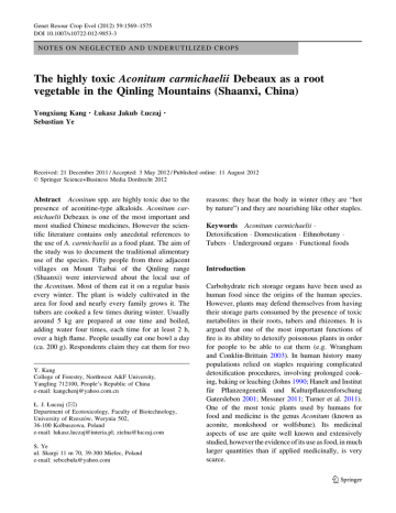 Genet Resour Crop Evol (2012) 59:1569–1575 DOI 10.1007/s10722-012-9853-3 NOTES ON NEGLECTED AND UNDERUTILIZED CROPS The highly toxic Aconitum carmichaelii Debeaux as a root vegetable in the Qinling Mountains (Shaanxi, China) Yongxiang Kang · Łukasz Jakub Łuczaj · Sebastian Ye Received: 21 December 2011 / Accepted: 3 May 2012 / Published online: 11 August 2012 © Springer Science+Business Media Dordrecht 2012 Abstract Aconitum spp. are highly toxic due to the presence of aconitine-type alkaloids. Aconitum carmichaelii Debeaux is one of the most important and most studied Chinese medicines. However the scientific literature contains only anecdotal references to the use of A. carmichaelii as a food plant. The aim of the study was to document the traditional alimentary use of the species. Fifty people from three adjacent villages on Mount Taibai of the Qinling range (Shaanxi) were interviewed about the local use of the Aconitum. Most of them eat it on a regular basis every winter. The plant is widely cultivated in the area for food and nearly every family grows it. The tubers are cooked a few times during winter. Usually around 5 kg are prepared at one time and boiled, adding water four times, each time for at least 2 h, over a high flame. People usually eat one bowl a day (ca. 200 g). Respondents claim they eat them for two Y. Kang College of Forestry, Northwest A&F University, Yangling 712100, People’s Republic of China e-mail: [email protected] Ł. J. Łuczaj (&) Department of Ecotoxicology, Faculty of Biotechnology, University of Rzeszów, Werynia 502, 36-100 Kolbuszowa, Poland e-mail: [email protected]; [email protected] S. Ye ul. Skargi 11 m 70, 39-300 Mielec, Poland e-mail: [email protected] reasons: they heat the body in winter (they are “hot by nature”) and they are nourishing like other staples. Keywords Aconitum carmichaelii · Detoxification · Domestication · Ethnobotany · Tubers · Underground organs · Functional foods Introduction Carbohydrate rich storage organs have been used as human food since the origins of the human species. However, plants may defend themselves from having their storage parts consumed by the presence of toxic metabolites in their roots, tubers and rhizomes. It is argued that one of the most important functions of fire is its ability to detoxify poisonous plants in order for people to be able to eat them (e.g. Wrangham and Conklin-Brittain 2003). In human history many populations relied on staples requiring complicated detoxification procedures, involving prolonged cooking, baking or leaching (Johns 1990; Hanelt and Institut für Pflanzengenetik und Kulturpflanzenforschung Gatersleben 2001; Messner 2011; Turner et al. 2011). One of the most toxic plants used by humans for food and medicine is the genus Aconitum (known as aconite, monkshood or wolfsbane). Its medicinal aspects of use are quite well known and extensively studied, however the evidence of its use as food, in much larger quantities than if applied medicinally, is very scarce. 123 1570 Aconites are perennials occurring mainly in the temperate regions in Eurasia, usually in the mountains as most species prefer cool and humid conditions. The plants from this genus produce tubers, which are caudexes, i.e. enlarged basal parts of the stem. They are known for their toxicity and were often used as poison to kill both animals and people. They have also been used in ethnomedicine, both in Europe and Asia (e.g. Butură 1979; CP Commission 2005; Svanberg 2011; Singhhuber et al. 2009). In modern European pharmacopeia they are not used, due to the danger of poisoning, in contrast to Traditional Chinese Medicine (TCM) where aconites are one of the main medicines, though used with great caution (Bisset 1981; Singhhuber et al. 2009). As Aconitum-containing Chinese products more and more often appear on the European market, assessing their toxicity is a large challenge for the Western pharmaceutical regulatory bodies (Csupor et al. 2011). Aconitum carmichaelii is known in TCM under the name fuzi (附子) or caowu (草乌), depending on the kind of tuber, which is used. Several other species of the genus are also used, but much less frequently (Bisset 1981; Singhhuber et al. 2009; He et al. 2010). Understanding the pharmacology of Aconitum is an important issue as more and more research confirms its potent healing properties, e.g. as an agent in the treatment of rheumatoid arthritis, epilepsy, kidney dysfunctions, abdominal colic and even some cardiovascular problems (Singhhuber et al. 2009). The potential healing properties and risks of using Aconitum species, particularly Aconitum carmichaelii, were extensively discussed by Singhhuber et al. (2009). The toxicity of Aconitum is mainly caused by diester diterpene alkaloids (DDAs) including aconitine (AC), mesaconitine (MA) and hypaconitine (HA). They can be decomposed by hydrolysis into less or non-toxic derivatives through traditional Chinese processing methods. The diester alkaloids are broken down under the influence of humidity and high temperatures to monoester alkaloids which are at least two thousand times less toxic (Zhou 2011; Zhao et al. 2011). However, improper processing causes numerous poisonings in China, Japan and India. Aconitum spp. are dangerous in use. The symptoms of poisoning are very quick, and usually occur within an hour or a few hours of ingestion. The cause of death is cardiovascular failure combined with neurotoxicity (Singhhuber et al. 2009; Chan 2011). The mode of use of Aconitum in 123 Genet Resour Crop Evol (2012) 59:1569–1575 TCM is well known. Only small amounts are used, usually after cooking for at least an hour to decrease its toxicity (CP Commission 2005; Singhhuber et al. 2009). Aconitum as food The use of larger quantities of Aconitum tubers as food, or at least medicinal food, is little studied. Hu (2005), in her reference book on the traditional food plants of China, reported that A. carmichaelii tubers