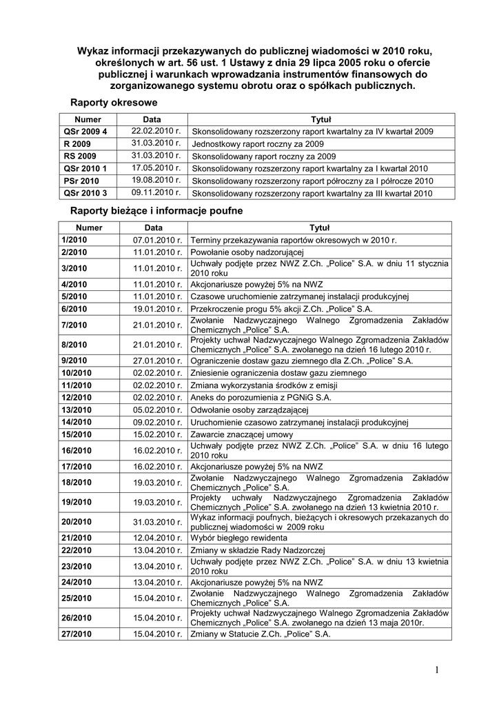 Wykaz informacji przekazywanych do publicznej wiadomości w 2010 roku, określonych w art. 56 ust. 1 Ustawy z dnia 29 lipca 2005 roku o ofercie publicznej i warunkach wprowadzania instrumentów finansowych do zorganizowanego systemu obrotu oraz o spółkach publicznych. Raporty okresowe Numer QSr 2009 4 R 2009 RS 2009 QSr 2010 1 PSr 2010 QSr 2010 3 Data 22.02.2010 r. 31.03.2010 r. 31.03.2010 r. 17.05.2010 r. 19.08.2010 r. 09.11.2010 r. Tytuł Skonsolidowany rozszerzony raport kwartalny za IV kwartał 2009 Jednostkowy raport roczny za 2009 Skonsolidowany raport roczny za 2009 Skonsolidowany rozszerzony raport kwartalny za I kwartał 2010 Skonsolidowany rozszerzony raport półroczny za I półrocze 2010 Skonsolidowany rozszerzony raport kwartalny za III kwartał 2010 Raporty bieŜące i informacje poufne Numer 1/2010 2/2010 3/2010 4/2010 5/2010 6/2010 7/2010 8/2010 9/2010 10/2010 11/2010 12/2010 13/2010 14/2010 15/2010 16/2010 17/2010 18/2010 19/2010 20/2010 21/2010 22/2010 23/2010 24/2010 25/2010 26/2010 27/2010 Data Tytuł 07.01.2010 r. Terminy przekazywania raportów okresowych w 2010 r. 11.01.2010 r. Powołanie osoby nadzorującej Uchwały podjęte przez NWZ Z.Ch. „Police” S.A. w dniu 11 stycznia 11.01.2010 r. 2010 roku 11.01.2010 r. Akcjonariusze powyŜej 5% na NWZ 11.01.2010 r. Czasowe uruchomienie zatrzymanej instalacji produkcyjnej 19.01.2010 r. Przekroczenie progu 5% akcji Z.Ch. „Police” S.A. Zwołanie Nadzwyczajnego Walnego Zgromadzenia Zakładów 21.01.2010 r. Chemicznych „Police” S.A. Projekty uchwał Nadzwyczajnego Walnego Zgromadzenia Zakładów 21.01.2010 r. Chemicznych „Police” S.A. zwołanego na dzień 16 lutego 2010 r. 27.01.2010 r. Ograniczenie dostaw gazu ziemnego dla Z.Ch. „Police” S.A. 02.02.2010 r. Zniesienie ograniczenia dostaw gazu ziemnego 02.02.2010 r. Zmiana wykorzystania środków z emisji 02.02.2010 r. Aneks do porozumienia z PGNiG S.A. 05.02.2010 r. Odwołanie osoby zarządzającej 09.02.2010 r. Uruchomienie czasowo zatrzymanej instalacji produkcyjnej 15.02.2010 r. Zawarcie znaczącej umowy Uchwały podjęte przez NWZ Z.Ch. „Police” S.A. w dniu 16 lutego 16.02.2010 r. 2010 roku 16.02.2010 r. Akcjonariusze powyŜej 5% na NWZ Zwołanie Nadzwyczajnego Walnego Zgromadzenia Zakładów 19.03.2010 r. Chemicznych „Police” S.A. Projekty uchwały Nadzwyczajnego Zgromadzenia Zakładów 19.03.2010 r. Chemicznych „Police” S.A. zwołanego na dzień 13 kwietnia 2010 r. Wykaz informacji poufnych, bieŜących i okresowych przekazanych do 31.03.2010 r. publicznej wiadomości w 2009 roku 12.04.2010 r. Wybór biegłego rewidenta 13.04.2010 r. Zmiany w składzie Rady Nadzorczej Uchwały podjęte przez NWZ Z.Ch. „Police” S.A. w dniu 13 kwietnia 13.04.2010 r. 2010 roku 13.04.2010 r. Akcjonariusze powyŜej 5% na NWZ Zwołanie Nadzwyczajnego Walnego Zgromadzenia Zakładów 15.04.2010 r. Chemicznych „Police” S.A. Projekty uchwał Nadzwyczajnego Walnego Zgromadzenia Zakładów 15.04.2010 r. Chemicznych „Police” S.A. zwołanego na dzień 13 maja 2010r. 15.04.2010 r. Zmiany w Statucie Z.Ch. „Police” S.A. 1 Numer 28/2010 29/2010 30/2010 31/2010 32/2010 33/2010 34/2010 35/2010 36/2010 37/2010 38/2010 39/2010 40/2010 41/2010 42/2010 43/2010 44/2010 45/2010 46/2010 47/2010 48/2010 49/2010 50/2010 51/2010 52/2010 53/2010 54/2010 55/2010 56/2010 57/2010 58/2010 59/2010 60/2010 61/2010 62/2010 63/2010 63/2010/kor Data Tytuł 19.04.2010 r. Aneks do porozumienia z PGNiG S.A. 19.04.2010 r. Zawarcie z PGNiG S.A. umowy cesji wierzytelności 20.04.2010 r. Zawarcie znaczącej umowy Uchwały podjęte przez NWZ Z.Ch. „Police” S.A. w dniu 13 maja 13.05.2010 r. 2010 r. 13.05.2010 r. Akcjonariusz powyŜej 5% na NWZ Wypowiedzenie dotychczasowego oraz przedstawienie przez Zarząd 21.05.2010 r. nowego Zakładowego Układu Zbiorowego Pracy Zwołanie Zwyczajnego Walnego Zgromadzenia Zakładów 25.05.2010 r. Chemicznych „Police” S.A. Projekty uchwał Zwyczajnego Walnego Zgromadzenia Zakładów 25.05.2010 r. Chemicznych „Police” S.A. zwołanego na dzień 21 czerwca 2010 r. 25.05.2010 r. Zmiany w Statucie Z.Ch. „Police” S.A. 27.05.2010 r. Zgoda Komisji Europejskiej na udzielenie pomocy publicznej 08.06.2010 r. Rezygnacja osoby nadzorującej 08.06.2010 r. Zawarcie znaczącej umowy z ARP S.A. 17.06.2010 r. Powołanie osób zarządzających 21.06.2010 r. Powołanie osób nadzorujących Uchwały podjęte przez ZWZ Z.Ch. „Police” S.A. w dniu 21 czerwca 22.06.2010 r. 2010 r. 22.06.2010 r. Akcjonariusze powyŜej 5% na ZWZ Aneks do umowy z PKO BP – wydłuŜenie okresu wykorzystania 30.06.2010 r. limitu kredytowego 30.06.2010 r. Zawarcie aneksu do porozumienia z PGNiG S.A. Zawarcie aneksu do umowy o kredyt w rachunku bieŜącym z PEKAO 30.06.2010 r. S.A. 05.07.2010 r. Rejestracja zmian w Statucie Z.Ch. „Police” S.A. Wypowiedzenie umów ramowych o współpracy ze spółkami ze 100% 05.07.2010 r. udziałem Z.Ch. „Police” S.A. 09.07.2010 r. Przyjęcie programu restrukturyzacji 14.07.2010 r. Uruchomienie czasowo wyłączonej instalacji produkcyjnej 15.07.2010 r. Przyjęcie jednolitego tekstu Statutu Spółki 21.07.2010 r. Uruchomienie czasowo wyłączonej instalacji produkcyjnej 27.07.2010 r. Uruchomienie czasowo wyłączonej instalacji produkcyjnej Zmiana terminu publikacji Skonsolidowanego raportu półrocznego za 10.08.2010 r. I półrocze 2010 r. 11.08.2010 r. Rejestracja zmian w Statucie Z.Ch. „Police” S.A. ZłoŜenie wniosku do ARP S.A. o udzielanie pomocy publicznej na 11.08.2010 r. restrukturyzację 18.08.2010 r. Zawarcie znaczącej umowy w zakresie sprzedaŜy nawozów 20.08.2010 r. Zawarcie Aneksu do porozumienia z PGNiG S.A. 30.08.2010 r. Przyjęcie jednolitego tekstu Statutu Spółki 31.08.2010 r. Wniosek osoby zarządzającej o odwołanie Wystąpienie okoliczności opisanych w art. 397 Kodeksu Spółek 03.09.2010 r. Handlowych Zwołanie Nadzwyczajnego Walnego Zgromadzenia Zakładów 13.09.2010 r. Chemicznych „Police” S.A. Projekt