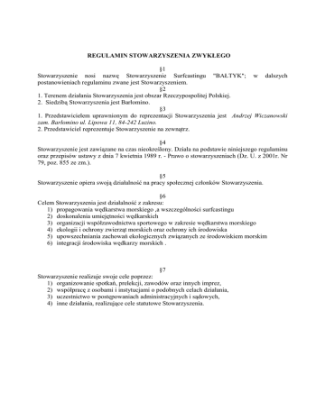 REGULAMIN STOWARZYSZENIA ZWYKŁEGO §1 Stowarzyszenie nosi nazwę Stowarzyszenie Surfcastingu "BAŁTYK"; w dalszych postanowieniach regulaminu zwane jest Stowarzyszeniem. §2 1. Terenem działania Stowarzyszenia jest obszar Rzeczypospolitej Polskiej. 2. Siedzibą Stowarzyszenia jest Barłomino. §3 1. Przedstawicielem uprawnionym do reprezentacji Stowarzyszenia jest Andrzej Wiczanowski zam. Barłomino ul. Lipowa 11, 84-242 Luzino. 2. Przedstawiciel reprezentuje Stowarzyszenie na zewnątrz. §4 Stowarzyszenie jest zawiązane na czas nieokreślony. Działa na podstawie niniejszego regulaminu oraz przepisów ustawy z dnia 7 kwietnia 1989 r. - Prawo o stowarzyszeniach (Dz. U. z 2001r. Nr 79, poz. 855 ze zm.). §5 Stowarzyszenie opiera swoją działalność na pracy społecznej członków Stowarzyszenia. §6 Celem Stowarzyszenia jest działalność z zakresu: 1) propagowania wędkarstwa morskiego ,a wszczególności surfcastingu 2) doskonalenia umiejętności wędkarskich 3) organizacji współzawodnictwa sportowego w zakresie wędkarstwa morskiego 4) ekologii i ochrony zwierząt morskich oraz ochrony ich środowiska 5) upowszechniania zachowań ekologicznych związanych ze środowiskiem morskim 6) integracji środowiska wędkarzy morskich . §7 Stowarzyszenie realizuje swoje cele poprzez: 1) organizowanie spotkań, prelekcji, zawodów oraz innych imprez, 2) współpracę z osobami i instytucjami o podobnych celach działania, 3) uczestnictwo w postępowaniach administracyjnych i sądowych, 4) inne działania, realizujące cele statutowe Stowarzyszenia.