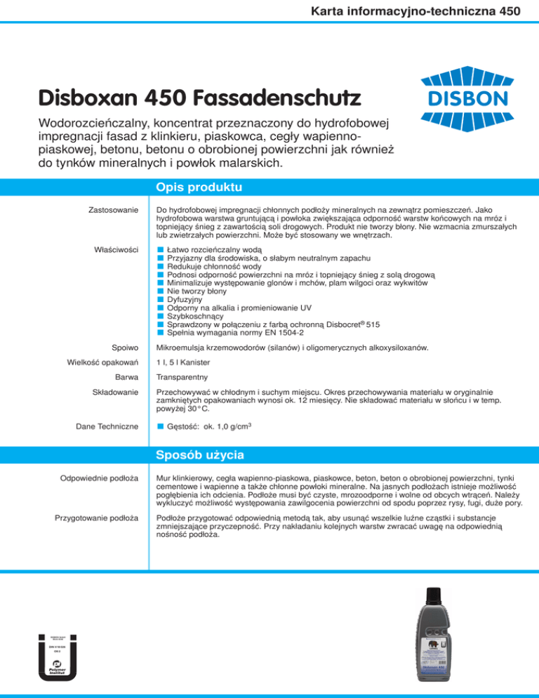Karta informacyjno-techniczna 450 Disboxan 450 Fassadenschutz Wodorozcieńczalny, koncentrat przeznaczony do hydrofobowej impregnacji fasad z klinkieru, piaskowca, cegły wapiennopiaskowej, betonu, betonu o obrobionej powierzchni jak również do tynków mineralnych i powłok malarskich. Opis produktu Zastosowanie Właściwości Spoiwo Do hydrofobowej impregnacji chłonnych podłoży mineralnych na zewnątrz pomieszczeń. Jako hydrofobowa warstwa gruntującą i powłoka zwiększająca odporność warstw końcowych na mróz i topniejący śnieg z zawartością soli drogowych. Produkt nie tworzy błony. Nie wzmacnia zmurszałych lub zwietrzałych powierzchni. Może być stosowany we wnętrzach. ■ ■ ■ ■ ■ ■ ■ ■ ■ ■ ■ Łatwo rozcieńczalny wodą Przyjazny dla środowiska, o słabym neutralnym zapachu Redukuje chłonność wody Podnosi odporność powierzchni na mróz i topniejący śnieg z solą drogową Minimalizuje występowanie glonów i mchów, plam wilgoci oraz wykwitów Nie tworzy błony Dyfuzyjny Odporny na alkalia i promieniowanie UV Szybkoschnący Sprawdzony w połączeniu z farbą ochronną Disbocret® 515 Spełnia wymagania normy EN 1504-2 Mikroemulsja krzemowodorów (silanów) i oligomerycznych alkoxysiloxanów. Wielkość opakowań 1 l, 5 l Kanister Barwa Transparentny Składowanie Dane Techniczne Przechowywać w chłodnym i suchym miejscu. Okres przechowywania materiału w oryginalnie zamkniętych opakowaniach wynosi ok. 12 miesięcy. Nie składować materiału w słońcu i w temp. powyżej 30°C. ■ Gęstość: ok. 1,0 g/cm3 Sposób użycia Odpowiednie podłoża Przygotowanie podłoża DISBON GmbH Werk 6546 DIN V 18 026 OS 2 Mur klinkierowy, cegła wapienno-piaskowa, piaskowce, beton, beton o obrobionej powierzchni, tynki cementowe i wapienne a także chłonne powłoki mineralne. Na jasnych podłożach istnieje możliwość pogłębienia ich odcienia. Podłoże musi być czyste, mrozoodporne i wolne od obcych wtrąceń. Należy wykluczyć możliwość występowania zawilgocenia powierzchni od spodu poprzez rysy, fugi, duże pory. Podłoże przygotować odpowiednią metodą tak, aby usunąć wszelkie luźne cząstki i substancje zmniejszające przyczepność. Przy nakładaniu kolejnych warstw zwracać uwagę na odpowiednią nośność podłoża. Karta informacyjno-techniczna 450 Przygotowanie materiału Sposób nakładania 1 część wagową koncentratu wymieszać z 9 częściami wagowymi czystej wody pitnej. Przygotować tylko tyle materiału, ile zostanie zużyte w ciągu 12 godz. Stosując Disboxan 450 Fassadenschutz jako impregnat hydrofobowy w systemach ochrony powierzchni betonu OS-B rozcieńczyć koncentrat wodą pitną w proporcji 1:4 Przygotowany materiał nakładać szerokim pędzlem (szczotką malarską) względnie przez polewanie lub natryskiwanie (np. pompą tłokową firmy Keller, opryskiwaczem ogrodowym firmy Gloria, agregatem SATA). Impregnat można natryskiwać urządzeniami typu airless przy obniżonym ciśnieniu. Nanosić wielokrotnie, zależnie od chłonności podłoża, jednakże nie mniej niż dwie obfite warstwy (mokrym w mokre). Powierzchnie betonu powlekać trzykrotnie, jeżeli nie przewidziano nakładania innych materiałów. Uwaga: Osłonić okna i inne elementy fasad. Powierzchnie spryskane impregnatem Disboxan 450 od razu zmyć aby zapobiec powstaniu plam, których nie można później usunąć. Zwarte podłoża takie jak klinkier i beton płukany itp. należy przemyć wodą (wilgotną szmatką, gąbką) ok. dwie godziny po zaimpregnowaniu. Zużycie Warunki obróbki Czas schnięcia Czyszczenie narzędzi Impregnowanie lub gruntowanie (koncentrat) ok. 20 - 40 ml/m² (= ok. 200 – 400 ml/m² materiału po rozcieńczeniu w proporcji 1 : 9) na każdą warstwę w zależności od chłonności podłoża. Minimalna temp. obróbki dla materiału, otoczenia i podłoża wynosi 5°C, maksymalna 30°C. W temp. +20°C i przy względnej wilgotności powietrza 60% warstwa jest po ok. 4 godz. odporna na opady. Kolejne warstwy można nanosić po upływie ok. 24 godz. Natychmiast po użyciu myć wodą. Wskazówki Wskazówki bezpieczeństwa (stan na dzień wydania) Utylizacja Bliższe informacje Znakowanie CE Doradztwo techniczne Infolinia Produkt łatwo palny. Działa drażniąco na skórę. Ryzyko poważnego uszkodzenia oczu. Działa szkodliwie na organizmy wodne; może powodować długo utrzymujące się niekorzystne zmiany w środowisku wodnym. Chronić przed dziećmi. Przechowywać pojemnik szczelnie zamknięty w miejscu dobrze wentylowanym. Nie wdychać pary/rozpylonej cieczy. Zanieczyszczone oczy przemyć dużą ilością wody i zasięgnąć porady lekarza. Nie wprowadzać do kanalizacji, unikać zrzutów do środowiska. Nosić odpowiednie rękawice ochronne i okulary lub osłonę twarzy. W razie wypadku lub złego samopoczucia niezwłocznie zasięgnąć porady lekarza, – jeżeli to możliwe, pokazać etykietę. Stosować wyłącznie w dobrze wentylowanych obszarach. Produkt jest niepalny po rozcieńczeniu wodą, nie występuje wtedy także ryzyko poważnego uszkodzenia oczu, ale roztwór działa drażniąco na oczy. Do utylizacji nadają się jedynie całkowicie opróżnione opakowania. Opakowania zawierające resztki materiału utylizować jak resztki lakierów, zgodnie z obowiązującymi lokalnie przepisami. Patrz karta charakterystyki wyrobu. EN 1504-2 Norma PN-EN 1504-2:2006 - Wyroby i systemy do ochrony i napraw konstrukcji betonowych – Definicje, wymagania, sterowanie jakością i ocena zgodności –Część 2: Systemy ochrony powierzchniowej betonu. W karcie niniejszej niemożliwe jest opisanie sposobów przygotowania wszystkich występujących w praktyce podłoży. W przypadkach, które nie zostały opisane powyżej, pomocnym może okazać się kontakt z naszym Działem technicznym. Chętnie udzielimy Państwu szczegółowych informacji związanych z konkretnym obiektem. Doradztwo techniczne: Tel. (22) 544 20 40 Fax (22) 544 