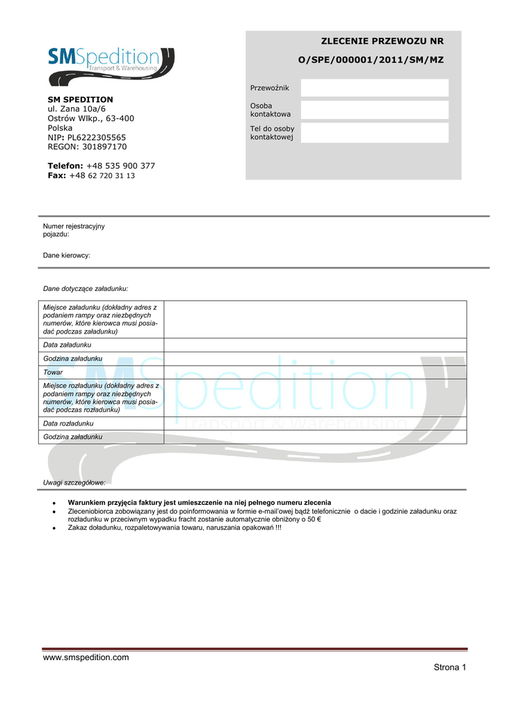 ZLECENIE PRZEWOZU NR O/SPE/000001/2011/SM/MZ Przewoźnik SM SPEDITION ul. Zana 10a/6 Ostrów Wlkp., 63-400 Polska NIP: PL6222305565 REGON: 301897170 Osoba kontaktowa Tel do osoby kontaktowej Telefon: +48 535 900 377 Fax: +48 62 720 31 13 Numer rejestracyjny pojazdu: Dane kierowcy: Dane dotyczące załadunku: Miejsce załadunku (dokładny adres z podaniem rampy oraz niezbędnych numerów, które kierowca musi posiadać podczas załadunku) Data załadunku Godzina załadunku Towar Miejsce rozładunku (dokładny adres z podaniem rampy oraz niezbędnych numerów, które kierowca musi posiadać podczas rozładunku) Data rozładunku Godzina załadunku Uwagi szczegółowe: Warunkiem przyjęcia faktury jest umieszczenie na niej pełnego numeru zlecenia Zleceniobiorca zobowiązany jest do poinformowania w formie e-mail’owej bądź telefonicznie o dacie i godzinie załadunku oraz rozładunku w przeciwnym wypadku fracht zostanie automatycznie obniżony o 50 € Zakaz doładunku, rozpaletowywania towaru, naruszania opakowań !!! www.smspedition.com Strona 1 ZLECENIE PRZEWOZU NR O/SPE/000001/2011/SM/MZ Przewoźnik SM SPEDITION ul. Zana 10a/6 Ostrów Wlkp., 63-400 Polska NIP: PL6222305565 REGON: 301897170 Osoba kontaktowa Tel do osoby kontaktowej Telefon: +48 535 900 377 Fax: +48 62 720 31 13 Stawka 0000,00 EUR all in, wg średniego kursu NBP ogłoszonego na dzień przed załadunkiem Termin płatności: 60 dni - liczony jest od daty otrzymania prawidłowo wystawionej faktury VAT wraz z potwierdzonym listem CMR przesłanej na adres koresp: SM SPEDITION, ul. Zana 10a/6 63-400 Ostrów Wlkp. Ogólne warunki zlecenia i płatności 1.Wystawianie faktur VAT zgodnie z ustawą o podatku od towarów i usług oraz wg średniego kursu NBP na dzień przed załadunkiem. Zleceniobiorca zobowiązany jest do wystawienia faktury transportowej w miesiącu realizacji zlecenia transportu i dostarczenia jej w ciągu 14 dni, w przeciwnym wypadku FRACHT zostanie automatycznie obniżony o 20%. 2.Przewoźnik zobowiązuje się do wykonania usługi pojazdem w należytym stanie technicznym, odpowiednim dla transportowania określonego w zleceniu ładunku i posiadającego niezbędne urządzenia do mocowania i zabezpieczania ładunku. Podstawienie środka transportu nie spełniającego w/w warunków będzie traktowane jako nie podstawienie środka transportu. Obowiązuje tajemnica handlowa, przepisy Konwencji CMR oraz prawa przewozowego. 3.Kierowca zobowiązany jest do aktywnego uczestniczenia w załadunku i kontroli prawidłowego rozłożenia towaru na naczepie. Za prawidłowe zabezpieczenie towaru na czas transportu odpowiada przewoźnik. 4.Kierowca ma bezwzględny obowiązek sprawdzenia stanu faktycznego ładunku z treścią listu przewozowego oraz specyfikacją towarową etc. W przypadku stwierdzonych wad, usterek, braków lub innych rozbieżności kierowca winien dokonać wpisu do listu CMR pod rygorem obciążenia finansowego w wysokości stawki całego frachtu. 5.O wszelkich nieprawidłowościach, stwierdzonych uszkodzeniach ładunku przewoźnik jest zobowiązany niezwłocznie informować wyznaczoną osobę zleceniodawcy. Jeżeli przed wydaniem ładunku lub w trakcie rozładunku okaże się, że doznał on ubytku lub uszkodzenia przewoźnik ustala niezwłocznie protokolarnie stan ładunku oraz okoliczności powstania szkody. Z ustalenia stanu ładunku sporządza się protokół, który podpisują w dwóch egzemplarzach osoby uczestniczące w ustaleniach. W razie odmowy podpisania protokołu przez którąś ze stron w treści należy wskazać fakt i przyczynę odmowy. 6.W momencie przyjęcia zlecenia obowiązuje ochrona klienta, podjęcie przez Państwa jakichkolwiek negocjacji z naszym klientem, będzie stanowiło dla nas podstawę do wystąpienia o odszkodowanie w wysokości od 10000€ do 250000€ w zależności od rangi klienta. Sądem właściwym do rozstrzygania sporów jest Sąd Gospodarczy w Poznaniu. 7.W przypadku towarów poza unijnych należy dostarczyć do odprawy celnej ostatecznej: fakturę, świadectwo pochodzenia, dokument T-1. 8.Dokumenty dotyczące transportu należy dostarczyć na adres korespondencyjny wskazany w nagłówku dokumentu, w nieprzekraczalnym terminie 14 dni od momentu zakończenia usługi. W przypadku wysłania dokumentacji na inny adres niż adres korespondencyjny wskazany w nagłówku dokumentu, doliczamy dodatkowo 15 dni do terminu płatności. 9.Termin płatności ustalony powyżej rozpoczyna się od daty dostarczenia prawidłowo wystawionej faktury wraz z potwierdzonym listem CMR. 10.Przewoźnik zobowiązany jest przestrzegać warunków zlecenia, musi posiadać ważne O.C. przewoźnika lub w inny sposób ubezpieczony towar. Przy doładunku OCP obejmuje cały towar na pojeździe. 11.W razie uzasadnionych postojów prosimy przedstawić potwierdzoną kartę postoju. Od opłat postojowych zwolnione 24 godziny przy załadunku i 48 przy rozładunku. Przestoje powinny być udokumentowane kartą postoju. W wypadku nie podbicia karty przez osobę odpowiedzialną za przestój uznajemy kartę podbitą przez miejscowy urząd (policja, urząd celny itp.) Zleceniodawca akceptuje udokumentowane koszty postoju w wysokości do 50€ za każdą dobę, powyżej czasu wolnego od opłat postojowych. Nie akceptujemy żadnych innych kosztów wynikających z postoju auta. 12.W przypadku nieterminowego podstawienia się do załadunku lub rozładunku oraz nieprawidłowego wykonania zlecenia Przewoźnik zostanie obciążony sumą powstałej szkody lub karami, bez podania przyczyny: za każdą dobę opóźnienia w załadunku lub rozładunku po 400€, przy zleceniu z podaną godziną załadunku od 10 – 100% frachtu. W razie nie podstawienia się środka transportu pod załadunek zamawiamy auto zastępcze na koszt Zleceniobiorcy i obciążamy kosztami w wysokości 400€. 13. Nieprawidłowości wynikające z nieterminowego wywiązania się ze zlecenia, spowodują wstrzymanie płatności do wyjaśnienia sprawy. 14