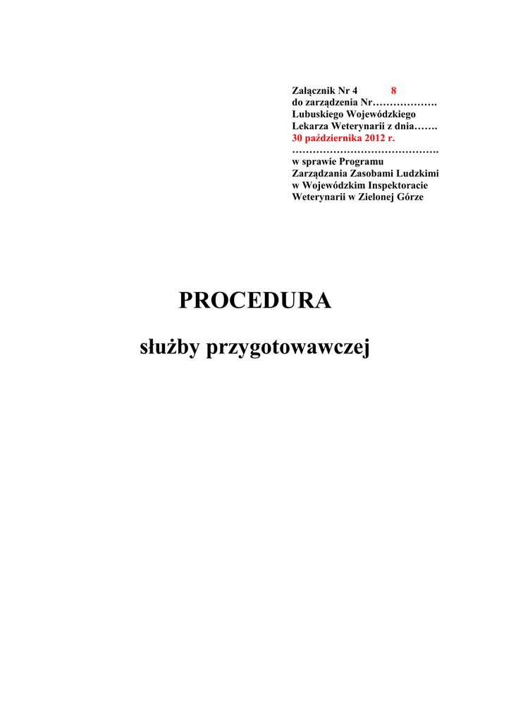 Załącznik Nr 4 8 do zarządzenia Nr………………. Lubuskiego Wojewódzkiego Lekarza Weterynarii z dnia……. 30 października 2012 r. ……………………………………. w sprawie Programu Zarządzania Zasobami Ludzkimi w Wojewódzkim Inspektoracie Weterynarii w Zielonej Górze PROCEDURA służby przygotowawczej § 1. 1. Wprowadzanie osób do pracy w Wojewódzkim Inspektoracie Weterynarii, zwanym dalej Inspektoratem, odbywa się zgodnie z: 1) ustawą z dnia 21 listopada 2008 r. o służbie cywilnej (Dz. U. Nr 227, poz. 1505 z późn.zm.); 2) zarządzeniem Nr 70 Prezesa Rady Ministrów z dnia 06 października 2011 r. w sprawie wytycznych w zakresie przestrzegania zasad służby cywilnej oraz w sprawie zasad etyki korpusu służby cywilnej (M.P. Nr 93, poz. 953); 3) zarządzeniem Nr 3 Szefa Służby Cywilnej z dnia 30 maja 2012 r. w sprawie standardów zarządzania zasobami ludzkimi w służbie cywilnej; 4) oraz z zasadami zawartymi w niniejszej procedurze. 2. W celu sprawnego zorganizowania procesu wprowadzania osób do pracy w Inspektoracie, umożliwiającego szybkie i efektywne rozpoczęcie wykonywania przez nich zadań: 1) informuje się pracowników Inspektoratu poprzez e-mail o zatrudnieniu nowej osoby w danej komórce organizacyjnej; 2) przedstawia nowego pracownika współpracownikom; 3) wprowadza poniższe procedury służby przygotowawczej. 3. Służbę przygotowawczą odbywają wszystkie osoby podejmujące po raz pierwszy pracę w służbie cywilnej, z wyjątkiem pracowników, którzy zostali zwolnieni z obowiązku odbywania tej służby. 4. Przez osobę podejmującą po raz pierwszy pracę w służbie cywilnej rozumie się osobę, która nie była wcześniej zatrudniona w służbie cywilnej na czas nieokreślony albo nie była zatrudniona na czas określony 12 miesięcy i nie otrzymała pierwszej pozytywnej oceny w służbie cywilnej. 5. Wniosek o zwolnienie pracownika z obowiązku odbywania służby przygotowawczej składa do kierownika jednostki kierujący komórką organizacyjną, zgodnie z podanym poniżej wzorem (formularz nr 1). 6. Decyzję o zwolnieniu z obowiązku odbywania służby przygotowawczej podejmuje kierujący jednostką, zgodnie z podanym poniżej wzorem (formularz nr 2). § 2. 1. Służba przygotowawcza mająca na celu teoretyczne i praktyczne przygotowanie pracownika do należytego wykonywania obowiązków służbowych, trwa nie dłużej niż 4 miesiące i kończy się, nie później niż z upływem 8 miesiąca od podjęcia przez pracownika pracy. 2. Służba przygotowawcza dzieli się na część teoretyczną i praktyczną. Część teoretyczna polega na odbyciu serii szkleń zewnętrznych lub wewnętrznych wybranych na podstawie procedury polityki szkoleniowej i rozwoju, część praktyczna odbywa się w Inspektoracie. 3. Zakres oraz czas trwania służby przygotowawczej uzależniony jest od posiadanej przez pracownika wiedzy i umiejętności niezbędnych do wykonywania obowiązków wynikających z opisu zajmowanego stanowiska pracy. 4. Warunki odbywania służby przygotowawczej zostają określone w skierowaniu (wzór formularz nr 4), przygotowanym na podstawie opinii osoby kierującej komórką organizacyjną (wzór formularz nr 3), w której pracownik jest zatrudniony oraz w planie służby przygotowawczej dołączonym do skierowania (wzór formularz nr 5). 5. Służba przygotowawcza odbywa się pod kierunkiem wyznaczonego opiekuna, który udziela pracownikowi pomocy merytorycznej, przybliża zasady służby cywilnej oraz pracy w Inspektoracie. 6. Odbywając służbę przygotowawczą pracownik zgodnie z planem: 1) zdobywa dodatkową wiedzę w zakresie: a) prawa konstytucyjnego, administracji publicznej, procedur administracyjnych, służby cywilnej, weterynarii, finansów publicznych, zamówień publicznych, ochrony danych osobowych, ochrony informacji niejawnych, dostępu do informacji publicznej, b) struktury i organizacji Inspektoratu, c) instrukcji kancelaryjnej, jednolitego rzeczowego wykazu akt oraz instrukcji w sprawie organizacji i zakresu działania archiwów zakładowych; 2) poznaje misję i główne cele Inspektoratu; 3) zasady funkcjonowania Inspektoratu w Unii Europejskiej; 3) szczegółowo zapoznaje się z rodzajem spraw załatwianych na stanowisku pracy oraz w komórce organizacyjnej; 4) nabywa umiejętności przygotowywania pism, prowadzenia korespondencji urzędowej oraz ewidencjonowania dokumentacji; 5) poznaje system zarządzania jakością. 7. W czasie odbywania służby przygotowawczej pracownik wykonuje czynności na swoim stanowisku pracy oraz w komórce organizacyjnej, w której jest zatrudniony, a w miarę potrzeby odbywa praktyki w innych komórkach organizacyjnych, zgodnie z planem służby przygotowawczej. 8. Plan służby przygotowawczej określa, w szczególności: 1) zakres tematyczny, formy i metody oraz czas przyswojenia wiedzy teoretycznej, 2) zestawienie umiejętności praktycznych, które pracownik zobowiązany jest nabyć w wybranych komórkach organizacyjnych, w danym czasie. 9. Kierujący komórką organizacyjną, w której pracownik odbywa służbę przygotowawczą, sporządza pisemną informację (wzór formularz nr 6) o przebiegu tej służby, powierzonych pracownikowi czynnościach, sposobie wywiązywania się pracownika z przydzielonych zadań i predyspozycjach pracownika do wykonywania tych zadań. § 3. 1. Osoby, które służbę przygotowawczą ukończyły, a także zwolnione z jej odbywania przystępują do egzaminu kończącego tę służbę w ustalonym przez kierownika jednostki terminie, nie później niż z upływem 8 miesięcy od podjęcia pracy przez pracownika 2. Ustalony termin egzaminu ulega odpowiedniemu przesunięciu w przypadku przedłużenia okresu służby przygotowawczej. 3. Egzamin przeprowadza komisja egzaminacyjna powołana przez kierownika jednostki, w składzie trzech członków, z których jeden zostaje wyznaczony na przewodniczącego (wzór formularz nr 7). 4. Egzamin 