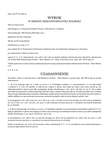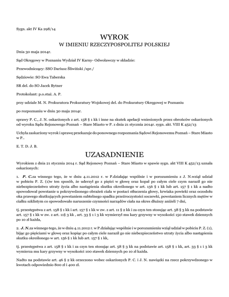 Sygn. akt IV Ka 298/14 WYROK W IMIENIU RZECZYPOSPOLITEJ POLSKIEJ Dnia 30 maja 2014r. Sąd Okręgowy w Poznaniu Wydział IV Karny- Odwoławczy w składzie: Przewodniczący: SSO Dariusz Śliwiński /spr./ Sędziowie: SO Ewa Taberska SR del. do SO Jacek Bytner Protokolant: p.o.staż. A. P. przy udziale M. N. Prokuratora Prokuratury Wojskowej del. do Prokuratury Okręgowej w Poznaniu po rozpoznaniu w dniu 30 maja 2014r. sprawy P. C., J. N. oskarżonych z art. 158 § 1 kk i inne na skutek apelacji wniesionych przez obrońców oskarżonych od wyroku Sądu Rejonowego Poznań – Stare Miasto w P. z dnia 21 stycznia 2014r. sygn. akt. VIII K 452/13 Uchyla zaskarżony wyrok i sprawę przekazuje do ponownego rozpoznania Sądowi Rejonowemu Poznań – Stare Miasto w P.. E. T. D. J. B. UZASADNIENIE Wyrokiem z dnia 21 stycznia 2014 r. Sąd Rejonowy Poznań – Stare Miasto w spawie sygn. akt VIII K 452/13 uznała oskarżonych: 1. P. C.za winnego tego, że w dniu 4.11.2012 r. w P.działając wspólnie i w porozumieniu z J. N.wziął udział w pobiciu P. Z. (1)w ten sposób, że uderzył go z pięści w głowę oraz kopał po całym ciele czym naraził go nie niebezpieczeństwo utraty życia albo nastąpienia skutku określonego w art. 156 § 1 kk lub art. 157 § 1 kk a nadto spowodował powstanie u pokrzywdzonego obrażeń ciała w postaci stłuczenia głowy, krwiaka powieki oraz oczodołu oka prawego skutkujących powstaniem subtelnego spadku przeźroczystości soczewki, powstaniem licznych mętów w ciałku szklistym co spowodowało naruszenie czynności narządów ciała na okres dłuższy aniżeli 7 dni, tj. przestępstwa z art. 158 § 1 kk i art. 157 § 1 kk w zw. z art. 11 § 2 kk i za czyn ten stosując art. 58 § 3 kk na podstawie art. 157 § 1 kk w zw. z art. 11§ 3 kk , art. 33 § 1 i 3 kk wymierzył mu kary grzywny w wysokości 150 stawek dziennych po 10 zł każda, 2. J. N.za winnego tego, że w dniu 4.11.2012 r. w P.działając wspólnie i w porozumieniu wziął udział w pobiciu P. Z. (1), bijąc go pięściami w głowę oraz kopiąc po całym ciele naraził go nie niebezpieczeństwo utraty życia albo nastąpienia skutku określonego w art. 156 § 1 kk lub art. 157 § 1 kk, tj. przestępstwa z art. 158 § 1 kk i za czyn ten stosując art. 58 § 3 kk na podstawie art. 158 § 1 kk, art. 33 § 1 i 3 kk wymierza mu kary grzywny w wysokości 100 stawek dziennych po 10 zł każda. Nadto na podstawie art. 46 § 2 kk orzeczono wobec oskarżonych P. C. i J. N. nawiązki na rzecz pokrzywdzonego w kwotach odpowiednio 800 zł i 400 zł. Na mocy art. 627 kpk i § 14 ust 2 Rozporządzenia Ministra Sprawiedliwości z dnia 28 września 2002 r. w sprawie opłat za czynności adwokackie oraz ponoszenia przez Skarb Państwa kosztów nieopłaconej pomocy prawnej udzielonej z urzędu (Dz.U. t. jedn. z 2013 r., poz. 461) zasądzono solidarnie od P. C. i J. N. na rzecz P. Z. (1) kwotę 531,36 zł tytułem zwrotu kosztów zastępstwa adwokackiego. O kosztach procesu zasądzono na podstawie art. 627 kpk w zw. z art. 633 kpk oraz art. 3 ust. 1 ustawy z 23 czerwca 1973 r. o opłatach w sprawach karnych (Dz. U. t. jedn. z 1983 r. Nr 49, poz. 223 z późn. zm.) zasądzając od oskarżonych P. C. i J. N. na rzecz Skarbu Państwa koszty sądowe w kwocie po 70 zł oraz wymierzając im opłaty w kwotach odpowiednio 150 zł i 100 zł. Apelacje od powyższego wyroku wnieśli obrońcy oskarżonych. Obrońca oskarżonego P. C. zaskarżył powyższy wyrok w całości zarzucając: 1) obrazę przepisów prawa procesowego, które miało istotny wpływ na treść wyroku, a mianowicie: - art. 7 kpk przez dowolną, sprzeczną ze wskazaniami wiedzy i doświadczenia życiowego oraz z zasadami prawidłowego rozumowania ocenę materiału dowodowego w szczególności przez uznanie, iż wyjaśnienia oskarżonego zasługują na przypisanie im tylko częściowej wiarygodności, w sytuacji gdy były one szczere, spontaniczne, spójne z zeznaniami świadków i współoskarżonego, - art. 4 kpk w zw. z art. 410 kpk przez uznanie oskarżonego za winnego popełnienia czynu zakwalifikowanego z art. 158 § 1 kk i art. 157 § 1 kk w zw. z art. 11 § 2 kk w wyniku oparcia wyroku na dowodach przemawiających na niekorzyść oskarżonego i bezzasadnej dyskwalifikacji części wyjaśnień P. C., podczas gdy z wyjaśnień oskarżonego wynika, iż to nie oskarżony doprowadził do pobicia, lecz P. Z. (1), który po wcześniejszej konfrontacji dogonił oskarżonego i współoskarżonego, wszczynając tym samym całe zajście, - art. 5 § 2 kpk poprzez rozstrzyganie nie dających się usunąć wątpliwości na niekorzyść oskarżonego C., oraz stanowiący konsekwencję powyższych naruszeń procesowych: 2) błąd w ustaleniach faktycznych przyjętych za podstawę orzeczenia, który miał wpływ na treść wyroku, a polegający na przyjęciu, iż oskarżony P. C. popełnił zarzucane mu aktem oskarżenia przestępstwo, podczas gdy zebrany materiał dowodowy przeczy temu wnioskowi. W konkluzji obrońca oskarżonego P. C. wniósł o zmianę zaskarżonego wyroku poprzez uniewinnienie oskarżonego od zarzucanego mu czynu, ewentualnie o uchylenie zaskarżonego wyroku i przekazanie sprawy Sądowi Rejonowemu do ponownego rozpoznania. Obrońca oskarżonego J. N. zaskarżył powyższy wyrok w całości i zarzucił: 1) błąd w ustaleniach faktycznych, gdyż mógł on mieć wpływ na treść zaskarżonego orzeczenia, wskutek wadliwego przyjęcia, że oskarżeni zorientowali się, że ktoś zbliża się do nich z tyłu i gdy P. Z. (1) znalazł się w zasięgu rąk oskarżonych P. C. zadał P. Z. (1) cios pięścią w okolice oka, gdy tymczasem z materiału dowodowego zgromadzonego w niniejszej sprawie, w szczególności z zeznań pokrzywdzonego, wyjaśnień oskarżonych, jak i z opinii dotyczącej stanu zdrowia P. C. wynika, że pokrzywdzony P. Z. (1) zaatakował P. C. i J. N. w ten sposób, że podbiegając do nich uderzył P. C. w tył głowy, 2) błąd w ustalen