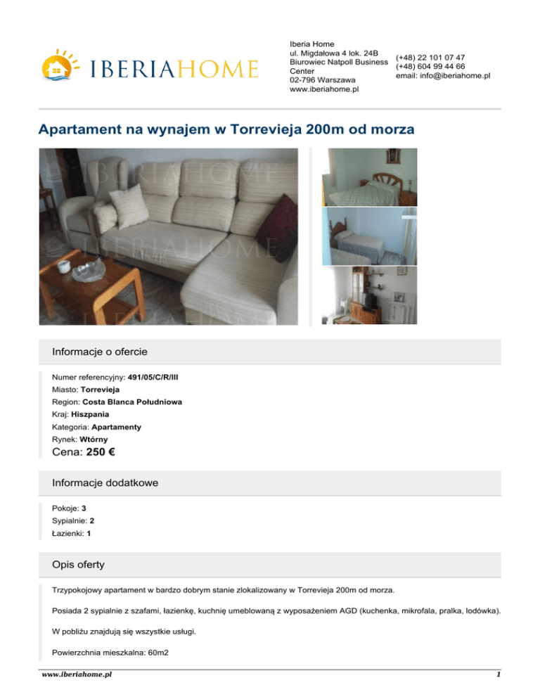 Iberia Home ul. Migdałowa 4 lok. 24B (+48) 22 101 07 47 Biurowiec Natpoll Business (+48) 604 99 44 66 Center email: [email protected] 02-796 Warszawa www.iberiahome.pl Apartament na wynajem w Torrevieja 200m od morza Informacje o ofercie Numer referencyjny: 491/05/C/R/III Miasto: Torrevieja Region: Costa Blanca Południowa Kraj: Hiszpania Kategoria: Apartamenty Rynek: Wtórny Cena: 250 € Informacje dodatkowe Pokoje: 3 Sypialnie: 2 Łazienki: 1 Opis oferty Trzypokojowy apartament w bardzo dobrym stanie zlokalizowany w Torrevieja 200m od morza. Posiada 2 sypialnie z szafami, łazienkę, kuchnię umeblowaną z wyposażeniem AGD (kuchenka, mikrofala, pralka, lodówka). W pobliżu znajdują się wszystkie usługi. Powierzchnia mieszkalna: 60m2 www.iberiahome.pl 1 Cena za wynajem za tydzień: Maj: 250 EUR Czerwiec: 300 EUR Lipiec: 350 EUR Sierpień: 350 EUR Wrzesień: 350 EUR Udogodnienia ● Taras ● Umeblowany www.iberiahome.pl 2