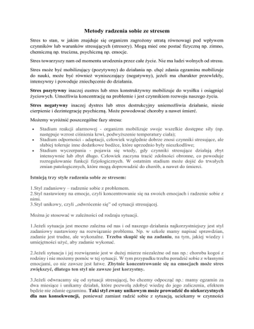 Metody radzenia sobie ze stresem Stres to stan, w jakim znajduje się organizm zagrożony utratą równowagi pod wpływem czynników lub warunków stresujących (stresory). Mogą mieć one postać fizyczną np. zimno, chemiczną np. trucizna, psychiczną np. emocje. Stres towarzyszy nam od momentu urodzenia przez całe życie. Nie ma ludzi wolnych od stresu. Stres może być mobilizujący (pozytywny) do działania np. chęć zdania egzaminu mobilizuje do nauki, może być również wyniszczający (negatywny), jeżeli ma charakter przewlekły, intensywny i powoduje zniechęcenie do działania. Stres pozytywny inaczej eustres lub stres konstruktywny mobilizuje do wysiłku i osiągnięć życiowych. Umożliwia koncentrację na problemie i jest czynnikiem rozwoju naszego życia. Stres negatywny inaczej dystres lub stres destrukcyjny uniemożliwia działanie, niesie cierpienie i dezintegrację psychiczną. Może powodować choroby a nawet śmierć. Możemy wyróżnić poszczególne fazy stresu: Stadium reakcji alarmowej - organizm mobilizuje swoje wszelkie dostępne siły (np. następuje wzrost ciśnienia krwi, podwyższenie temperatury ciała); Stadium odporności - adaptacji, człowiek względnie dobrze znosi czynniki stresujące, ale słabiej toleruje inne dodatkowe bodźce, które uprzednio były nieszkodliwe; Stadium wyczerpania - pojawia się wtedy, gdy czynniki stresujące działają zbyt intensywnie lub zbyt długo. Człowiek zaczyna tracić zdolności obronne, co powoduje rozregulowanie funkcji fizjologicznych. W ostatnim stadium może dojść do trwałych zmian patologicznych, które mogą doprowadzić do chorób, a nawet do śmierci. Istnieją trzy style radzenia sobie ze stresem: 1.Styl zadaniowy – radzenie sobie z problemem. 2.Styl nastawiony na emocje, czyli koncentrowanie się na swoich emocjach i radzenie sobie z nimi. 3.Styl unikowy, czyli „odwrócenie się” od sytuacji stresującej. Można je stosować w zależności od rodzaju sytuacji. 1.Jeżeli sytuacja jest mocno zależna od nas i od naszego działania najkorzystniejszy jest styl zadaniowy nastawiony na rozwiązanie problemu. Np. w szkole mamy napisać sprawdzian, zadanie jest trudne, ale wykonalne. Trzeba skupić się na zadaniu, na tym, jakiej wiedzy i umiejętności użyć, aby zadanie wykonać. 2.Jeżeli sytuacja i jej rozwiązanie jest w dużej mierze niezależne od nas np.: choroba kogoś z rodziny i nie możemy pomóc w tej sytuacji. W tym przypadku trzeba poradzić sobie z własnymi emocjami, co nie zawsze jest łatwe. Zbytnie koncentrowanie się na emocjach może stres zwiększyć, dlatego ten styl nie zawsze jest korzystny. 3.Jeżeli odwracamy się od sytuacji stresującej, bo chcemy odpocząć np.: mamy egzamin za dwa miesiące i unikamy działań, które pozwolą zdobyć wiedzę do jego zaliczenia, efektem będzie nie zdanie egzaminu. Taki styl zwany unikowym może prowadzić do niekorzystnych dla nas konsekwencji, ponieważ zamiast radzić sobie z sytuacją, uciekamy w czynności zastępcze – objadanie się, zakupy, picie alkoholu, oglądanie telewizji, co stosowane w nadmiarze, może prowadzić do uzależnień. W życiu przydają się wszystkie style, ale najbardziej korzystny i efektywny jest styl zadaniowy nastawiony na rozwiązanie problemu. Do stylu zadaniowego warto dołączyć różne dodatkowe, wspomagające metody radzenia sobie ze stresem. Wspomagające metody radzenia sobie ze stresem: 1.Trzeba poznać czynnik, który nas stresuje, a więc poznać źródło sytuacji stresującej. 2.Należy zastanowić się, które sytuacje stresujące możemy wyeliminować ze swojego życia. Niektóre można wyeliminować od razu, niektóre zajmą więcej wysiłku i naszych starań. 3.Są takie sytuacje stresujące, których nie można się pozbyć np. wczesne, poranne wstawanie i musimy się z nimi pogodzić. Akceptacja takich sytuacji bywa trudna, ale jest niezbędna. 4.Szczera rozmowa na temat problemów z bliską, życzliwą osobą to najlepsze lekarstwo na stres. 5.Uśmiechanie się to skuteczny sposób na stres, a zatem trzeba się często uśmiechać. 6.Myślenie pozytywne i docenianie tego, co już posiadamy podnosi odporność na stres. 7. Uprawianie sportów letnich i zimowych to wspaniały relaks dla organizmu, warto wybrać dla siebie cos interesującego np.: pływanie, rolki, łyżwy, narty, kajak, wspinaczka, jazda na rowerze. Wybór jest bardzo duży. 8.Turystyka też zachęca do relaksu, chodzenie górskimi szlakami, podziwianie przyrody zwiedzanie historycznych miejsc to fascynująca rzeczywistość dająca zadowolenie. 9.Czytanie książek to znany sposób na stres, przenosi nas w inną rzeczywistość, pomaga częściowo zapomnieć o problemach lub czyni je mniejszymi. 10.Aktywność kulturalna jak wyjście do kina, teatru lub na koncert, mecz jest dobrym sposobem na odreagowanie problemów. 11.Słuchanie muzyki barokowej i etnicznej dobrze wycisza nadwyrężone emocje. 12.Posiadanie zainteresowań rozwija osobowość i wzmacnia emocje pozytywne. 13.Dobra organizacja dnia też służy równowadze emocjonalnej. Mając poczucie wykonania zaplanowanych wcześniej obowiązków daje komfort psychiczny. Stres można minimalizować za pomocą ćwiczeń fizycznych i diety. 1.Dieta powinna uwzględniać magnez, a więc należy spożywać produkty, które go posiadają. Magnez wpływa korzystnie na układ nerwowy. Można go znaleźć w takich produktach jak: chleb z ziarnami, pestki dyni, kakao, otręby pszenne, migdały, kasza gryczana, płatki owsiane, groch, banany. 2.Aktywność fizyczna 15-30 minut dziennie wspaniale rozluźnia organizm. Endorfiny produkowane przez organizm rozluźniają mięśnie i zmniejszają dyskomfort psychiczny. 3.Głęboki oddech zmniejsza napięcie i rozluźnia mięśnie. Można to osiągnąć wykonując proste ćwiczenie. Trzeba przyjąć wygodną pozycję, zachowując kręgosłup w linii prostej, wziąć głęboki oddech i powoli wydychać powietrze. Oddechy powinny