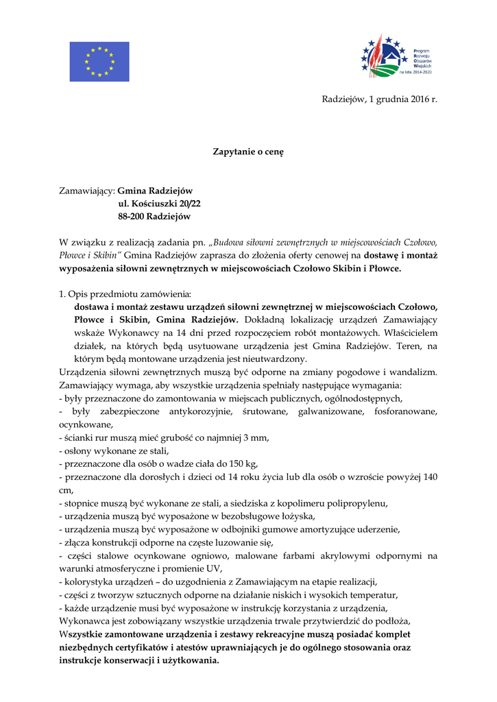 Radziejów, 1 grudnia 2016 r. Zapytanie o cenę Zamawiający: Gmina Radziejów ul. Kościuszki 20/22 88-200 Radziejów W związku z realizacją zadania pn. „Budowa siłowni zewnętrznych w miejscowościach Czołowo, Płowce i Skibin” Gmina Radziejów zaprasza do złożenia oferty cenowej na dostawę i montaż wyposażenia siłowni zewnętrznych w miejscowościach Czołowo Skibin i Płowce. 1. Opis przedmiotu zamówienia: dostawa i montaż zestawu urządzeń siłowni zewnętrznej w miejscowościach Czołowo, Płowce i Skibin, Gmina Radziejów. Dokładną lokalizację urządzeń Zamawiający wskaże Wykonawcy na 14 dni przed rozpoczęciem robót montażowych. Właścicielem działek, na których będą usytuowane urządzenia jest Gmina Radziejów. Teren, na którym będą montowane urządzenia jest nieutwardzony. Urządzenia siłowni zewnętrznych muszą być odporne na zmiany pogodowe i wandalizm. Zamawiający wymaga, aby wszystkie urządzenia spełniały następujące wymagania: - były przeznaczone do zamontowania w miejscach publicznych, ogólnodostępnych, - były zabezpieczone antykorozyjnie, śrutowane, galwanizowane, fosforanowane, ocynkowane, - ścianki rur muszą mieć grubość co najmniej 3 mm, - osłony wykonane ze stali, - przeznaczone dla osób o wadze ciała do 150 kg, - przeznaczone dla dorosłych i dzieci od 14 roku życia lub dla osób o wzroście powyżej 140 cm, - stopnice muszą być wykonane ze stali, a siedziska z kopolimeru polipropylenu, - urządzenia muszą być wyposażone w bezobsługowe łożyska, - urządzenia muszą być wyposażone w odbojniki gumowe amortyzujące uderzenie, - złącza konstrukcji odporne na częste luzowanie się, - części stalowe ocynkowane ogniowo, malowane farbami akrylowymi odpornymi na warunki atmosferyczne i promienie UV, - kolorystyka urządzeń – do uzgodnienia z Zamawiającym na etapie realizacji, - części z tworzyw sztucznych odporne na działanie niskich i wysokich temperatur, - każde urządzenie musi być wyposażone w instrukcję korzystania z urządzenia, Wykonawca jest zobowiązany wszystkie urządzenia trwale przytwierdzić do podłoża, Wszystkie zamontowane urządzenia i zestawy rekreacyjne muszą posiadać komplet niezbędnych certyfikatów i atestów uprawniających je do ogólnego stosowania oraz instrukcje konserwacji i użytkowania. Czołowo Elementy siłowni zewnętrznych: Zestaw fitness orbitek + biegacz na pylonie podwójnym – 1szt. Zestaw fitness drążek + twister na pylonie podwójnym – 1szt. Zestaw fitness wyciskanie siedząc + wyciąg górny na pylonie podwójnym – 1 szt. Zestaw fitness prasa nożna + jeździec na pylonie podwójnym – 1 szt. Zestaw fitness koła tai chi + rower na pylonie podwójnym – 1 szt. Zestaw fitness wioślarz + drabinka na pylonie podwójnym – 1 szt. Masażysta – 1 szt. Płowce Elementy siłowni zewnętrznych: Zestaw fitness orbitek + biegacz na pylonie podwójnym – 1szt. Zestaw fitness drążek + twister na pylonie podwójnym – 1szt. Zestaw fitness wyciskanie siedząc + wyciąg górny na pylonie podwójnym – 1 szt. Zestaw fitness prasa nożna + jeździec na pylonie podwójnym – 1 szt. Zestaw fitness koła tai chi + rower na pylonie podwójnym – 1 szt. Zestaw fitness wioślarz + drabinka na pylonie podwójnym – 1 szt. Masażysta – 1 szt. Skibin Elementy siłowni zewnętrznych: Zestaw fitness orbitek + biegacz na pylonie podwójnym – 1szt. Zestaw fitness drążek + twister na pylonie podwójnym – 1szt. Zestaw fitness wyciskanie siedząc + wyciąg górny na pylonie podwójnym – 1 szt. Zestaw fitness prasa nożna + jeździec na pylonie podwójnym – 1 szt. Zestaw fitness koła tai chi + rower na pylonie podwójnym – 1 szt. Zestaw fitness wioślarz + drabinka na pylonie podwójnym – 1 szt. Masażysta – 1 szt. 2. Wymagany termin realizacji przedmiotu zamówienia: II kw. 2017 r. Zamawiający uzależnia termin realizacji zadania od otrzymania dotacji z Programu Rozwoju Obszarów Wiejskich na lata 2014 – 2020. 3. Oferty mogą składać Wykonawcy dysponujący personelem posiadającym wiedzę i doświadczenie do wykonania przedmiotu zamówienia. 4. Przy wyborze oferty do realizacji Zamawiający będzie kierował się kryterium: cena - 100% 5. Opis sposobu obliczenia ceny w składanej ofercie: Cena powinna zawierać: 1) wartość dostawy* /usługi*/roboty budowlanej* określoną w oparciu o przedmiot zamówienia; 2) obowiązujący podatek od towarów i usług VAT; 3) wartość cenową należy podać w złotych polskich cyfrą, z dokładnością do dwóch miejsc po przecinku, oraz słownie; 4) cena powinna zawierać wszelkie koszty związane z wykonaniem zamówienia; 5) cena podana przez wykonawcę za świadczoną usługę, dostawę, robotę budowlaną* jest obowiązująca przez okres ważności umowy * i nie będzie podlegała waloryzacji w okresie jej trwania; 6) cena podana ogólnie i w rozbiciu na poszczególne elementy. 7) Oprócz ceny proszę również o podanie: - możliwego terminu wykonania zamówienia, - warunków płatności, - warunków gwarancji. 6. Miejsce i termin złożenia oferty: 1) Ofertę należy złożyć do dnia 09.12.2016 r., godz. 12.00, 2) Dopuszcza się złożenie oferty: – w formie papierowej na adres: Urząd Gminy Radziejów, ul. Kościuszki 20/22, 88-200 Radziejów; – za pośrednictwem faksu: (54) 285 33 37; – za pośrednictwem poczty elektronicznej: [email protected]. 7. Miejsce i termin otwarcia oferty: Otwarcie złożonych ofert nastąpi w dniu 09.12.2016 r. r., godz. 15.00. 8. Osobami uprawnionymi do kontaktów z Oferentami i udzielania wyjaśnień dotyczących postępowania są: 1) Urszula Liedkiewicz: (54) 285 36 86, [email protected]; Z poważaniem, Wójt Gminy Radziejów Marek Szuszman