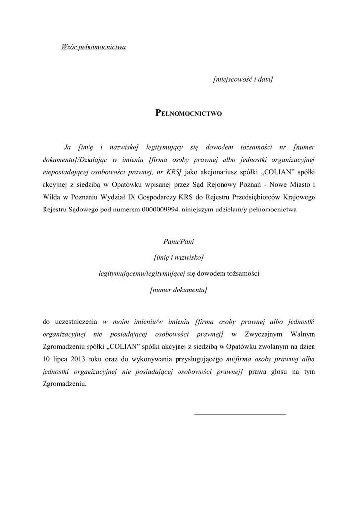 Wzór pełnomocnictwa [miejscowość i data] PEŁNOMOCNICTWO Ja [imię i nazwisko] legitymujący się dowodem tożsamości nr [numer dokumentu]/Działając w imieniu [firma osoby prawnej albo jednostki organizacyjnej nieposiadającej osobowości prawnej, nr KRS] jako akcjonariusz spółki „COLIAN” spółki akcyjnej z siedzibą w Opatówku wpisanej przez Sąd Rejonowy Poznań - Nowe Miasto i Wilda w Poznaniu Wydział IX Gospodarczy KRS do Rejestru Przedsiębiorców Krajowego Rejestru Sądowego pod numerem 0000009994, niniejszym udzielam/y pełnomocnictwa Panu/Pani [imię i nazwisko] legitymującemu/legitymującej się dowodem tożsamości [numer dokumentu] do uczestniczenia w moim imieniu/w imieniu [firma osoby prawnej albo jednostki organizacyjnej nie posiadającej osobowości prawnej] w Zwyczajnym Walnym Zgromadzeniu spółki „COLIAN” spółki akcyjnej z siedzibą w Opatówku zwołanym na dzień 10 lipca 2013 roku oraz do wykonywania przysługującego mi/firma osoby prawnej albo jednostki organizacyjnej nie posiadającej osobowości prawnej] prawa głosu na tym Zgromadzeniu.