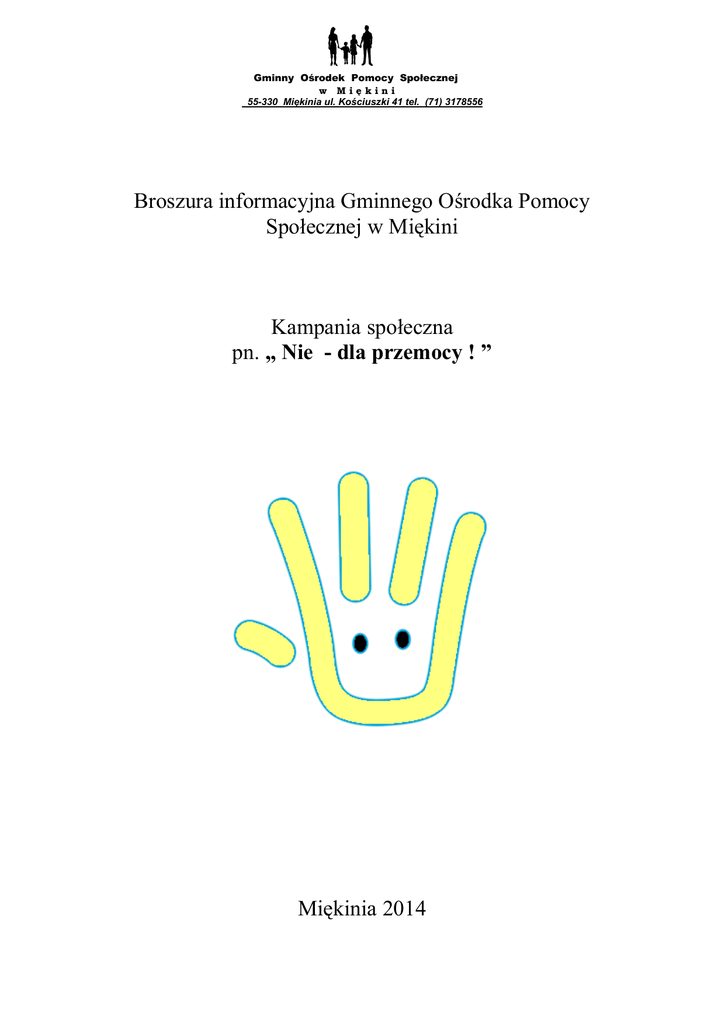 Gminny Ośrodek Pomocy Społecznej w Miękini 55-330 Miękinia ul. Kościuszki 41 tel. (71) 3178556 Broszura informacyjna Gminnego Ośrodka Pomocy Społecznej w Miękini Kampania społeczna pn. „ Nie - dla przemocy ! ” Miękinia 2014 Gminny Ośrodek Pomocy Społecznej w Miękini 55-330 Miękinia ul. Kościuszki 41 tel. (71) 3178556 Definicja przemocy w rodzinie Zgodnie z ustawą o przeciwdziałaniu przemocy w rodzinie, pod pojęciem tym rozumie się jednorazowe albo powtarzające się umyślne działanie lub zaniechanie naruszające prawa lub dobra osobiste członków rodziny. Przemoc prowadzi do narażenia poddanych jej członków rodziny na niebezpieczeństwo utraty życia, zdrowia, narusza ich godność, nietykalność cielesną, wolność, w tym seksualną, powoduje szkody na ich zdrowiu fizycznym lub psychicznym, a także wywołuje cierpienia i krzywdy moralne u osób dotkniętych przemocą. Gminny Ośrodek Pomocy Społecznej w Miękini 55-330 Miękinia ul. Kościuszki 41 tel. (71) 3178556 Postać i formy przemocy w rodzinie Przemoc może mieć postać: przemocy fizycznej, np. popychanie, odpychanie, obezwładnianie, przytrzymywanie, policzkowanie, szczypanie, kopanie, duszenie, bicie otwartą ręką i pięściami, bicie przedmiotami, przedmiotami, ciskanie parzenie, polewanie w kogoś substancjami żrącymi, użycie broni, porzucanie w niebezpiecznej okolicy, nieudzielanie koniecznej pomocy, itp. przemocy psychicznej, np. wyśmiewanie poglądów, religii, pochodzenia, narzucanie własnych poglądów, karanie przez odmowę uczuć, zainteresowania, szacunku, stała krytyka, wmawianie choroby psychicznej, izolacja społeczna (kontrolowanie i ograniczanie kontaktów z innymi osobami), domaganie się posłuszeństwa, ograniczanie snu i pożywienia, degradacja werbalna (wyzywanie, poniżanie, zawstydzanie),stosowanie gróźb, itp., upokarzanie, Gminny Ośrodek Pomocy Społecznej w Miękini 55-330 Miękinia ul. Kościuszki 41 tel. (71) 3178556 przemocy seksualnej, np. wymuszanie pożycia seksualnego, wymuszanie nieakceptowanych pieszczot i praktyk seksualnych, wymuszanie seksu z osobami trzecimi, sadystyczne formy współżycia seksualnego, demonstrowanie zazdrości, krytyka zachowań seksualnych kobiety, itp. przemocy ekonomicznej, np. odbieranie zarobionych pieniędzy, uniemożliwianie podjęcia pracy zarobkowej, nie zaspokajanie podstawowych, materialnych potrzeb rodziny, itp. Przemoc w rodzinie dotyka nie tylko dorosłych (w szczególności kobiety), ale i dzieci. Gminny Ośrodek Pomocy Społecznej w Miękini 55-330 Miękinia ul. Kościuszki 41 tel. (71) 3178556 O przemocy możemy mówić wtedy, gdy zostaną spełnione 4 warunki: Jest to intencjonalne działanie lub zaniechanie działania Jedna osoba ma wyraźną przewagę nad drugą Działanie lub zaniechanie jednej osoby narusza prawa i dobra osobiste drugiej Osoba wobec której stosowana jest przemoc, doznaje cierpienia i szkód fizycznych i psychicznych Gminny Ośrodek Pomocy Społecznej w Miękini 55-330 Miękinia ul. Kościuszki 41 tel. (71) 3178556 Jest to intencjonalne działanie lub zaniechanie działania. Ktoś sadzi, że wie co jest dla drugiego dobre lub daje sobie prawo do decydowania w jego imieniu. Jest, przy tym, "święcie" przekonany, że ten drugi powinien mu się "bezwzględnie" podporządkować i zaspokoić jego "jedynie słuszne" życzenia. Mając najlepsze intencje, chce spowodować, by było tak, jak on chce. Nieważne jest tu stanowisko drugiej osoby, jej zdanie, chęci i potrzeby - ma być tak jak on sobie życzy i "to już", "natychmiast", "bez dyskusji i gadania". Przykład: dwie dorosłe mieszkające ze sobą osoby, mają różne upodobania w zakresie spędzania wolnego czasu. Jedna lubi siedzieć w domu i oglądać telewizję, a druga uwielbia spotykać się ze znajomymi i spędzać czas poza domem. Ta "od domu i telewizji" uważa swoje upodobanie za właściwie i stara się wpłynąć na drugą, by przyjęła taki model spędzania wolnego czasu. Prosi, tłumaczy, przekonuje, wyśmiewa, ocenia, krytykuje, obraża się i szantażuje, czasem używa pięści... Gminny Ośrodek Pomocy Społecznej w Miękini 55-330 Miękinia ul. Kościuszki 41 tel. (71) 3178556 Jedna osoba ma wyraźną przewagę nad drugą, jest silniejsza fizycznie, psychicznie, materialnie, zawodowo, społecznie i w wymiarze tej przewagi oddziałuje na osobę słabszą, po to, by zmusić ją do podporządkowania swoim życzeniom. Przykład: Żona zajmuje się domem i dziećmi, a rodzina utrzymuje się z zarobków męża. Mąż ma konto w banku, karty i całkowitą kontrolę nad finansami. Mówi, że skoro zarabia, to wszystkie pieniądze są jego. Na bieżące potrzeby daje pieniądze w zależności od własnego uznania i zadowolenia z żony i dzieci. Uważa, że żona odpowiada za atmosferę w domu, zachowanie dzieci i ich postępy w nauce. Nie ma zawalających go efektów - nie ma pieniędzy. Gorszy stopień któregoś z dzieci, niedokładnie posprzątane mieszkanie, niechęć żony do zbliżeń - powody bywają różne. Wyłącznie od oceny męża zależy, co rodzina zje, w co się ubierze, jak spędzi wakacje, itp. Bywa " głodno i chłodno", choć mąż nieźle zarabia. Wykorzystuje fakt dostępu "wychowywać" żonę i dzieci. do pieniędzy, by Gminny Ośrodek Pomocy Społecznej w Miękini 55-330 Miękinia ul. Kościuszki 41 tel. (71) 3178556 Działanie lub zaniechanie jednej osoby narusza prawa i dobra osobiste drugiej. Jedna osoba daje sobie prawo, by drugą uderzyć, obrazić, skrytykować, zabrać coś, nie dać. Nie liczy się z jej potrzebami, życzeniami, protestami, uczuciami. Traktuje daną osobę, jak przedmiot - pozbawiony praw. Przykład: Żona otwiera i czyta korespondencję adresowaną do męża. Na jego uwagę, że nie podoba mu się, że bez uzgodnienia to robi - odpowiada, że "ani myśli przestawać, bo małżeństwo to jedność i ma do tego prawo". Nadal otwiera i czyta jego korespondencję - za nic mając jego 