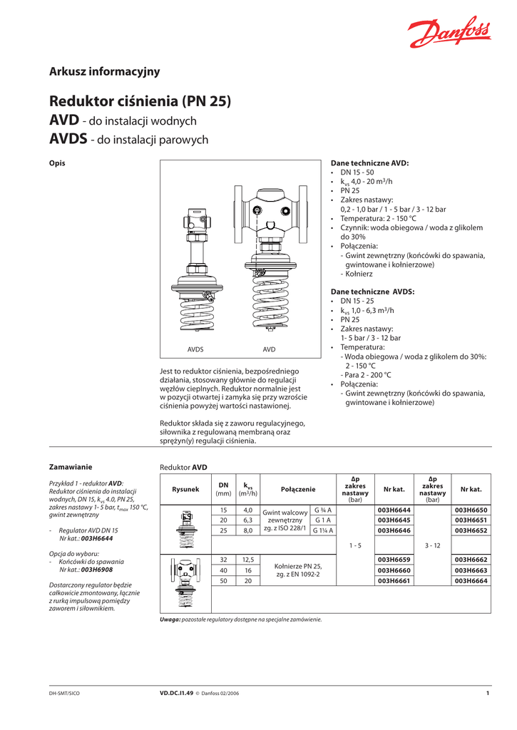 Arkusz informacyjny Reduktor ciśnienia (PN 25) AVD - do instalacji wodnych AVDS - do instalacji parowych Opis Dane techniczne AVD: • DN 15 - 50 • k vs 4,0 - 20 m3/h • PN 25 • Zakres nastawy: 0,2 - 1,0 bar / 1 - 5 bar / 3 - 12 bar • Temperatura: 2 - 150 °C • Czynnik: woda obiegowa / woda z glikolem do 30% • Połączenia: - Gwint zewnętrzny (końcówki do spawania, gwintowane i kołnierzowe) - Kołnierz AVDS AVD Jest to reduktor ciśnienia, bezpośredniego działania, stosowany głównie do regulacji węzłów cieplnych. Reduktor normalnie jest w pozycji otwartej i zamyka się przy wzroście ciśnienia powyżej wartości nastawionej. Dane techniczne AVDS: • DN 15 - 25 • k vs 1,0 - 6,3 m3/h • PN 25 • Zakres nastawy: 1- 5 bar / 3 - 12 bar • Temperatura: - Woda obiegowa / woda z glikolem do 30%: 2 - 150 °C - Para 2 - 200 °C • Połączenia: - Gwint zewnętrzny (końcówki do spawania, gwintowane i kołnierzowe) Reduktor składa się z zaworu regulacyjnego, siłownika z regulowaną membraną oraz sprężyn(y) regulacji ciśnienia. Zamawianie Przykład 1 - reduktor AVD: Reduktor ciśnienia do instalacji wodnych, DN 15, k vs 4.0, PN 25, zakres nastawy 1- 5 bar, tmax 150 °C, gwint zewnętrzny - Regulator AVD DN 15 Nr kat.: 003H6644 Opcja do wyboru: - Końcówki do spawania Nr kat.: 003H6908 Dostarczony regulator będzie całkowicie zmontowany, łącznie z rurką impulsową pomiędzy zaworem i siłownikiem. Reduktor AVD Rysunek DN (mm) k vs (m3/h) Połączenie 15 20 25 4,0 6,3 8,0 Gwint walcowy G ¾ A G1A zewnętrzny zg. z ISO 228/1 G 1¼ A ∆p zakres nastawy (bar) Nr kat. 003H6644 003H6645 003H6646 1-5 32 12,5 40 16 50 20 Kołnierze PN 25, zg. z EN 1092-2 ∆p zakres nastawy (bar) Nr kat. 003H6650 003H6651 003H6652 3 - 12 003H6659 003H6662 003H6660 003H6663 003H6661 003H6664 Uwaga: pozostałe regulatory dostępne na specjalne zamówienie. DH-SMT/SICO VD.DC.I1.49 © Danfoss 02/2006 1 Arkusz informacyjny Reduktor ciśnienia AVD, AVDS (PN 25) Zamawianie (ciąg dalszy) Reduktor AVDS Przykład 2 - reduktor AVDS: Reduktor ciśnienia do instalacji parowych, DN 15, k vs 3.2, PN 25, zakres nastawy 1- 5 bar, tmax 200 °C, gwint zewnętrzny - Rysunek - Naczynie kondensacyjne Nr kat.: 003H0277 1,0 1,6 3,2 4,5 6,3 20 25 Opcja do wyboru: - Rurka impulsowa zestaw AV 1⁄8” Nr kat.: 003H6852 Końcówki do spawania Nr kat.: 003H6908 k vs (m3/h) 15 Regulator AVDS DN 15 Nr kat.: 003H6667 - DN (mm) ∆p zakres nastawy (bar) Połączenie Gwint zewnętrzny walcowy zg. z ISO 228/1 003H6665 003H6666 003H6667 003H6668 003H6669 G¾ A G1A G 1¼ A ∆p zakres nastawy (bar) Nr kat. 1-5 3 - 12 Nr kat. 003H6670 003H6671 003H6672 003H6673 003H6674 Akcesoria Rysunek Oznaczenie elementu Końcówki do spawania Dostarczony regulator będzie całkowicie zmontowany. Zewnętrzna rurka impulsowa (AV) i naczynie kondensacyjne muszą być zamówione oddzielnie. Końcówki z gwintem zewnętrznym Kołnierz DN 15 20 25 15 20 25 15 20 25 Połączenie - Gwint zewnętrzny stożkowy zg. z EN 10226 -1 R ½” R ¾” R 1” Kołnierze PN 25, zg. z EN 1092-2 Opis: R 1⁄8” - 1x rurka miedziana Ø6 × 1 × 1500 mm R 3⁄8” - 1x złączka zaciskowa* do rurki R ½” impulsowej Ø6 × 1 mm * 10 sztuk złączek zaciskowych do rurek impulsowych, Ø6 × 1 mm R 1⁄8” * 10sztuk złączek zaciskowych do rurek impulsowych, Ø6 × 1 mm R 3⁄8” * 10 sztuk złączek zaciskowych do rurek impulsowych, Ø6 × 1 mm R ½” * 10 sztuk złączek zaciskowych do rurek impulsowych, Ø6 × 1 mm G 1⁄8” Zawór odcinający Ø6 mm Naczynie kondensacyjne 0,3 l, z dwoma zestawami złączek zaciskowych , Ø6 x 1 mm Rurka impulsowa zestaw AV Nr kat. 003H6908 003H6909 003H6910 003H6902 003H6903 003H6904 003H6915 003H6916 003H6917 003H6852 003H6853 003H6854 003H6857 003H6858 003H6859 003H6931 003H0276 003H0277 * Złączka zaciskowa składa się z nypla, pierścienia uszczelniającego oraz nakrętki. Części zapasowe Rysunek Oznaczenie elementu Wkład zaworu* Dławica** Siłownik ze sprężyną nastawną DN 15 20 25 32 / 40 / 50 15 / 20 / 25 k vs (m3/h) 4,0 6,3 8,0 12,5 / 16 / 20 3,2 / 4,5 / 6,3 Nr kat. 003H6873 003H6874 003H6875 003H6876 003H6877 Δp zakres nastawy (bar) 1-5 003H6844 3 - 12 003H6845 Nr kat. * tylko do reduktorów AVD ** tylko do reduktorów AVDS 2 VD.DC.I1.49 © Danfoss 02/2006 DH-SMT/SICO Arkusz informacyjny Reduktor ciśnienia AVD, AVDS (PN 25) Dane techniczne Zawór (AVD) Średnica nominalna k vs Współczynnik kawitacji z * Ciśnienie nominalne Maks. różnica ciśnień Czynnik pH czynnika Temperatura czynnika DN m3/h PN bar zawór Połączenia końcówki 15 4,0 20 6,3 25 8,0 32 12,5 40 16 50 20 ≥ 0,6 25 20 16 Woda obiegowa / woda z glikolem do 30% Min. 7, max. 10 2 -150 °C Gwint Kołnierz Do spawania, gwint zewnętrzny i kołnierz Materiał Brąz CuSn5ZnPb (Rg5) gwint Korpus zaworu - kołnierz Gniazdo zaworu Grzybek zaworu Uszczelnienie - Żeliwo sferoidalne EN-GJS-400-18-LT (GGG 40.3) Stal nierdzewna, nr 1.4571 Mosiądz CuZn36Pb2As EPDM * k v/k vs ≤ 0,5 dla DN 25 i większych Zawór (AVDS) Średnica nominalna k vs Współczynnik kawitacji z * Ciśnienie nominalne Maks. różnica ciśnień Czynnik pH czynnika Temperatura czynnika DN m3/h PN bar zawór końcówki Połączenia Materiał Korpus zaworu Gniazdo zaworu Grzybek zaworu 1,0 15 1,6 20 25 3,2 4,5 6,3 ≥ 0,6 25 10 Para / Woda obiegowa / woda z glikolem do 30% Min. 7, max. 10 2 - 200 °C Gwint Do spawania, gwint zewnętrzny i kołnierz Brąz CuSn5ZnPb (Rg5) Stal nierdzewna, nr 1.4571 Stal nierdzewna, nr 1.4122 * k v/k vs ≤ 0,5 dla DN 25 i większych Siłownik Powierzchnia robocza Ciśnienie nominalne cm2 PN Zakres nastawy różnicy ciśnień i kolory sprężyn bar 54 25 1-5 niebieski 3 - 12 czarny, zielony Materiał Obudowa siłownika Górna obudowa membrany Dolna obudowa membrany Membrana Rurka impulsowa DH-SMT/SICO VD.DC.I1.49 © Danfoss 02/2006 Stal nierdzewna, nr 1.4301 Mosiądz CuZn36Pb2As EPDM Rurka miedziana Ø6 × 1 mm 3 Arkusz informacyjn