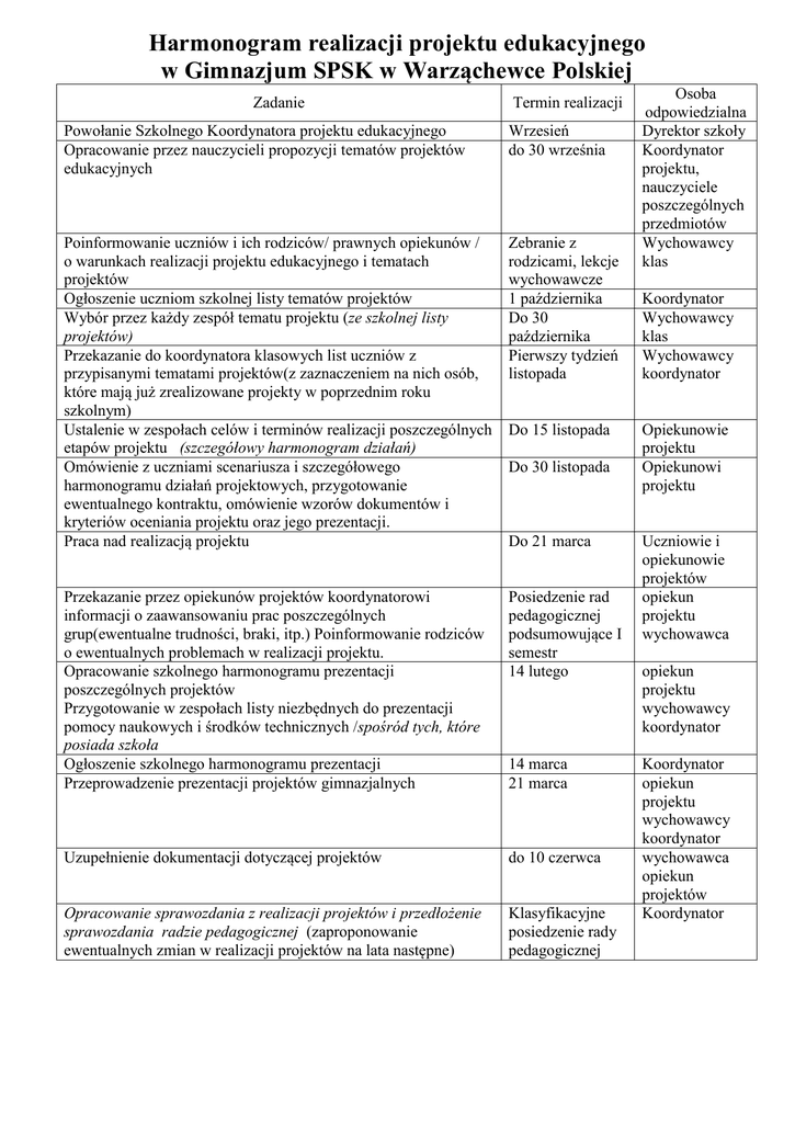 Harmonogram realizacji projektu edukacyjnego w Gimnazjum SPSK