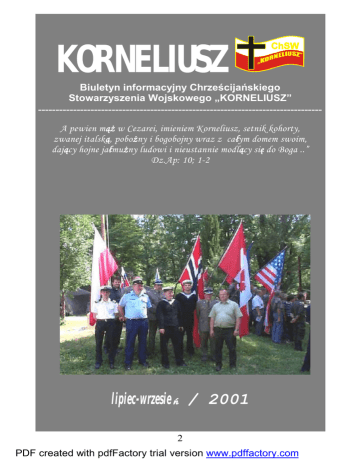 KORNELIUSZ Biuletyn informacyjny Chrześcijańskiego Stowarzyszenia Wojskowego „KORNELIUSZ” --------------------------------------------------------------------------------A pewien mąż w Cezarei, imieniem Korneliusz, setnik kohorty, zwanej italską, pobożny i bogobojny wraz z całym domem swoim, dający hojne jałmużny ludowi i nieustannie modlący się do Boga ..” Dz.Ap: 10; 1-2 lipiec-wrzesień / 2001 2 PDF created with pdfFactory trial version www.pdffactory.com Chrześcijańskie Stowarzyszenie Wojskowe "KORNELIUSZ" jest dobrowolną organizacją chrześcijan, związanych zawodowo ze środowiskiem wojskowym. Celem Stowarzyszenia jest głoszenie ewangelii Jezusa Chrystusa oraz tworzenie więzi braterstwa chrześcijańskiego w środowisku wojskowym, bez względu na zajmowane stanowisko służbowe i posiadany stopień wojskowy. Stowarzyszenie realizuje ten cel przy współpracy z kapelanami wojskowymi i pracownikami pionu społeczno - wychowawczego poprzez: a) pomaganie członkom Stowarzyszenia w realizowaniu zasad wiary w życiu zawodowym i rodzinnym, b) popularyzowanie w środowisku wojskowym Pisma Świętego jako Bożego Słowa, c) zachęcanie do studiowania Biblii i stosowania w codziennym życiu zasad biblijnych - szczerej, czystej wiary we wszystkich jej aspektach, d) wzmacnianie każdego członka Stowarzyszenia w prawdzie Bożej i miłości do Boga w Jezusie Chrystusie. Stowarzyszenie współpracuje z AMCF (Associacion of Military Christian Fellowships) oraz ACCTS (Association for Christian Conferences, Teaching and Service) działających w armiach wielu państw świata. Członkami zwyczajnymi Stowarzyszenia mogą być: a) żołnierze zawodowi, nadterminowi i kontraktowi, b) pracownicy cywilni wojska, c) emeryci i renciści wojskowi, d) małżonkowie wyżej wymienionych, którzy wierzą, że Biblia jest natchnionym Słowem Bożym, wierzą, że Jezus Chrystus jest odwiecznym Synem Bożym i przyjęli Go jako osobistego Zbawiciela, a zasady wiary stosują w życiu codziennym. Dopuszcza się członkostwo w Stowarzyszeniu funkcjonariuszy Policji, Straży Granicznej, Państwowej Straży Pożarnej i Służby Więziennej. Ze Statutu Chrześcijańskiego Stowarzyszenia Wojskowego "K O R N E L I U S Z" ChSW „Korneliusz” posiada osobowość prawną i działa na podstawie: 1. 2. 3. Przepisów ustawy z dnia 7 kwietnia 1989r. (Dz.U. Nr 20/89 poz.104) Statutu zaakceptowanego przez Ministra Obrony Narodowej pismem Nr 975/98 z dnia 24 lipca 1998r. Postanowienia Sądu Okręgowego w Poznaniu z dnia 28 maja 1999r. 3 PDF created with pdfFactory trial version www.pdffactory.com Po tym wszyscy poznają, żeście uczniami moimi, jeśli miłość wzajemną mieć będziecie. (Ew. Św. Jana 13.35) Każdy z nas pragnie być kochany. Filmy, które oglądamy, piosenki, których słuchamy, wiele czytanych przez nas książek - wszystkie one ukazują ludzką potrzebę miłości. Uważam, ze miłość nie jest jedynie uczuciem, ale raczej stanowi styl życia. Pewien autor piosenek powiedział, że miłość to „czasownik”, który wymaga działania. Św. Jan przypomina nam, że miłość wobec innych ludzi stanowi wyraz naszej miłości dla Boga. Jednak styl życia oparty na tym uczuciu nie jest łatwy. Żyjąc w taki sposób, idziemy drogą, na której czekają nas zawody serca, odrzucenie i ból. Towarzyszą nam jednak obietnica i pewność Bożej miłości, które umacniają nas na tej drodze. Miłość polega na byciu tam, gdzie jesteśmy w danym momencie potrzebni, bez oczekiwania niczego w zamian. Chrześcijańska miłość nie pyta: „A co ze mną?” Kochać naszych braci to nie znaczy serdecznie akceptować tych, których lubimy lub, z których poglądami się zgadzamy; chodzi tu raczej o kochanie tych, od których coś nas dzieli. Powinniśmy ich kochać z tego prostego względu, że - tak jak i my - stanowią oni jedną Chrystusową rodzinę. Bycie otwartym na kochanie Bożych ludzi sprawia, że stajemy się dla nich błogosławieństwem. Jest to zarazem zabezpieczeniem przed samolubną potrzebą uznania ze strony innych za zrobienie czegoś, co wyróżnia w świecie uczniów Chrystusa – a mianowicie kochania swoich braci właśnie z racji miłości do naszego Pana I choćbym miał dar prorokowania, i znał wszystkie tajemnice, i posiadał całą wiedze, i choćbym miał pełnię wiary, tak żebym góry przenosił, a miłości bym nie miał, byłbym niczym. (1 List Św. Pawła do Koryntian 13.2) Igor Sawicki Drodzy Czytelnicy! Oddajemy wam kolejny numer naszego biuletynu w nieco zmienionej szacie graficznej i formie. Liczymy na Wasze uwagi i propozycje, jak również na materiały, które moglibyśmy tu zamieszczać. Piszcie do nas! 4 PDF created with pdfFactory trial version www.pdffactory.com Być wonnością Chrystusa my powiedzieć, że grzesznik, człowiek martwy dla Boga z powodu swojego grzechu, cuchnie (tak jak Łazarz, gdy martwy spoczywał w grobie przez kilka dni). Cuchnie grzechem, nieczystością, pożądaniem, chciwością, egoizmem, samowolą, pychą, nieprzebaczeniem, nieuczciwością, zazdrością, nienawiścią, złością, żeby wymienić tylko te największego kalibru. Ale to, co stare, przeminęło w Chrystusie! On uczynił nasze życie nowym, gdy nawróciliśmy się do Niego. Jednak grzech, nieposłuszeństwo Bogu zawsze pozbawi nas wonności Chrystusowej. Biblia mówi, że cielesny chrześcijanin ma tylko imię, że żyje, lecz jest martwy – i cuchnie! Co zatem mamy zrobić, aby być pełną wonnością Chrystusową i rozsiewać zapach Chrystusa wokół nas? To jest tak ważne, gdy jesteś dzieckiem Bożym w mundurze i nie zawsze masz możność otwartego głoszenia Ewangelii, a przez to oddziaływania Słowem Bożym na ludzi. Jak każdy chrześcijanin możesz oddziaływać na twoje otoczenie potężną, nieodpartą i tak przekonującą wonią Jezusa mieszkającego w tobie. Możesz – i powinieneś – być solą ziemi i światłością świata, człowiekiem