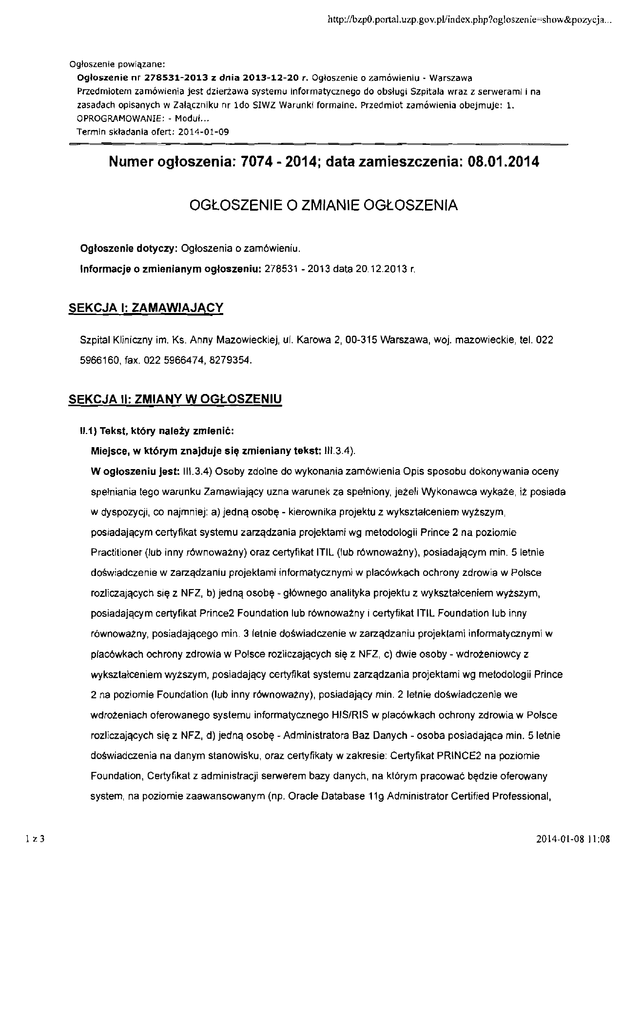 Ogtoszenie powiqzane: Ogloszenie nr 278531-2013z dnia 2013-12-20r. Ogloszenie o zamowieniu - Warszawa Przedrniotern zarnowienia jest dzieriawa systernu inforrnatycznego do obslugi Szpitala wraz z serwerami i na zasadach opisanych w Zatqczniku nr ldo SIWZ Warunki forrnalne. Przedmiot zamowienia obejmuje: 1. OPROGRAMOWANIE: - Modui... Termin sktadania ofert: 2014-01-09 Numer ogtoszenia: 7074 - 2014; data zamieszczenia: 08.01.2014 Ogloszenie dotyczy: Ogloszenia o zam6wieniu lnformacje o zmienianym ogloszeniu: 278531 - 2013 data 20.12.2013 r. SEKCJA I: ZAMAWIAJACY Szpital Kliniczny im. Ks. Anny Mazowieckiej, ul. Karowa 2, 00-315 Warszawa, woj. mazowieckie, tel. 022 5966160, fax. 022 5966474,8279354. SEKCJA II: ZMIANY W OGLOSZENIU 11.1) Tekst, ktoly naleiy zmienic: Miejsce, w ktbryrn znajduje siq zmieniany tekst: 111.3.4). W ogtoszeniu jest: 111.3.4) Osoby zdolne do wykonania zamowienia Opis sposobu dokonywania oceny spetniania tego warunku Zamawiajqcy uzna warunek za spelniony, jeieli Wykonawca wykaie, it posiada w dyspozycji, co najmniej: a) jednq osobe - kierownika projektu z wyksztalceniem wyiszym, posiadajqcym certyfikat systemu zarzqdzania projektami wg metodologii Prince 2 na poziomie Practitioner (lub inny r6wnowainy) oraz certyfikat ITlL (lub rbwnowatny), posiadajqcym min. 5 letnie doswiadczenie w zarzqdzaniu projektami informatycznymi w placowkach ochrony zdrowia w Polsce - rozliuajqcych sie z NFZ, b) jednq osobe gl6wnego analityka projektu z wyksztalceniem wytszym, posiadajqcym certyfikat Prince2 Foundation lub r6wnowatny i certyfikat ITlL Foundation lub inny rownowainy, posiadajqcego min. 3 ietnie doswiadczenie w zarzqdzaniu projektami informatycznymi w piac6wkach ochrony zdrowia w Polsce rozliczajqcych sie z NFZ, c) dwie osoby - wdroteniowcy z wyksztalceniem wyiszym, posiadajqcy certyfikat systemu zarzqdzania projektami wg metodologii Prince 2 na poziomie Foundation (lub inny r6wnowatny), posiadajqcy min. 2 letnie doswiadczenie we wdroteniach oferowanego systemu informatycznego HlSlRlS w placowkach ochrony zdrowia w Polsce rozliczajqcych sie z NFZ, d) jednq osobe - Administratora Baz Danych - osoba posiadajqca min. 5 letnie doswiadczenia na danym stanowisku, oraz certyfikaty w zakresie: Certyfikat PRINCE2 na poziomie Foundation, Certyfikat z administracji serwerem bazy danych, na ktorym pracowac bedzie oferowany system, na poziomie zaawansowanym (np. Oracle Database 11g Administrator Certified Professional, Microsoft SQL Server Certified IT Professional, Sybase Adaptive Server Enterprise Administrator - Professional) lub inny rownowainy, e) jednq osobe - Adrninistratora Systemow Operacyjnych osoba posiadajqca rnin. 5 doswiadczenie na danyrn stanowisku, oraz certyfikaty w zakresie: Certyfikat PRINCE2 na poziomie Foundation iub inny r6wnowainy, Certyfikat z adrninistracji systernern operacyjnyrn na poziornie zaawansowanyrn (np. Microsoft Certified Systems Administrator (MCSA), Red Hat Certified Engineer (RHCE)), Certyfikat z administracji systernern wirtualizacji na poziornie zaawansowanym (np. VMware Certified Professional), ukohczony minimum jeden, certyfikowany przed producenta, kurs z zakresu adrninistracji baz danych.. W ogtoszeniu powinno bye: Zamawiajqcy uzna warunek za spetniony, jeteli Wykonawca wykaie, it posiada w dyspozycji, co najrnniej: a) jednq osobq - kierownika projektu z wyksztalceniern wytszym, posiadajqcyrn certyfikat systernu zarzqdzania projektami wg rnetodologii Prince 2 na poziornie Practitioner (lub inny rownowatny), posiadajqcym min. 5 letnie doSwiadczenie w zarzqdzaniu projektarni inforrnatycznyrni w plac6wkach ochrony zdrowia w Polsce rozliczajqcych sig z NFZ, b) jednq osobg - gl6wnego analityka projektu z wyksztatceniem wytszyrn, posiadajqcyrn certyfikat Prince2 Foundation lub r6wnowainy, posiadajqcego rnin. 3 letnie dohwiadczenie w zarzqdzaniu projektarni informatyunyrni w plac6wkach ochrony zdrowia w Polsce rozliczajqcych sig z NFZ, c) dwie osoby - wdroieniowcy z wyksztalceniern wytszym, posiadajqcy certyfikat systernu zarzqdzania projektarni wg rnetodologii Prince 2 na poziornie Foundation (lub inny r6wnowainy), posiadajqcy rnin. 2 letnie doSwiadczenie we wdrozeniach oferowanego systernu informatyunego HISIRIS w plac6wkach ochrony zdrowia w Polsce rozliczajqcych siq z NFZ, d) jednq osobq -Adrninistratora Baz Danych - osoba posiadajqca rnin. 5 letnie doswiadczenia na danyrn stanowisku, oraz certyfikaty w zakresie: Certyfikat PRINCE2 na poziornie Foundation, Certyfikat z adrninistracji serwerern bazy danych, na kt6rym pracowaC bgdzie oferowany system, na poziomie zaawansowanym (np. Oracle Database 11g Administrator Certified Professional, Microsoft SQL Server Certified IT Professional, Sybase Adaptive Server Enterprise Administrator Professional) iub inny r6wnowainy, e) jednq osobg - Adrninistratora System6w Operacyjnych - osoba posiadajqca min. 5 dohwiadczenie na danym stanowisku, oraz certyfikaty w zakresie: Certyfikat PRINCE2 na poziornie Foundation lub inny r6wnowainy, Certyfikat z adrninistracji systernern operacyjnym na poziornie zaawansowanyrn (np. Microson Certified Systems Administrator (MCSA). Red Hat Certified Engineer (RHCE)). Certyfikat z adrninistracji systernern wirtualizacji na poziomie zaawansowanyrn (np. VMware Certified Professional), ukohczony minimum jeden, certyfikowany przed producenta, kurs z zakresu administracji baz danych.. Miejsce, w ktorym znajduje sie zrnieniany tekst: IV.4.4). W ogtoszeniu jest: Terrnin skladania wniosk6w o dopuszczenie do udzialu w postqpowaniu lub ofert: 09.01.2014 godzina 09:00, rniejsce: Szpital Kliniuny irn. ks. Anny Mazowieckiej - Dzial Zarn6wieh Publicznych ul. Karowa 2; 00-315 Warszawa.. W ogtoszeniu powinno byC: Terrnin skladania wniosk6w o dopuszczenie do udzialu w postgpowaniu lub ofert: 14.01.2014 godzina 09:00, miejsce: Szpital Kliniczny im. ks. Anny Mazowieckiej - Dzial