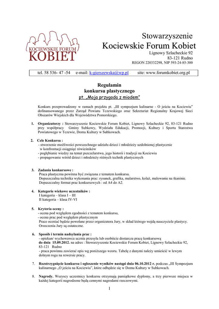 Stowarzyszenie Kociewskie Forum Kobiet Lignowy Szlacheckie 92 83-121 Rudno REGON 220332298, NIP 593-24-85-300 tel. 58 536- 47 -54 e-mail: [email protected] site: www.forumkobiet.org.pl Regulamin konkursu plastycznego pt. „Moja przygoda z miodem” Konkurs przeprowadzony w ramach projektu pt. „III sympozjum kulinarne - O jeściu na Kociewiu” dofinansowanego przez Zarząd Powiatu Tczewskiego oraz Sekretariat Regionalny Krajowej Sieci Obszarów Wiejskich dla Województwa Pomorskiego. 1. Organizatorzy : Stowarzyszenie Kociewskie Forum Kobiet, Lignowy Szlacheckie 92, 83-121 Rudno przy współpracy Gminy Subkowy, Wydziału Edukacji, Promocji, Kultury i Sportu Starostwa Powiatowego w Tczewie, Domu Kultury w Subkowach. 2. Cele Konkursu : - stworzenie możliwości powszechnego udziału dzieci i młodzieży uzdolnionej plastycznie w konfrontacji osiągnięć rówieśników - pogłębianie wiedzy na temat pszczelarstwa, jego historii i tradycji na Kociewiu - propagowanie wśród dzieci i młodzieży różnych technik plastycznych 3. Zadania konkursowe : Praca plastyczna powinna być związana z tematem konkursu. Dopuszczalna technika wykonania prac: rysunek, grafika, malarstwo, kolaż, malowanie na tkaninie. Dopuszczalny format prac konkursowych : od A4 do A2. 4. Kategorie wiekowe uczestników : I kategoria – klasa I – III II kategoria – klasa IV-VI 5. Kryteria oceny : - ocena pod względem zgodności z tematem konkursu, - ocena prac pod względem plastycznym Prace oceniać będzie powołane przez organizatora Jury, w skład którego wejdą nauczyciele plastycy. Orzeczenia Jury są ostateczne. 6. Sposób i termin nadsyłania prac : - opiekun/ wychowawca ucznia przesyła lub osobiście dostarcza pracę konkursową do dnia 15.09.2012. na adres : Stowarzyszenie Kociewskie Forum Kobiet, Lignowy Szlacheckie 92, 83-121 Rudno - praca powinna zawierać opis wg poniższego wzoru. Tabelę z danymi należy umieścić w lewym dolnym rogu na rewersie pracy. 7. Rozstrzygnięcie konkursu i ogłoszenie wyników nastąpi dnia 06.10.2012 r. podczas „III Sympozjum kulinarnego „O jeściu na Kociewiu”, które odbędzie się w Domu Kultury w Subkowach. 8. Nagrody. Wszyscy uczestnicy konkursu otrzymają pamiątkowe dyplomy, a trzy pierwsze miejsca w każdej kategorii nagrodzone będą cennymi nagrodami rzeczowymi. 1 9. Popularyzacja : - nadesłane prace eksponowane będą podczas uroczystości finałowej w Domu Kultury w Subkowach, WWW.forumkobiet.org.pl oraz współorganizatorów, oraz na stronie internetowej - organizator nie przewiduje zwrotu nadesłanych prac, a po konkursie staną się własnością Stowarzyszenia Kociewskie Forum Kobiet i stanowić będą element promocyjny Stowarzyszenia. Opis pracy według wzoru – proszę wypełnić drukowanymi literami Konkurs plastyczny dla uczniów szkół podstawowych pt. „Moja przygoda z miodem” Lp. Dane autora pracy 1. Imię 2. Nazwisko 3. Klasa 4. Nazwa szkoły 5. Ulica/ Nr 6. Kod pocztowy 7. Miejscowość 8. Nauczyciel/opiekun/ nazwisko i imię 9. Telefon kontaktowy nauczyciela/opiekuna 10. Wyrażam zgodę na przetwarzanie moich danych osobowych przez Organizatora na potrzeby Konkursu (ustawa o ochronie danych osobowych z dn.29 sierpnia 1997 r. Dz. U. Nr 133, z późn. zm.) ………………………………………. Podpis rodzica lub opiekuna prawnego Osoba do kontaktu : Krystyna Gierszewska, tel. /58/ 536-47-54. Informacje dotyczące konkursu można znaleźć również na stronie www.forumkobiet.org.pl. 2