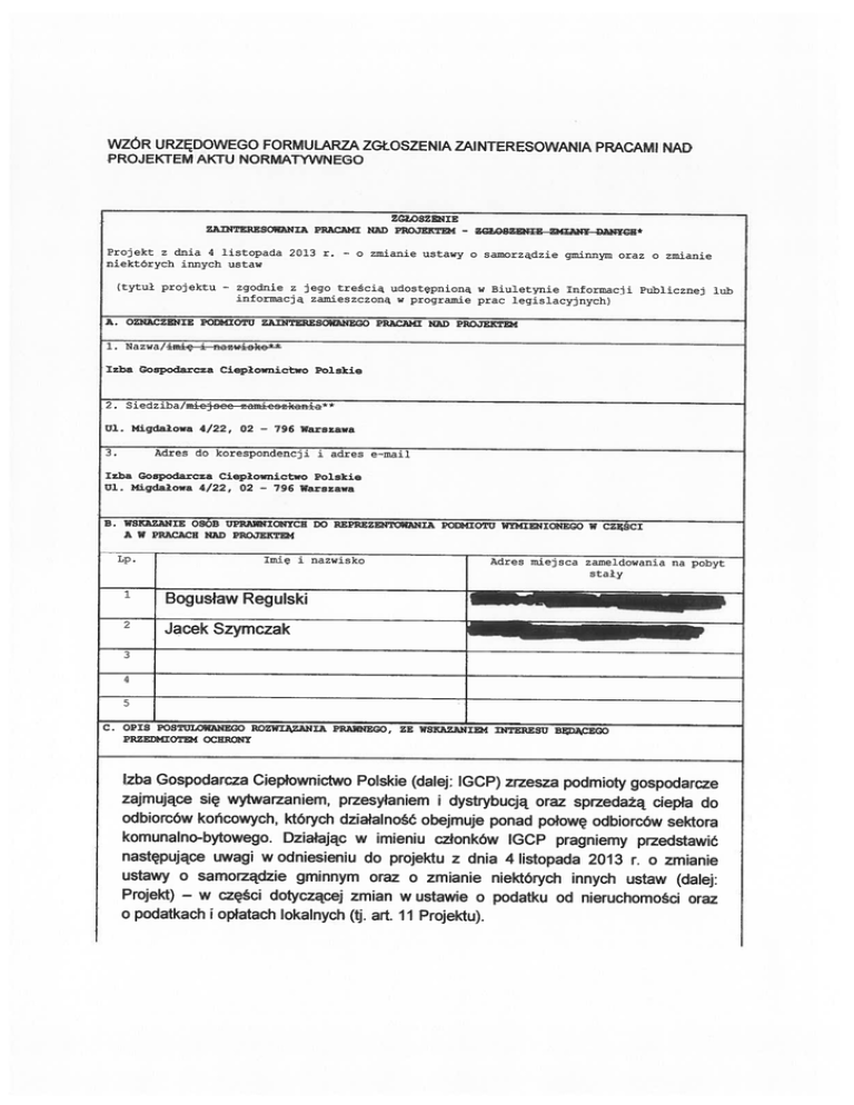 WZÓR URZĘDOWEGO FORMULARZA ZGŁOSZENIA ZAINTERESOWANIA PRACAMI NAD PROJEKTEM AKTU NORMATYWNEGO ZGŁOSZENIE ZAINTERESO1NIA PRACAMI NAJ) PROJEKTEM Projekt z dnia 4 listopada 2013 r. niektórych innych ustaw (tytuł projektu — — - ZCOSZENIE ZMIANY DANYCH* o zmianie ustawy o samorządzie gminnym oraz o zmianie zgodnie z jego treścią udostępnioną w Biuletynie Informacji Publicznej lub informacją zamieszczoną w programie prac legislacyjnych) A. OZNACZENIE PODMIOTU ZAINTERESOWANEGO PRACAMI NAD PROJEKTEM 1. Nazwa/imię i n2zwioko Izba Gospodarcza Ciepłownictwo Polskie 2. Siedziba/micjocc zamic3zkaniO** Ul. Migdałowa 4/22, 02 3. — 796 Warszawa Adres do korespondencji i adres e—mail Izba Gospodarcza Ciepłownictwo Polskie Ul. Migdałowa 4/22, 02 796 Warszawa — B. WSKAZANIE OSÓB UPRAWNIONYCB DO REPREZENTOWANIA PODMIOTU WYMIENIONEGO W CZĘŚCI A W PRACACH NAD PROJEKTEM Lp. 1 2 linię i nazwisko - Adres miejsca zameldowania na pobyt stały Bogusław Regulski Jacek Szymczak 3 4 5 C. OPIS POSTULOWANEGO ROZWIĄZANIA PRAWNEGO, ZE WSKAZANIEM INTERESU BĘDĄCEGO PRZEDMIOTEM OCHRONY izba Gospodarcza Ciepłownictwo Polskie (dalej: IGCP) zrzesza podmioty gospodarcze zajmujące się wytwarzaniem, przesyłaniem i dystrybucją oraz sprzedażą ciepła do odbiorców końcowych, których działalność obejmuje ponad połowę odbiorców sektora komunalno-bytowego. Działając w imieniu członków IGCP pragniemy przedstawić następujące uwagi w odniesieniu do projektu z dnia 4 listopada 2013 r. o zmianie ustawy o samorządzie gminnym oraz o zmianie niektórych innych ustaw (dalej: Projekt) w części dotyczącej zmian w ustawie o podatku od nieruchomości oraz o podatkach i opłatach lokalnych (tj. art. 11 Projektu). — I. Uwagi o charakterze ogólnym Jak rozumiemy, proponowane zmiany w ustawie z dnia 12 stycznia 1991 r. o podatkach i opłatach lokalnych (Dz.U. z 2010 r. Nr 95, poz. 613, z późn. zm., dalej: ustawa o podatkach i opłatach lokalnych) mają na celu doprecyzowanie zakresu opodatkowania podatkiem od nieruchomości, w szczególności jeżeli chodzi o budowle zajęte na prowadzenie działalności gospodarczej. Projekt stanowi więc realizację wytycznych zawartych w wyroku Trybunału Konstytucyjnego o sygn. P 33/09 z 13 września 2011 r., w którym Trybunał wskazywał na brak wystarczającej precyzji dotychczasowej definicji. W ocenie Izby, aby zrealizować te założenia, projekt wymaga dalszego dopracowania, albowiem w aktualnym kształcie projektowane przepisy nie w pełni realizują powyższe cele i zawierają kilka istotnych niejasności, które w przyszłości będą mogłyby powodować spory z organami administracji samorządowej. Poniżej przedstawiamy szczegółowe uwagi do proponowanych rozwiązań. II. Uwagi szczegółowe 1. Projektowana definicja budowli W zmienianym art. la ust. I pkt 2, definicja budowli podlegającej opodatkowaniu formułowana jest w oparciu o klasyfikację, będącą odpowiednikiem Grupy 2 Klasyfikacji Środków Trwałych wprowadzonej w rozporządzeniu Rady Ministrów w sprawie Klasyfikacji Środków Trwałych (KŚT) z dnia 10 grudnia 2010 r. (Dz.U. Nr 242, poz. 1622), którą obecnie podatnicy stosują dla celów podatków dochodowych. Takie rozwiązanie wydaje się trafne z uwagi na dosyć dużą szczegółowość klasyfikacji i utrwaloną w tym zakresie praktykę. Za powyższym rozwiązaniem przemawiają również względy systemowe. Zgodnie z art. 4 ust. 1 pkt 3 ustawy o podatkach i opłatach lokalnych, podstawa opodatkowania budowli podatkiem od nieruchomości jest bowiem już teraz określana w oparciu o wartość początkową środków trwałych, zawartą księgach podatnika, zatem wydaje się zasadnym, aby w oparciu o zapisy w księgach ustalać również przedmiot opodatkowania. Aby projektowana definicja spełniła stawiane przed dokonanie pewnych zmian. nią cele, konieczne jest jednak a) Doprecyzowanie związku przedmiotu opodatkowania podatkiem od niewchomości z zapisami w księqach podatkowych Przede wszystkim, naszym zdaniem należałoby jednoznacznie wskazać, że klasyfikacja danego obiektu dokonana przez podatnika w jego księgach dla celów podatków dochodowych jest wiążąca również dla celów podatku od nieruchomości. Proponowane zmiany wyeliminują ryzyko niepożądanych rozbieżności w interpretacji zapisów KŚT dla celów podatku dochodowego i dla celów podatku od nieruchomości. b) Rozgraniczenie definicii budowli i budynku Po drugie, dla rozstrzygnięcia potencjalnych wątpliwości proponujemy uzupełnienie pierwszej części definicji o słowa „Nie będący budynkiem (...)„ co pozwoliłoby na wyraźne rozgraniczenie ew. spornych przypadków obiektów, które spełniając cechy definicji budynku mogłyby jednocześnie być wymienione w wykazie stanowiącym załącznik nr I do ustawy. c) Urzpdzenia budowlane W projektowanym art. la ust. 1 pkt 2 wskazuje się, że budowle podlegające opodatkowaniu stanowią również urządzenia budowlane w rozumieniu prawa budowlanego, tj. przyłącza, urządzenia instalacyjne itp. Powyższa definicja jest wadliwa ze względów legislacyjnych. Wyliczenie powyższych obiektów jest już zawarte w art. 3 pkt 9 ustawy Prawo budowlane z dnia 7 lipca 1994 r. (Dz.U. z 2013 r. poz. 1409, z późn. zm. dalej: Prawo budowlane) zawierającym definicję urządzenia budowlanego. Ponadto zakres obu wyliczeń nie jest tożsamy, co automatycznie wywołuje wątpliwości interpretacyjne. Dlatego też, proponujemy usunięcie z tego elementu definicji, odwołania do Prawa budowlanego i pozostawienie jedynie katalogu obiektów, stanowiących urządzenia budowlane. 2. Projektowana definicja budynku W naszej ocenie, konieczne jest doprecyzowanie definicji poprzez wskazanie, że przedmiot opodatkowania stanowi budynek wraz z instalacjami i urządzeniami. W myśl art. 3 ust. 1 lit. a) Prawa budowlanego to właśnie tak zdefiniowany budynek stanowi obiekt budowlany, przez co stanowi on przedmiot opo