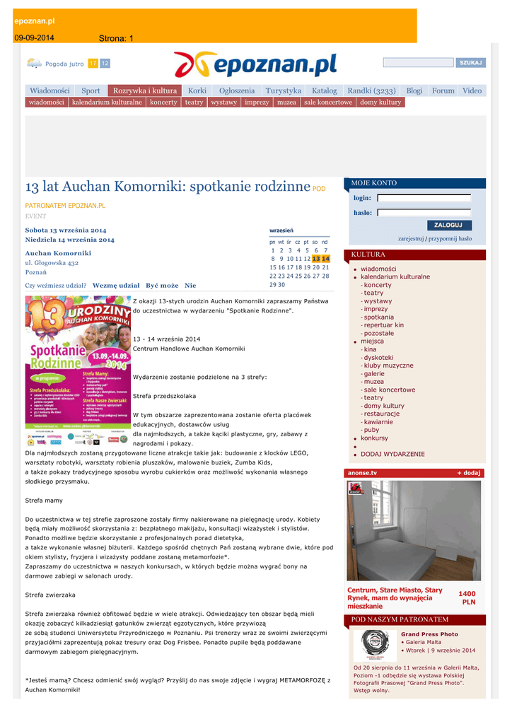 epoznan.pl 09-09-2014 Strona: 1 Pogoda jutro 17 12 Wiadomości wiadomości Sport Rozrywka i kultura kalendarium kulturalne koncerty Korki teatry Ogłoszenia wystawy Turystyka imprezy muzea Katalog Randki (3233) sale koncertowe 13 lat Auchan Komorniki: spotkanie rodzinne POD Blogi Forum Video domy kultury MOJE KONTO login: PATRONATEM EPOZNAN.PL hasło: EVENT Sobota 13 września 2014 wrzesień Niedziela 14 września 2014 pn wt śr cz pt so nd 1 2 3 4 5 6 7 8 9 10 11 12 13 14 Auchan Komorniki ul. Głogowska 432 Poznań 15 16 17 18 19 20 21 22 23 24 25 26 27 28 Czy weźmiesz udział? Wezmę udział Być może Nie 29 30 Z okazji 13-stych urodzin Auchan Komorniki zapraszamy Państwa do uczestnictwa w wydarzeniu "Spotkanie Rodzinne". 13 - 14 września 2014 Centrum Handlowe Auchan Komorniki Wydarzenie zostanie podzielone na 3 strefy: Strefa przedszkolaka W tym obszarze zaprezentowana zostanie oferta placówek edukacyjnych, dostawców usług dla najmłodszych, a także kąciki plastyczne, gry, zabawy z nagrodami i pokazy. Dla najmłodszych zostaną przygotowane liczne atrakcje takie jak: budowanie z klocków LEGO, zarejestruj / przypomnij hasło KULTURA wiadomości kalendarium kulturalne - koncerty - teatry - wystawy - imprezy - spotkania - repertuar kin - pozostałe miejsca - kina - dyskoteki - kluby muzyczne - galerie - muzea - sale koncertowe - teatry - domy kultury - restauracje - kawiarnie - puby konkursy DODAJ WYDARZENIE warsztaty robotyki, warsztaty robienia pluszaków, malowanie buziek, Zumba Kids, a także pokazy tradycyjnego sposobu wyrobu cukierków oraz możliwość wykonania własnego anonse.tv + dodaj Centrum, Stare Miasto, Stary Rynek, mam do wynajęcia mieszkanie 1400 PLN słodkiego przysmaku. Strefa mamy Do uczestnictwa w tej strefie zaproszone zostały firmy nakierowane na pielęgnację urody. Kobiety będą miały możliwość skorzystania z: bezpłatnego makijażu, konsultacji wizażystek i stylistów. Ponadto możliwe będzie skorzystanie z profesjonalnych porad dietetyka, a także wykonanie własnej biżuterii. Każdego spośród chętnych Pań zostaną wybrane dwie, które pod okiem stylisty, fryzjera i wizażysty poddane zostaną metamorfozie*. Zapraszamy do uczestnictwa w naszych konkursach, w których będzie można wygrać bony na darmowe zabiegi w salonach urody. Strefa zwierzaka Strefa zwierzaka również obfitować będzie w wiele atrakcji. Odwiedzający ten obszar będą mieli okazję zobaczyć kilkadziesiąt gatunków zwierząt egzotycznych, które przywiozą POD NASZYM PATRONATEM ze sobą studenci Uniwersytetu Przyrodniczego w Poznaniu. Psi trenerzy wraz ze swoimi zwierzęcymi Grand Press Photo przyjaciółmi zaprezentują pokaz tresury oraz Dog Frisbee. Ponadto pupile będą poddawane • Galeria Malta darmowym zabiegom pielęgnacyjnym. • Wtorek | 9 wrześnie 2014 *Jesteś mamą? Chcesz odmienić swój wygląd? Przyślij do nas swoje zdjęcie i wygraj METAMORFOZĘ z Auchan Komorniki! Od 20 sierpnia do 11 września w Galerii Malta, Poziom -1 odbędzie się wystawa Polskiej Fotografii Prasowej "Grand Press Photo". Wstęp wolny. epoznan.pl 09-09-2014 Strona: 2 Biskupin - miejsce Zasady są proste: magiczne • Muzeum Archeologiczne Przyślij na adres [email protected] swoje aktualne zdjęcie wraz z imieniem i • Wtorek | 9 wrześnie 2014 Autorską ekspozycję fotografii Marka Skubisza, ukazującą inne oblicze najbardziej znanej pradziejowej osady obronnej w Polsce będzie można obejrzeć od 1 do 26 września w Muzeum Archeologicznym w Poznaniu. Wystawa wpisuje się w szereg imprez kulturalnych związanych z obchodami "Roku Józefa Kostrzewskiego". nazwiskiem. W komentarzu uzasadnij, dlaczego chcesz zmienić swój wygląd. Uwaga, w konkursie biorą udział tylko mamy. Wiek nie gra roli! Na Wasze maile i komentarze czekamy do 12 września 2014 r. do godziny 17:00. Spośród nich, jury wybierze trzy najciekawsze zgłoszenia. Mesajah • Strefa Kultury Werdykt ogłosimy o godzinie 19:00 i od razu poinformujemy o tym zwycięzców. • Wtorek | 9 wrześnie 2014 | 20.00 W kolejnym etapie wybrane Panie (dwie z nich w sobotę i dwie w niedzielę) pod okiem stylisty, fryzjera i wizażysty przejdą metamorfozę, dzięki której będą mogły spełnić swoje marzenia i poprzez swój nowy wygląd podkreślić swoje naturalne piękno. • zobacz więcej informacji o Auchan Komorniki • Zapisz się do naszego newslettera - najświeższe wydarzenia codziennie na Twój e-mail The September Concert Poland • Środa | 10 wrześnie 2014 WASZE KOMENTARZE DODAJ KOMENTARZ 9 września o godzinie 20.00 w Strefie Kultury, nowym miejscu na kulturalnej mapie Poznania, odbędzie się koncert Mesajah. Zapraszamy! | Jesteś niezalogowany, Twój nick będzie poprzedzony ~ zaloguj | zarejestruj Autor Treść Po raz czwarty już Poznań, jako jedyne miasto Polski, dołącza do międzynarodowych obchodów festiwalu The September Concert, manifestującego poprzez sztukę pokój i humanitaryzm. Koncerty od 10 do 28 września - program można znaleźć na stronie epoznan.pl. Artur Rojek Liczba znaków do wykorzystania: 1000 Nie jesteś anonimowy, Twoje IP zapisujemy w naszej bazie danych. Dodając komentarz akceptujesz Regulamin Forum Kod z obrazka • Strefa Kultury • Środa | 10 wrześnie 2014 | 20.00 10 września o godzinie 20.00 w Strefie Kultury, nowym miejscu na kulturalnej mapie Poznania, odbędzie się koncert Artura Rojka. Zapraszamy! Formacja Chatelet • Strefa Kultury • Czwartek | 11 wrześnie 2014 W każdy wrześniowy czwartek na STREFIE KULTURY w ramach STREFA SIĘ BAWI! wystąpią artyści polskiej czołówki sceny kabaretowej. 11 września o 21.00 na scenie zaprezentuje się m.in. Formacja Chatelet. Kabaret Nowaki • Strefa Kultury • Czwartek | 11 wrześnie 2014 | 20.00 W każdy wrześniowy czwartek na STREFIE KULTURY w ramach STREFA SIĘ BAWI! wystąpią artyści polskiej czołówki sceny kabaretowej. 11 września o godzinie 20.00 w Strefie Kultury, nowym miejscu na kultur