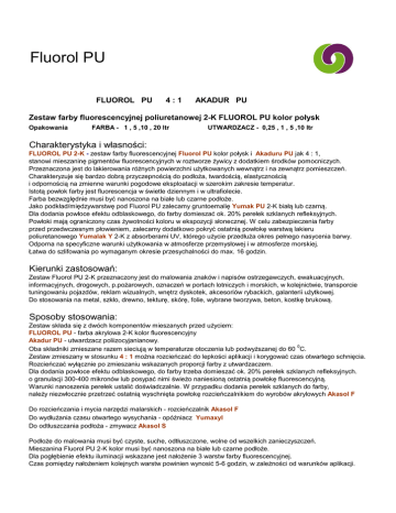 Fluorol PU FLUOROL PU 4:1 AKADUR PU Zestaw farby fluorescencyjnej poliuretanowej 2-K FLUOROL PU kolor połysk Opakowania FARBA - 1 , 5 ,10 , 20 ltr UTWARDZACZ - 0,25 , 1 , 5 ,10 ltr Charakterystyka i własności: FLUOROL PU 2-K - zestaw farby fluorescencyjnej Fluorol PU kolor połysk i Akaduru PU jak 4 : 1, stanowi mieszaninę pigmentów fluorescencyjnych w roztworze żywicy z dodatkiem środków pomocniczych. Przeznaczona jest do lakierowania różnych powierzchni użytkowanych wewnątrz i na zewnątrz pomieszczeń. Charakteryzuje się bardzo dobrą przyczepnością do podłoża, twardością, elastycznością i odpornością na zmienne warunki pogodowe eksploatacji w szerokim zakresie temperatur. Istotą powłok farby jest fluorescencja w świetle dziennym i w ultrafiolecie. Farba bezwzględnie musi być nanoszona na białe lub czarne podłoże. Jako podkład/międzywarstwę pod Fluorol PU zalecamy gruntoemalię Yumak PU 2-K białą lub czarną. Dla dodania powłoce efektu odblaskowego, do farby domieszać ok. 20% perełek szklanych refleksyjnych. Powłoki mają ograniczony czas żywotności koloru w ekspozycji słonecznej. W celu zabezpieczenia farby przed przedwczesnym płowieniem, zalecamy dodatkowo pokryć ostatnią powłokę warstwą lakieru poliuretanowego Yumalak Y 2-K z absorberami UV, którego użycie przedłuża okres pełnego nasycenia barwy. Odporna na specyficzne warunki użytkowania w atmosferze przemysłowej i w atmosferze morskiej. Łatwa do szlifowania po wymaganym okresie przesychalności do max. 16 godzin. Kierunki zastosowań: Zestaw Fluorol PU 2-K przeznaczony jest do malowania znaków i napisów ostrzegawczych, ewakuacyjnych, informacyjnych, drogowych, p.pożarowych, oznaczeń w portach lotniczych i morskich, w kolejnictwie, transporcie tuningowaniu pojazdów, reklam wizualnych, wnętrz dyskotek, akcesoriów rybackich, galanterii użytkowej. Do stosowania na metal, szkło, drewno, tekturę, skórę, folie, wybrane tworzywa, beton, kostkę brukową. Sposoby stosowania: Zestaw składa się z dwóch komponentów mieszanych przed użyciem: FLUOROL PU - farba akrylowa 2-K kolor fluorescencyjny Akadur PU - utwardzacz poliizocyjanianowy. Oba składniki zmieszane razem sieciują w temperaturze otoczenia lub podwyższanej do 60 0C. Zestaw zmieszany w stosunku 4 : 1 można rozcieńczać do lepkości aplikacji i korygować czas otwartego schnięcia. Rozcieńczać wyłącznie po zmieszaniu wskazanych proporcji farby z utwardzaczem. Dla dodania powłoce efektu odblaskowego, do farby trzeba domieszać ok. 20% perełek szklanych refleksyjnych. o granulacji 300-400 mikronów lub posypać nimi świeżo naniesioną ostatnią powłokę fluorescencyjną. Warunki nanoszenia perełek ustalić doświadczalnie. W przypadku dodania perełek szklanych do farby, należy niezwłocznie przetrzeć ostatnią wyschnięta powłokę rozcieńczalnikiem do wyrobów akrylowych Akasol F Do rozcieńczania i mycia narzędzi malarskich - rozcieńczalnik Akasol F Do wydłużania czasu otwartego wysychania - opóźniacz Yumaxyl Do odtłuszczania podłoża - zmywacz Akasol S Podłoże do malowania musi być czyste, suche, odtłuszczone, wolne od wszelkich zanieczyszczeń. Mieszanina Fluorol PU 2-K kolor musi być nanoszona na białe lub czarne podłoże. Dla pogłębienie efektu iluminacji wskazane jest nałożenie 3 warstw farby fluorescencyjnej. Czas pomiędzy nałożeniem kolejnych warstw powinien wynosić 5-6 godzin, w zależności od warunków aplikacji. Technika malarska dowolna: pędzel, wałek malarski, pistolety natryskowe, polewanie, zanurzenie, tamponowanie Parametry zestawu 2-K : Lepkość wg kubka Forda 4 Schnięcie 10 Schnięcie 30 zalecana grubość powłoki zalecana ilość warstw Fluorol PU : Akadur PU min. 120 s max 60 min. max 3 godz min. 80 µm min 2 wagowo i objętościowo Gęstość sucha masa czas życia mieszanki temperatura zapłonu Rozcieńczalnik akrylowy min 1,00 g/cm3 min 60% wag. 4-6 godz. min 26 0C Akasol F Szybkość utwardzania się zestawu farby zależy od temperatury i wilgotności powietrza: wyższa temperatura i większa wilgotność względna powietrza to krótszy czas utwardzania i wysychania. Dogrzewanie powłok w podwyższonej temperaturze do max. 600C skraca czasy wysychania i utwardzania farby ale wymagana jest uprzednia aklimatyzacja min. 20 min w temperaturze otoczenia. W przypadku stosowania szlifu międzywarstwowego, międzyczas powinien wynosić 16 godz, a przy dogrzewaniu powłok 8 godz. Wydajność: 10-12 m2/ltr na 1 warstwę Gwarancja: 12 miesięcy od daty produkcji Zalecenia bhp i p.poż. Przechowywać w szczelnie zamkniętych opakowaniach w suchym chłodnym miejscu. Podczas prac lakierniczych nie jeść, nie pić, nie palić - farba i utwardzacz są łatwopalne Utwardzacz wrażliwy na wilgoć - chronić przed przechowywaniem w nieszczelnych opakowaniach. Szczegółowe zalecenia bhp i p.poż na etykietach wyrobów. YUMACOM Zbigniew Kreczko jest gwarantem właściwej jakości produktu, pozostaje jednak bez wpływu na sposób i warunki jego stosowania. Informacje zawarte w karcie mają na celu zapewnienie optymalnego wykorzystania produktu, jednak nie są podstawą do odpowiedzialności prawnej producenta, gdyż warunki wykonawstwa pozostają poza jego kontrolą. Wszelka ingerencja w skład produktu jest niedopuszczalna i może w znaczny sposób obniżyć jakość produktu. W przypadku połączenia z wyrobami z innych firm producent nie ponosi żadnej odpowiedzialności za powstałe wady i szkody. Przedstawione powyżej informacje podane zostały w dobrej wierze, wg aktualnego stanu naszej wiedzy i doświadczenia praktycznego. Yumacom zastrzega sobie prawo do zmiany treści w kolejnych edycjach karty technicznej bez wcześniejszego informowania o tym fakcie odbiorców. Producent zastrzega sobie również pełne prawo do modyfikacji swoich produktów w ramach ich rozwoju technologicznego. Producent specjalistycznych farb i lakierów: YUMACOM Zbigniew Kreczko 