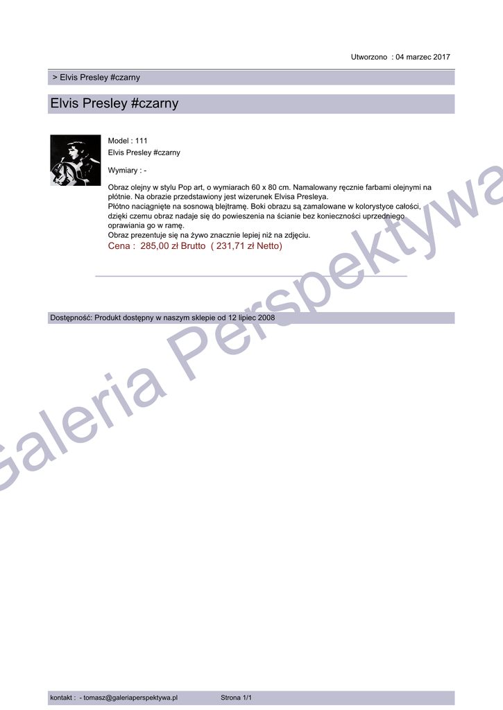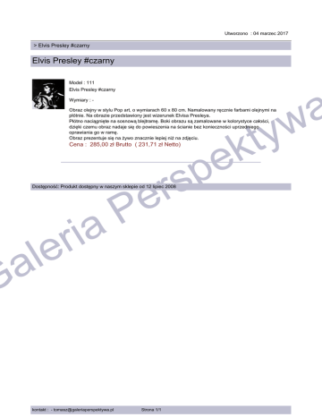 Utworzono : 04 marzec 2017 > Elvis Presley #czarny Elvis Presley #czarny Model : 111 Elvis Presley #czarny a w ty Wymiary : - Obraz olejny w stylu Pop art, o wymiarach 60 x 80 cm. Namalowany ręcznie farbami olejnymi na płótnie. Na obrazie przedstawiony jest wizerunek Elvisa Presleya. Płótno naciągnięte na sosnową blejtramę. Boki obrazu są zamalowane w kolorystyce całości, dzięki czemu obraz nadaje się do powieszenia na ścianie bez konieczności uprzedniego oprawiania go w ramę. Obraz prezentuje się na żywo znacznie lepiej niż na zdjęciu. k e Cena : 285,00 zł Brutto ( 231,71 zł Netto) p rs e P Dostępność: Produkt dostępny w naszym sklepie od 12 lipiec 2008 a i r e l a G kontakt : - [email protected] Strona 1/1