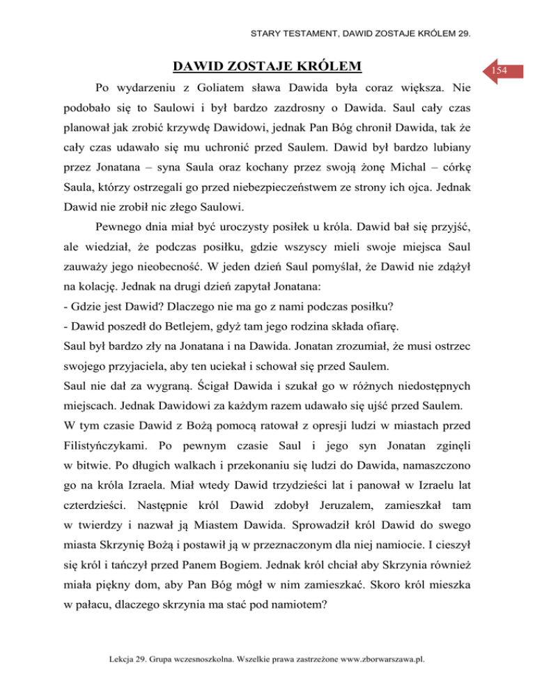 STARY TESTAMENT, DAWID ZOSTAJE KRÓLEM 29. DAWID ZOSTAJE KRÓLEM Po wydarzeniu z Goliatem sława Dawida była coraz większa. Nie podobało się to Saulowi i był bardzo zazdrosny o Dawida. Saul cały czas planował jak zrobić krzywdę Dawidowi, jednak Pan Bóg chronił Dawida, tak że cały czas udawało się mu uchronić przed Saulem. Dawid był bardzo lubiany przez Jonatana – syna Saula oraz kochany przez swoją żonę Michal – córkę Saula, którzy ostrzegali go przed niebezpieczeństwem ze strony ich ojca. Jednak Dawid nie zrobił nic złego Saulowi. Pewnego dnia miał być uroczysty posiłek u króla. Dawid bał się przyjść, ale wiedział, że podczas posiłku, gdzie wszyscy mieli swoje miejsca Saul zauważy jego nieobecność. W jeden dzień Saul pomyślał, że Dawid nie zdążył na kolację. Jednak na drugi dzień zapytał Jonatana: - Gdzie jest Dawid? Dlaczego nie ma go z nami podczas posiłku? - Dawid poszedł do Betlejem, gdyż tam jego rodzina składa ofiarę. Saul był bardzo zły na Jonatana i na Dawida. Jonatan zrozumiał, że musi ostrzec swojego przyjaciela, aby ten uciekał i schował się przed Saulem. Saul nie dał za wygraną. Ścigał Dawida i szukał go w różnych niedostępnych miejscach. Jednak Dawidowi za każdym razem udawało się ujść przed Saulem. W tym czasie Dawid z Bożą pomocą ratował z opresji ludzi w miastach przed Filistyńczykami. Po pewnym czasie Saul i jego syn Jonatan zginęli w bitwie. Po długich walkach i przekonaniu się ludzi do Dawida, namaszczono go na króla Izraela. Miał wtedy Dawid trzydzieści lat i panował w Izraelu lat czterdzieści. Następnie król Dawid zdobył Jeruzalem, zamieszkał tam w twierdzy i nazwał ją Miastem Dawida. Sprowadził król Dawid do swego miasta Skrzynię Bożą i postawił ją w przeznaczonym dla niej namiocie. I cieszył się król i tańczył przed Panem Bogiem. Jednak król chciał aby Skrzynia również miała piękny dom, aby Pan Bóg mógł w nim zamieszkać. Skoro król mieszka w pałacu, dlaczego skrzynia ma stać pod namiotem? Lekcja 29. Grupa wczesnoszkolna. Wszelkie prawa zastrzeżone www.zborwarszawa.pl. 154 STARY TESTAMENT, DAWID ZOSTAJE KRÓLEM 29. Jednak Pan Bóg powiedział przez proroka Natana do Dawida, że to nie on zbuduje mu dom, lecz jeden z jego synów. Król Dawid miał wiele żon i wiele dzieci, zapamiętaj imię jednego z jego synów – Salomona. ZADANIE 1. Król Dawid sprowadził Skrzynię Przymierza do Jeruzalemu. Odszukaj drogę postaci do skrzyni. ZADANIE 2. Prorok to jak pewnie wiesz, taka osoba, która jest w kontakcie z Panem Bogiem. W czasie kiedy Dawid był już królem takim prorokiem był Natan. Zastanów się w jaki sposób Pan Bóg mógł się komunikować z Prorokiem. Może pamiętasz taką sytuację? Spróbuj to opisać lub namalować. Lekcja 29. Grupa wczesnoszkolna. Wszelkie prawa zastrzeżone www.zborwarszawa.pl. 155 STARY TESTAMENT, DAWID ZOSTAJE KRÓLEM 29. ZADANIE 3. Król Dawid zdobył Jeruzalem i w nim zamieszkał. Nazwał swą twierdzę Miastem Dawida. Na zdjęciu poniżej zobaczysz jak mogła wyglądać taka twierdza. Rozbuduj twierdzę i dorysuj do niej coś według swojej wyobraźni . Lekcja 29. Grupa wczesnoszkolna. Wszelkie prawa zastrzeżone www.zborwarszawa.pl. 156 STARY TESTAMENT, DAWID ZOSTAJE KRÓLEM 29. ZADANIE 4. Rozwiąż krzyżówkę. Hasło zapisz na dole strony. 157 Podpowiedzi: 1. Przyjaciel Dawida 2. Namaścił Dawida na króla 3. Państwo którym rządził Dawid 4. Olbrzym filistyński 5. Sprowadzona przez Dawida do Jeruzalemu 6. Skrzynia Boża stała w ...? 7. Miasto, z którego pochodził Dawid 8. Jedna z żona Dawida 9. Jeden z synów Dawida 10. Prorok za czasów królowania Dawida HASŁO: …………………………… to inaczej Jeruzalem. Jest ona stolicą Izraela również w dzisiejszych czasach. Możesz narysować flagę dzisiejszego państwa Izrael i dowiedzieć się jak nazywa się gwiazda pośrodku flagi. Lekcja 29. Grupa wczesnoszkolna. Wszelkie prawa zastrzeżone www.zborwarszawa.pl. STARY TESTAMENT, DAWID ZOSTAJE KRÓLEM 29. ZADANIE 5. Wykonaj kopertę – koronę. Wytnij koronę według wzoru i doklej do niej po bokach pasek. Następnie wytnij zdania i włóż do powstałej koperty te, które są prawdziwe i dotyczą króla Dawida. Nieprawdziwe wyrzuć. Możesz dopisać swoje teksty o królu Dawidzie. Król Dawid panował 40 lat. Dawid przyjaźnił się z Jonatanem. Król Saul był zazdrosny o Dawida. Pan Bóg pomagał Dawidowi. Dawid potrafił grać na harfie. Król Dawid rządził Izraelem. Dawid nazwał miasto na swoją cześć. Król Dawid miał syna Salomona. Król Dawid miał jednego syna. Dawid był synem Iszboszeta. Król Dawid pochodził z Hebronu. Król Dawid miał 3 braci. Dawida na króla namaścił Samuel. Dawid uciekał przed królem Saulem. Lekcja 29. Grupa wczesnoszkolna. Wszelkie prawa zastrzeżone www.zborwarszawa.pl. 158